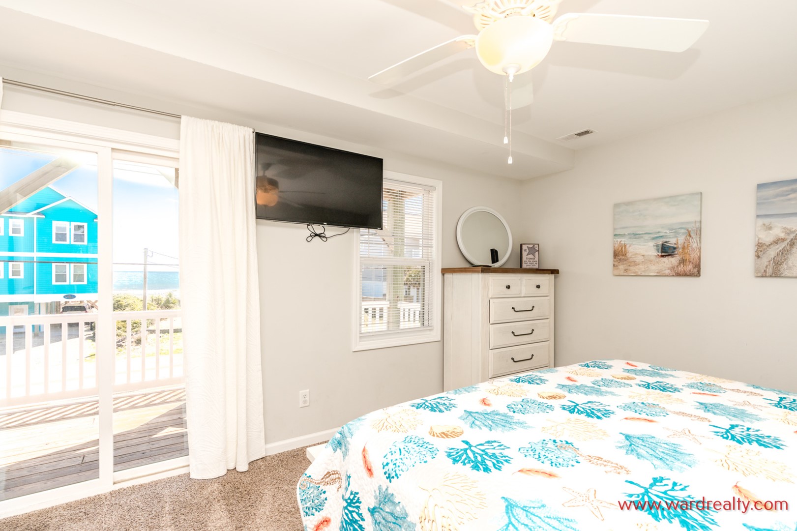 - Oceanview Primary Bedroom: King Bed; TV; en suite bath with shower; access to covered deck