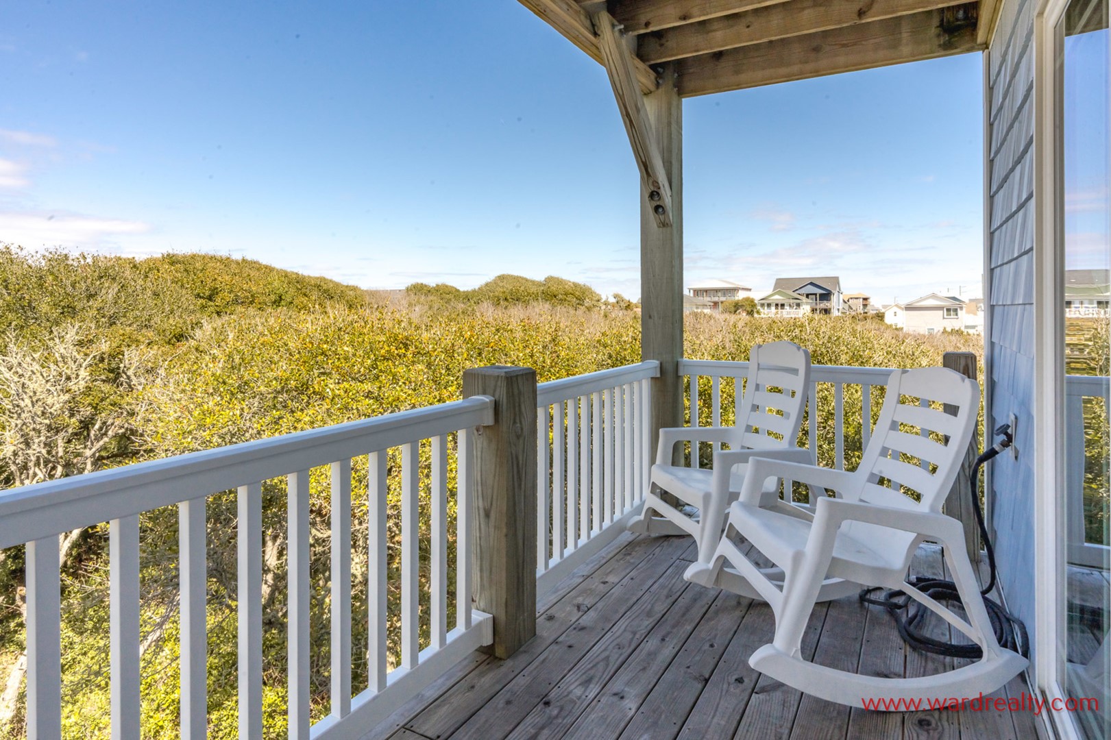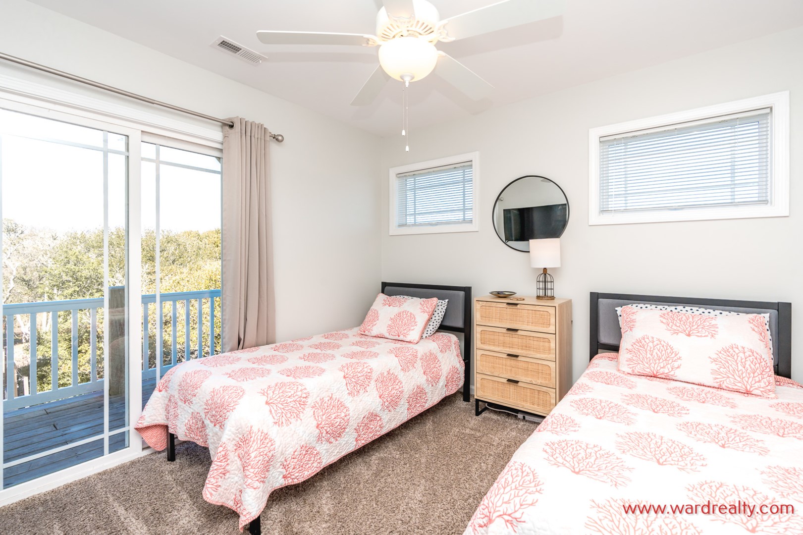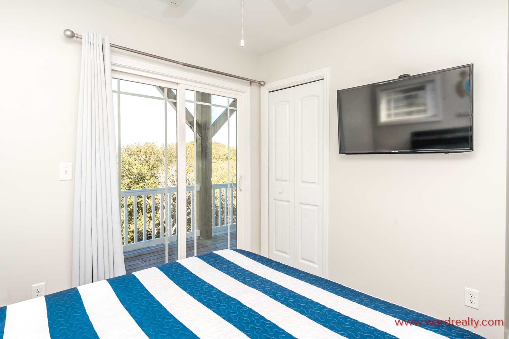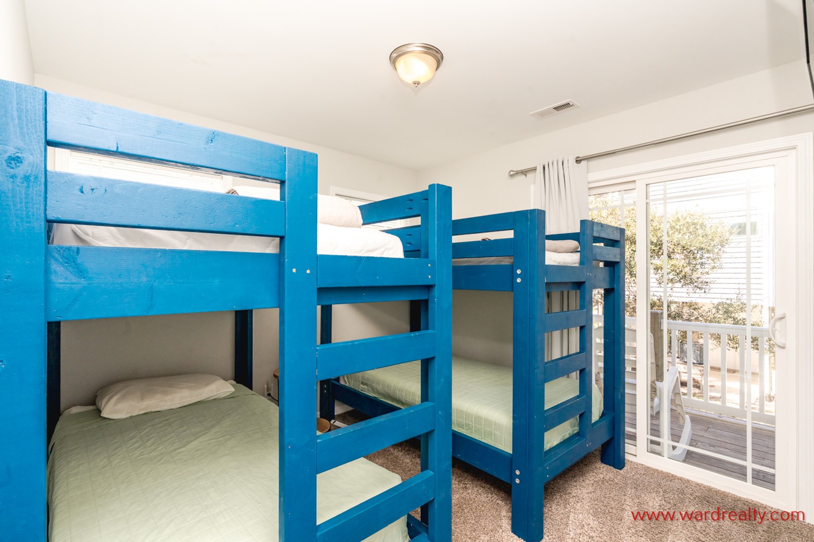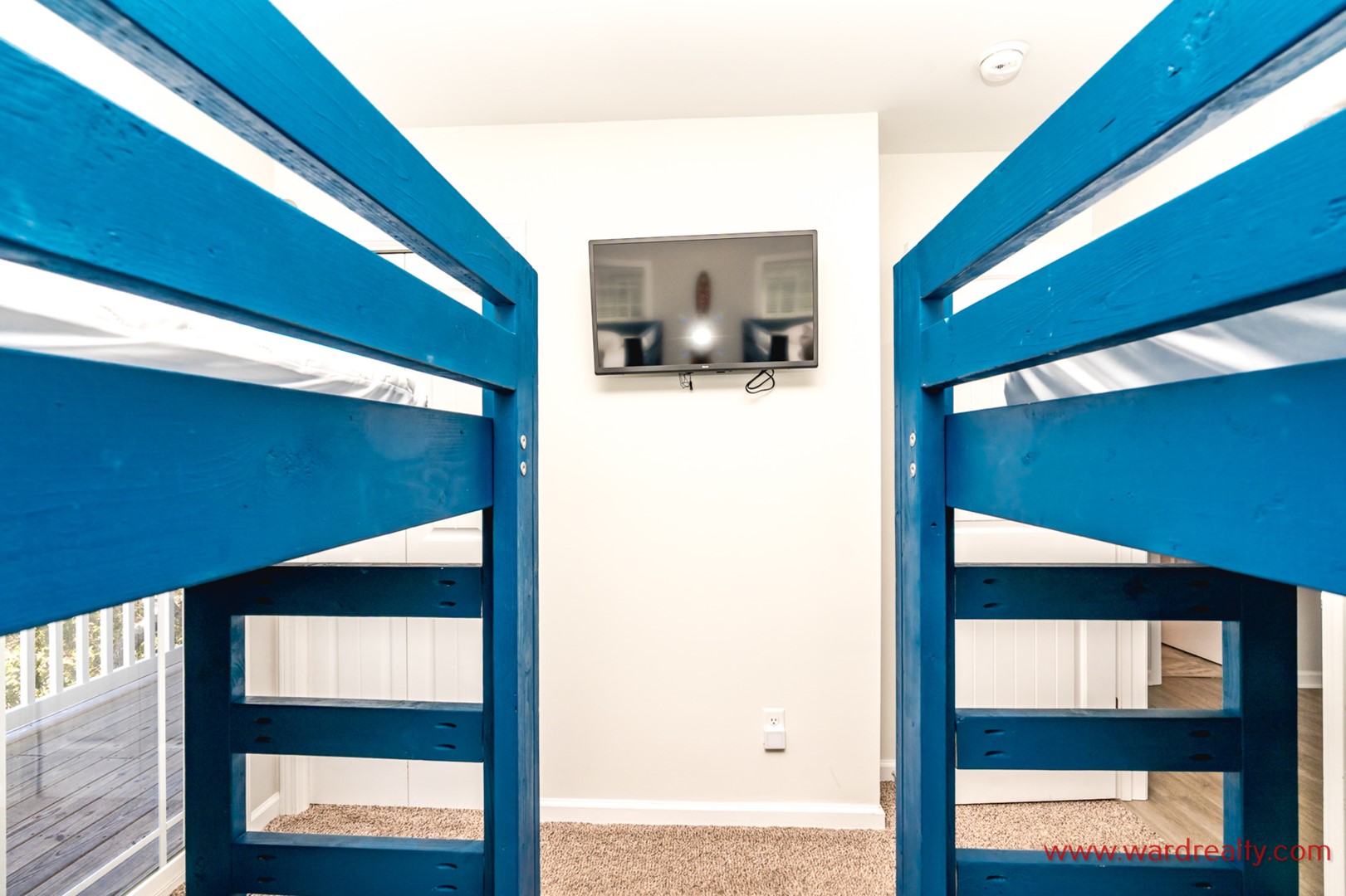 - Back South Bedroom; 2 Twin Bunks; TV; shares hall bath with tub/shower; access to covered deck