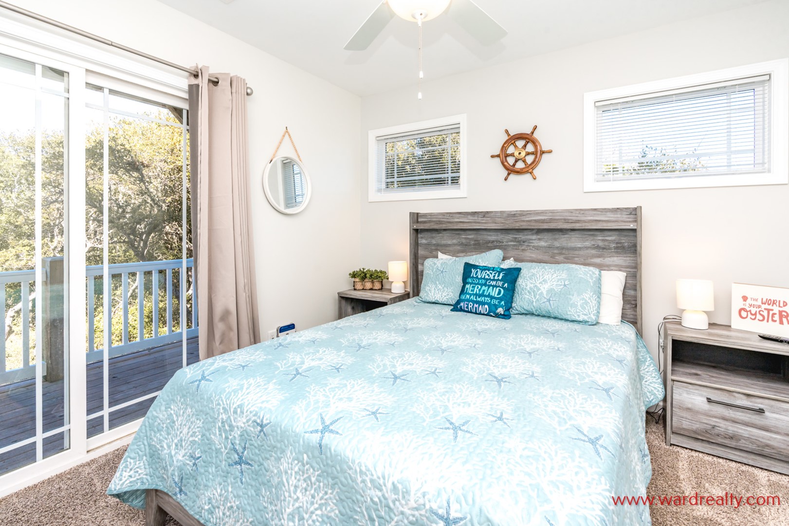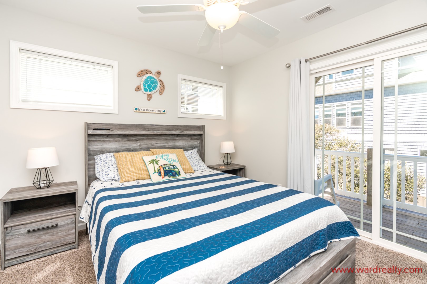 - South Back North Bedroom: Queen Bed; TV; shares hall bath with tub/shower; access to covered deck