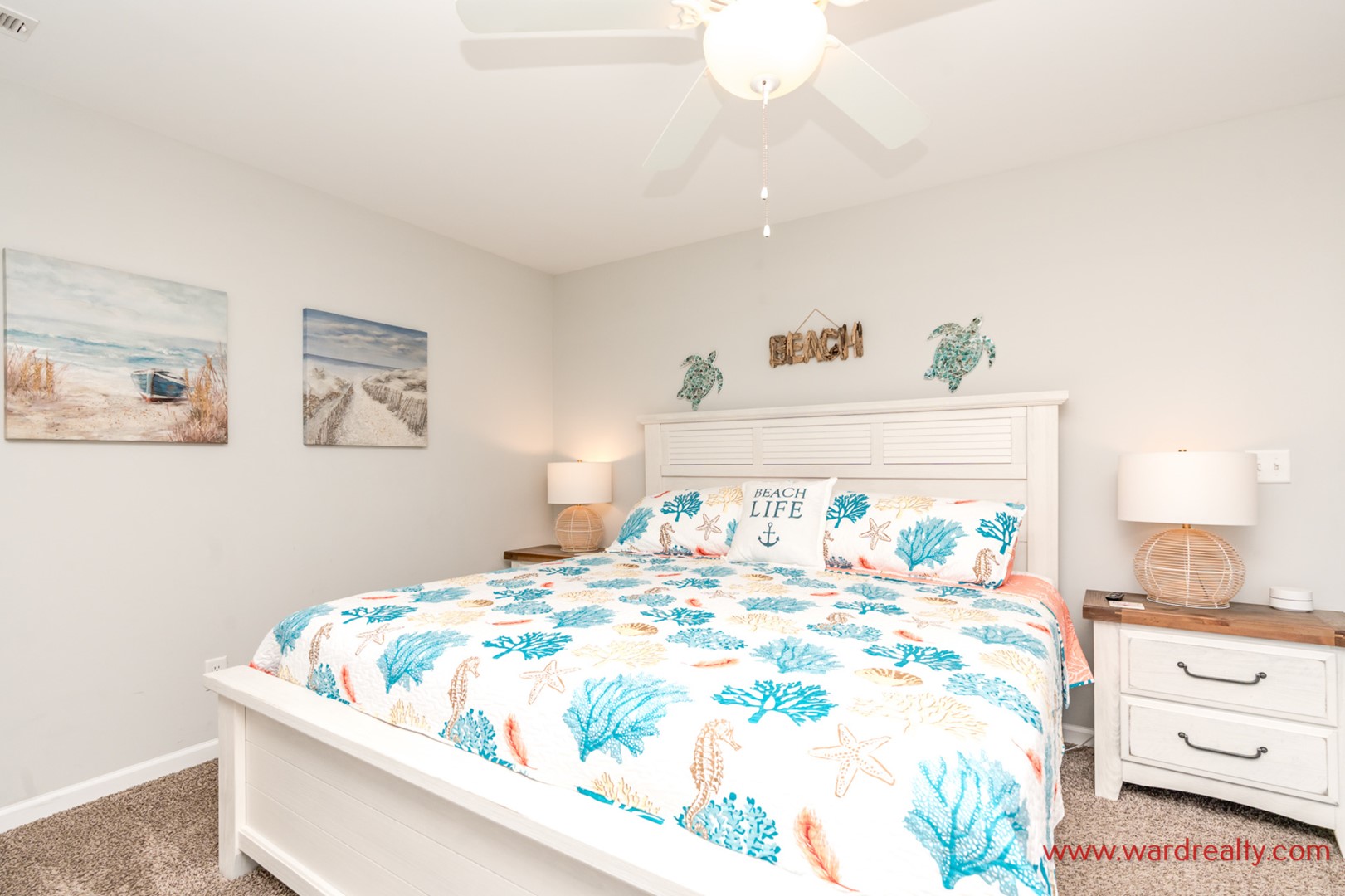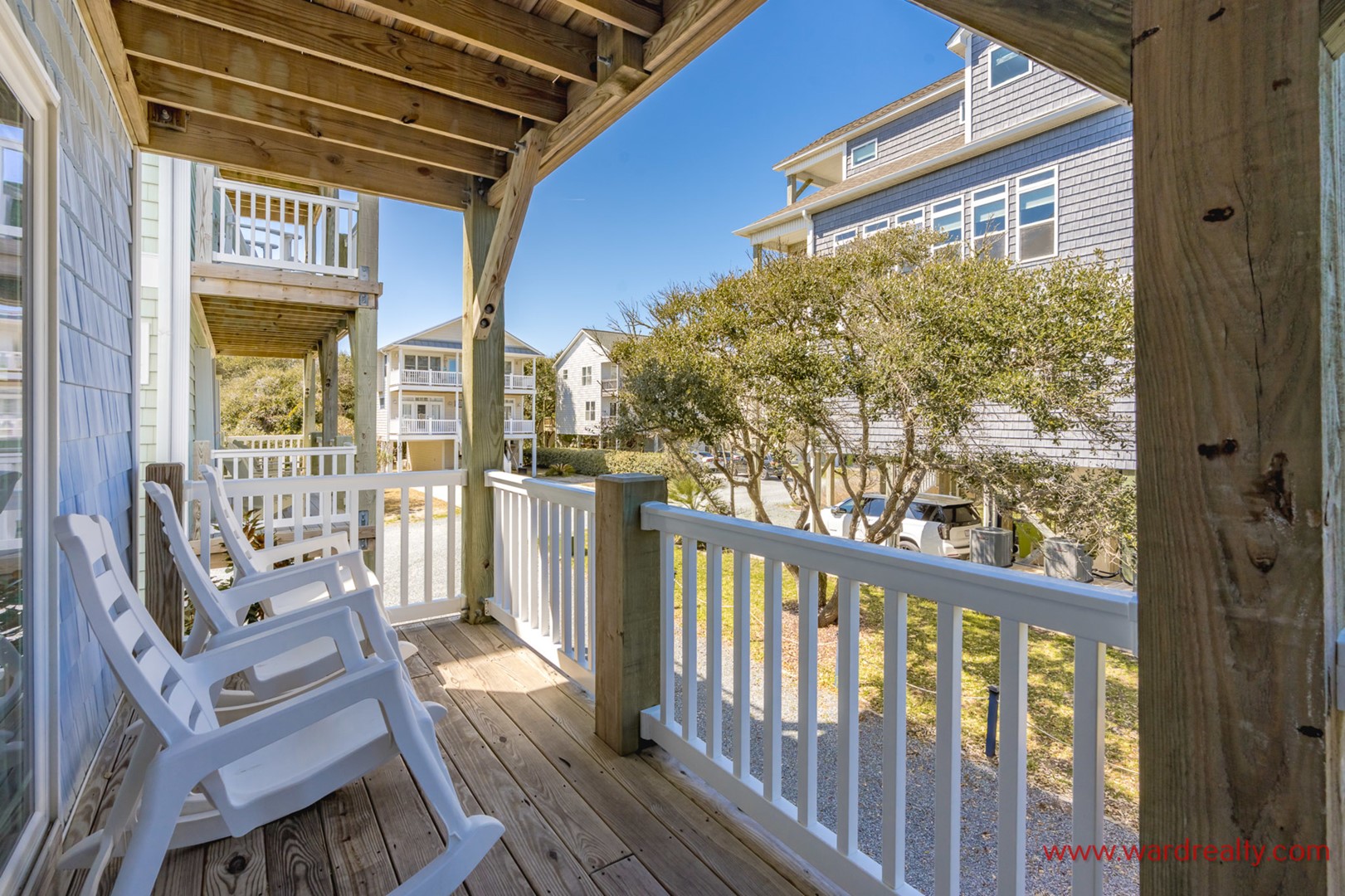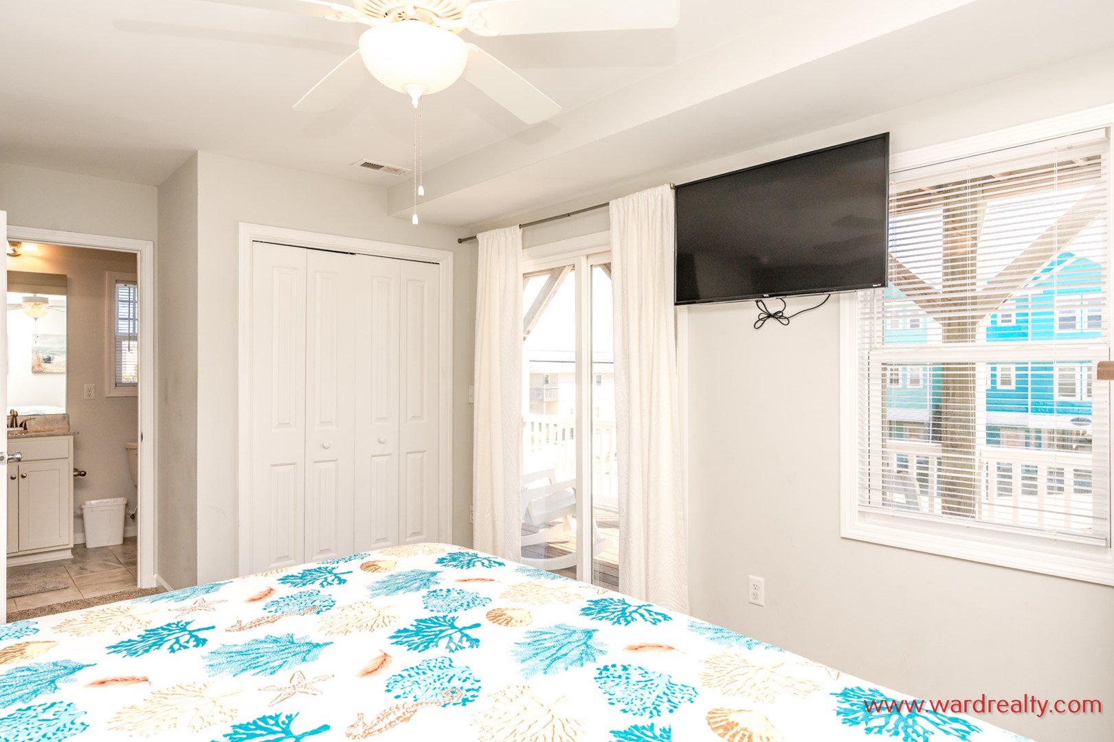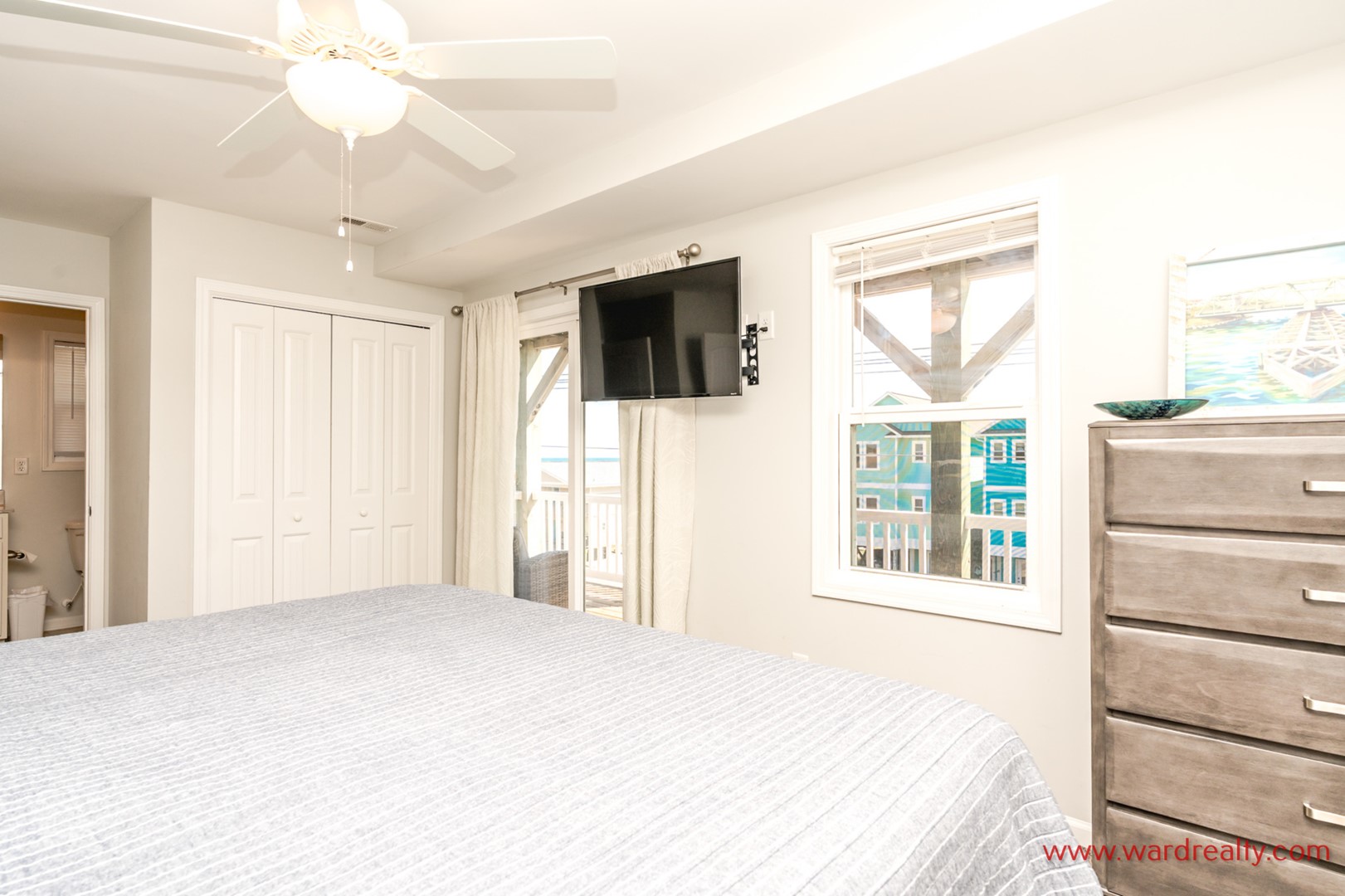 - Back South Bedroom: Queen Bed; TV; shares hall bath with tub/shower; access to covered deck