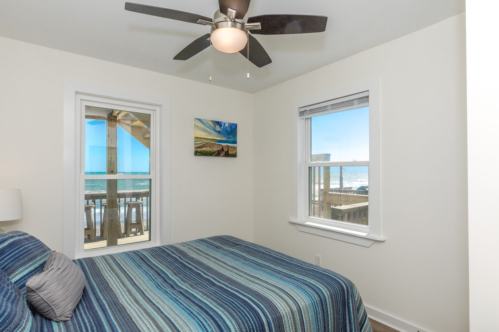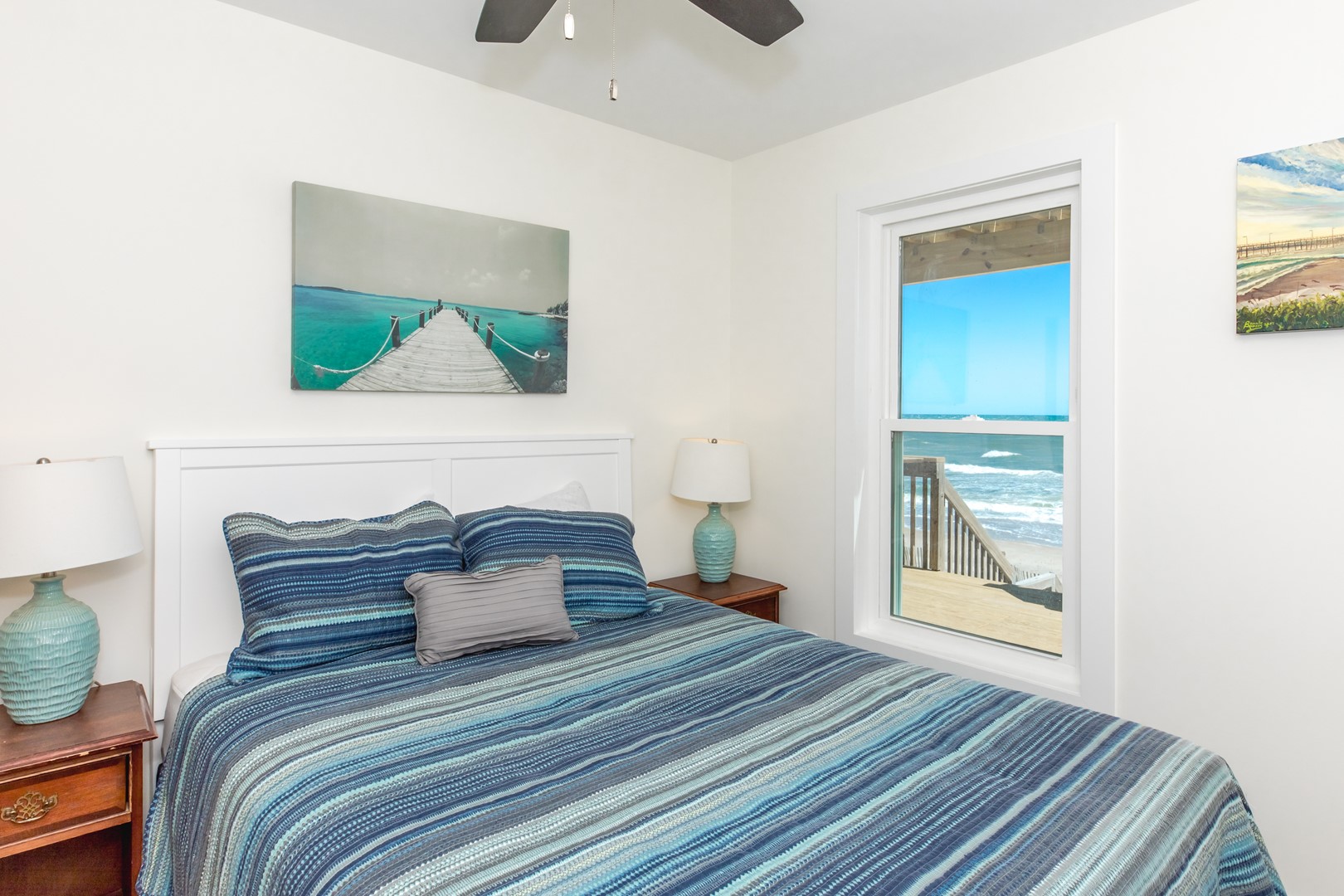 - North Oceanfront Bedroom: Queen Bed; direct access to sun deck; private full bathroom with tub/shower
