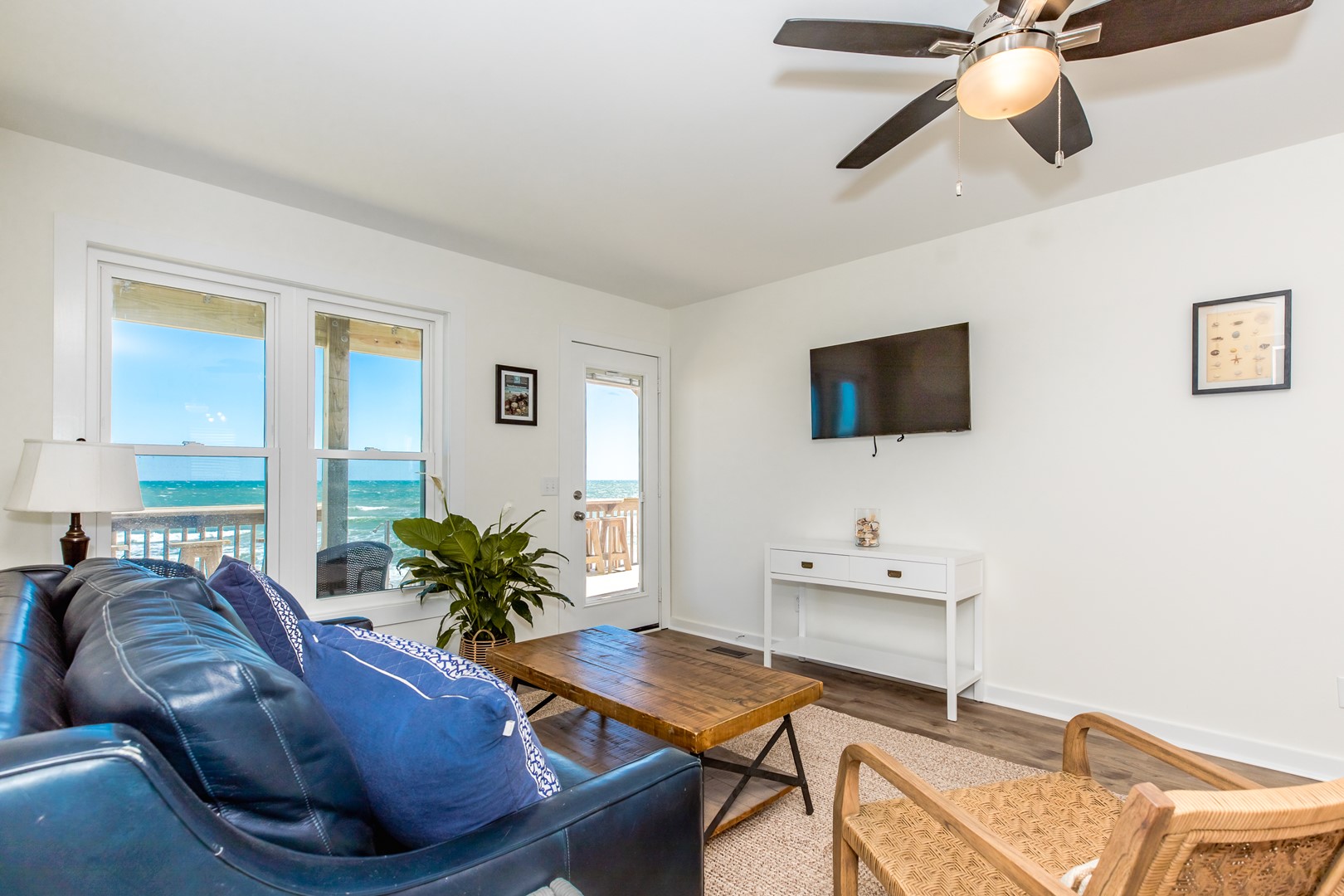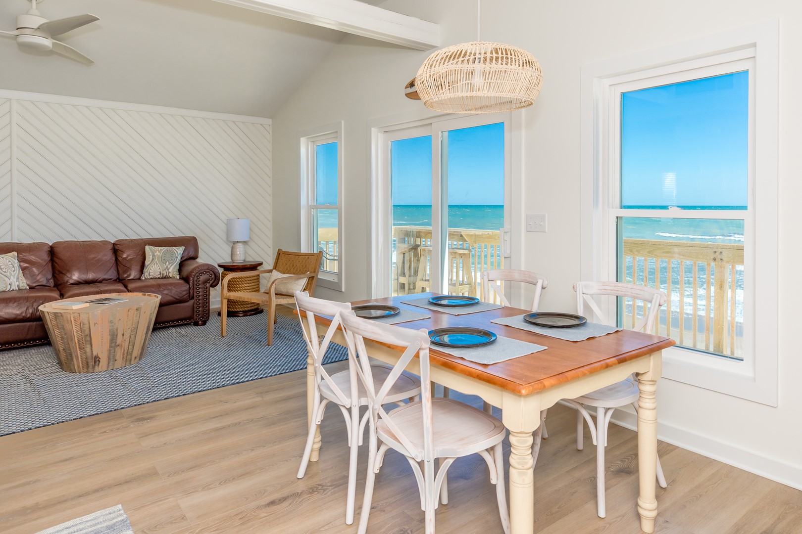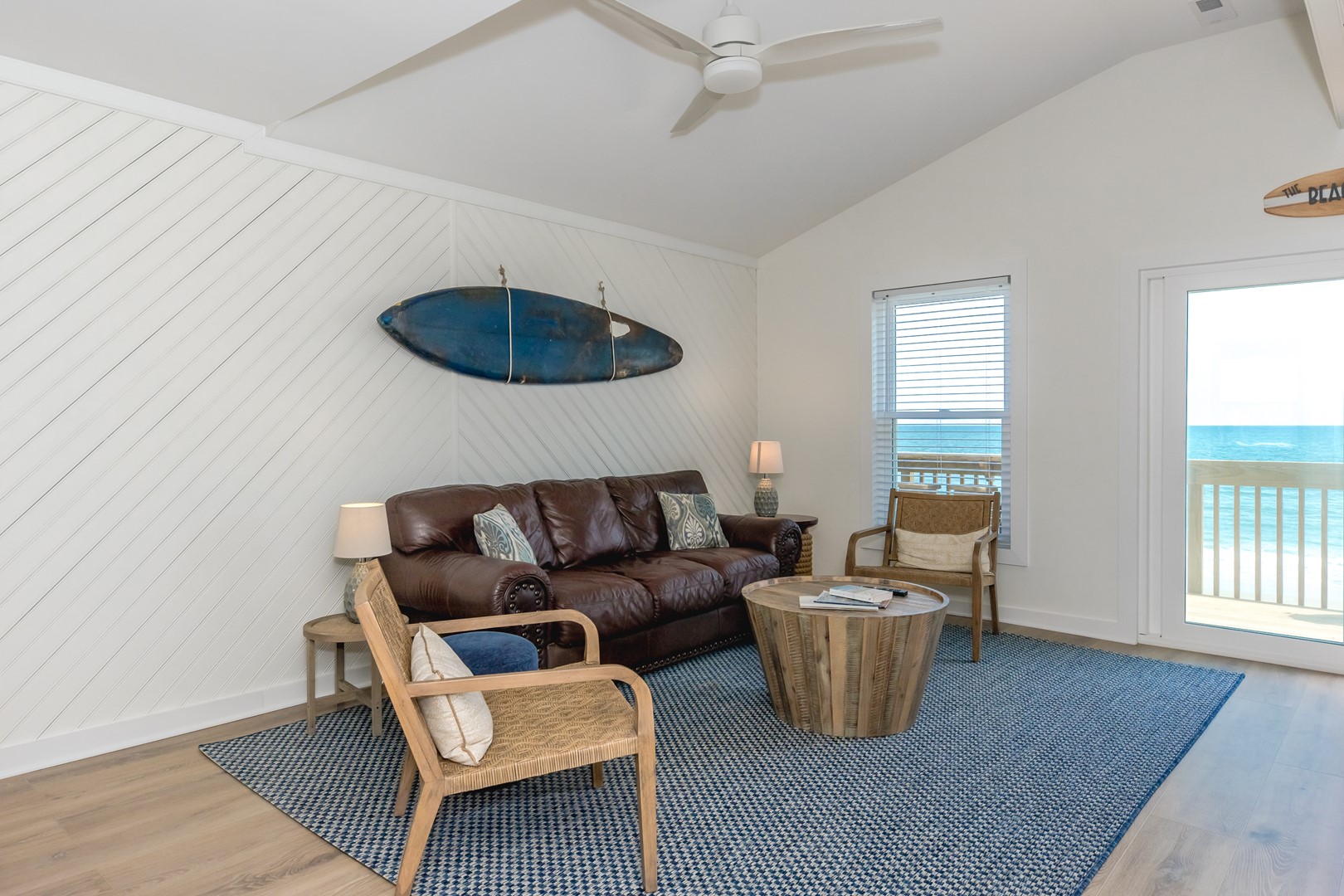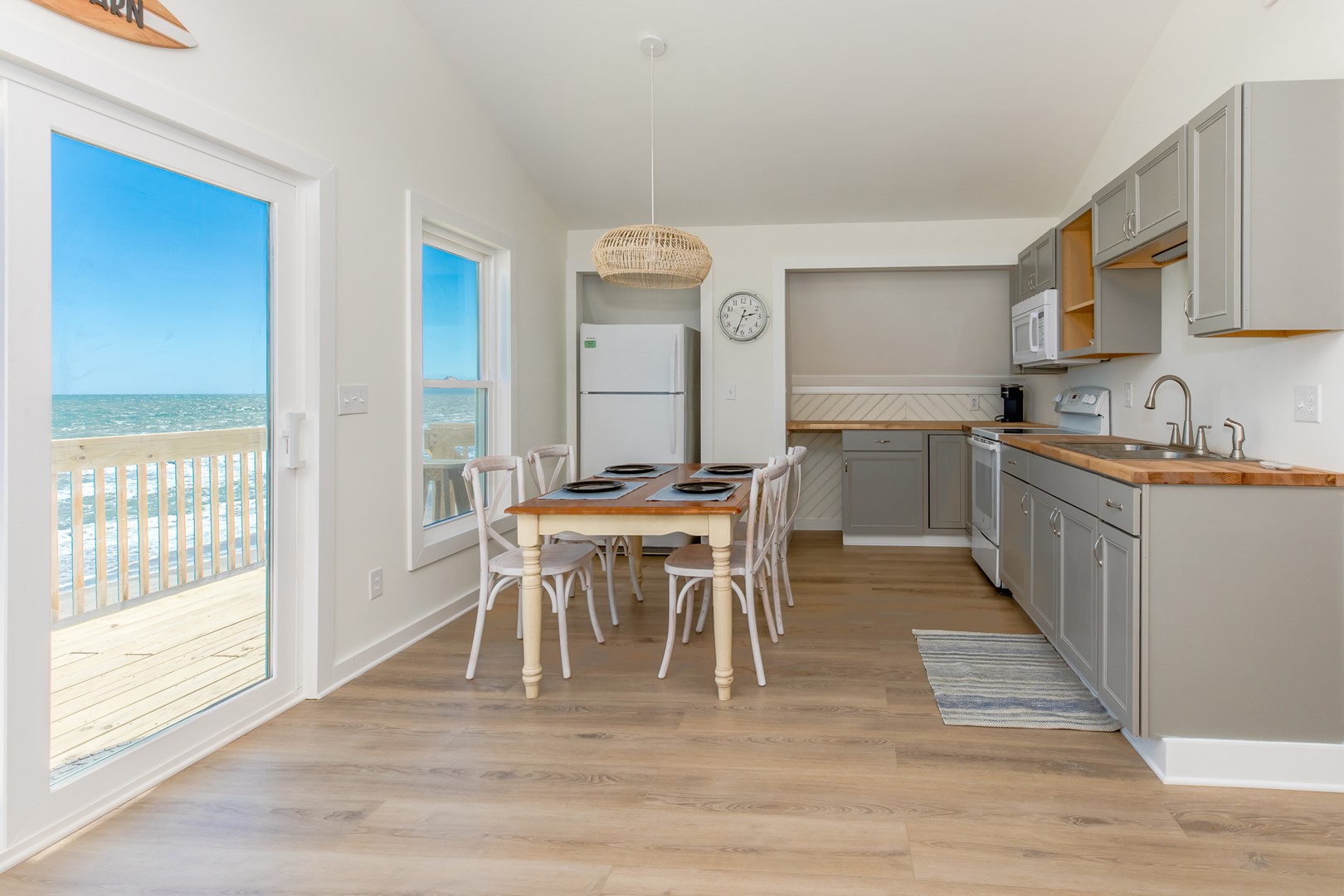 Relax and unwind by the sea in this recently renovated five bedroom, three bathroom home with a large double-level oceanfront deck. You'll love chilling out in the nice adirondack chairs, adjustable loungers, and our favorite: the built-in wooden bar with stools--perfect for coffee and breakfast by the beach or a sunset happy hour. The Beach Barn is perfect for groups that want a little more privacy--or a little more common space to enjoy (think: two kitchens, two living rooms, etc.).