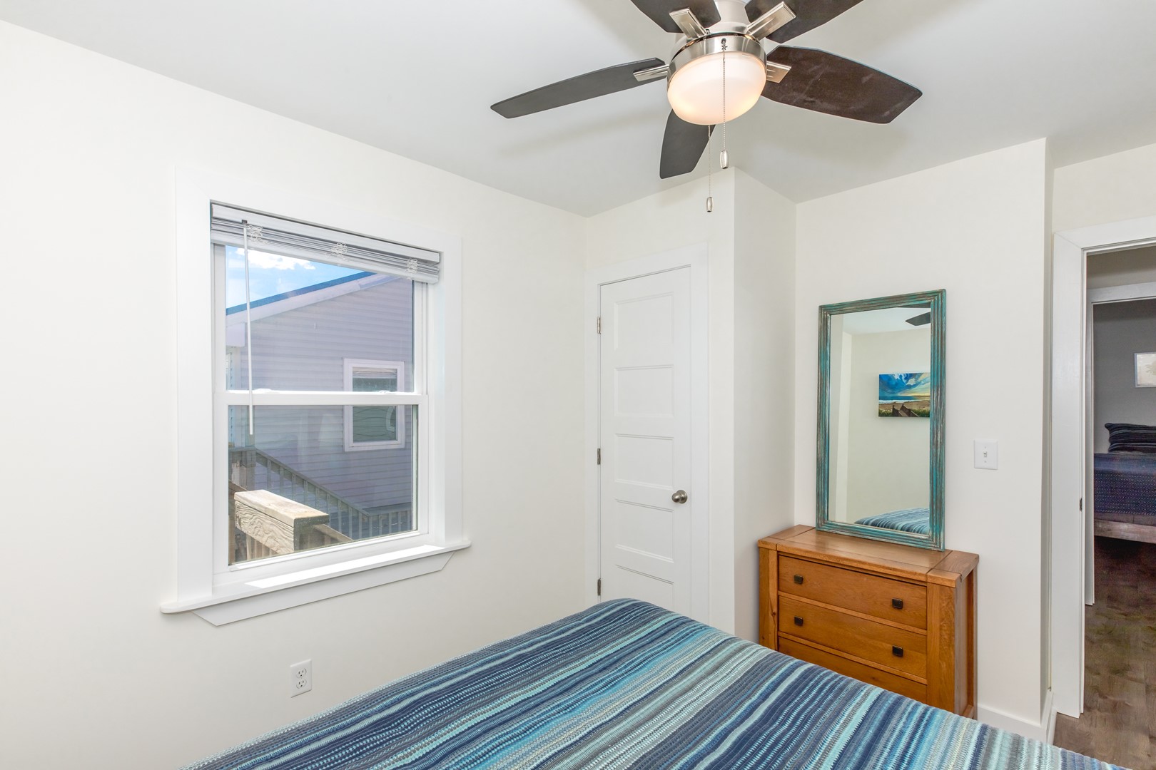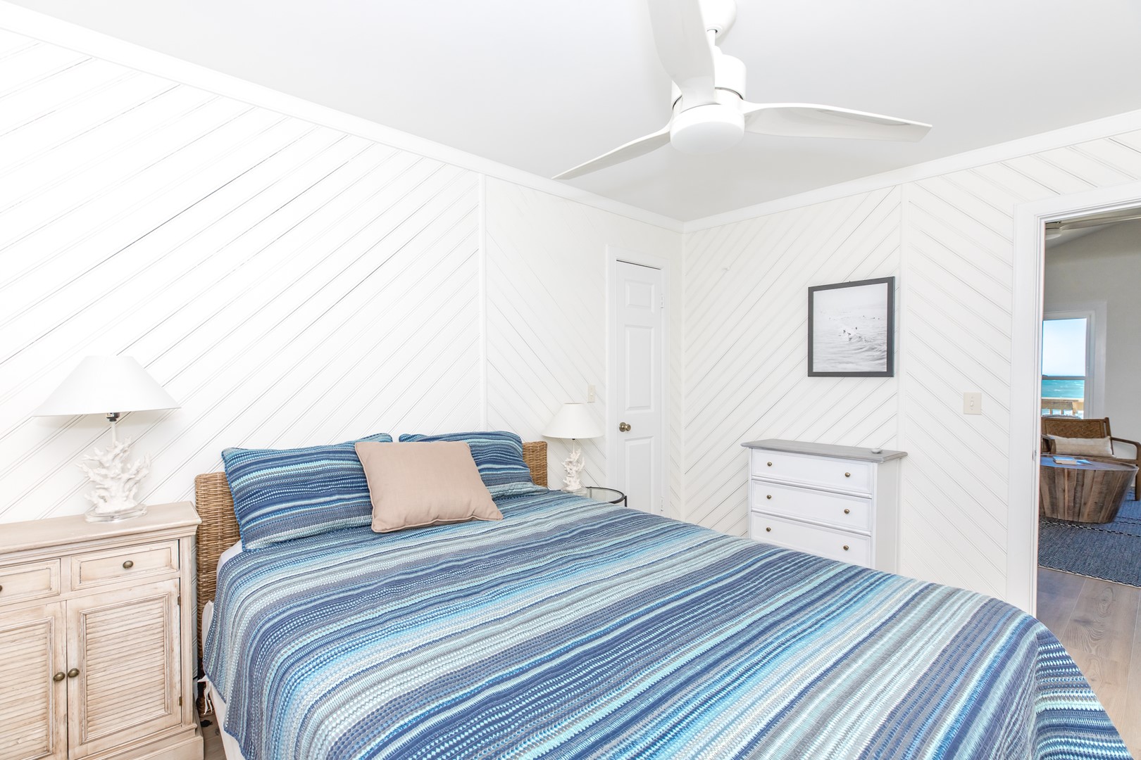 - South Oceanfront Bedroom: Queen Bed; shares adjacent full bathroom with tub/shower