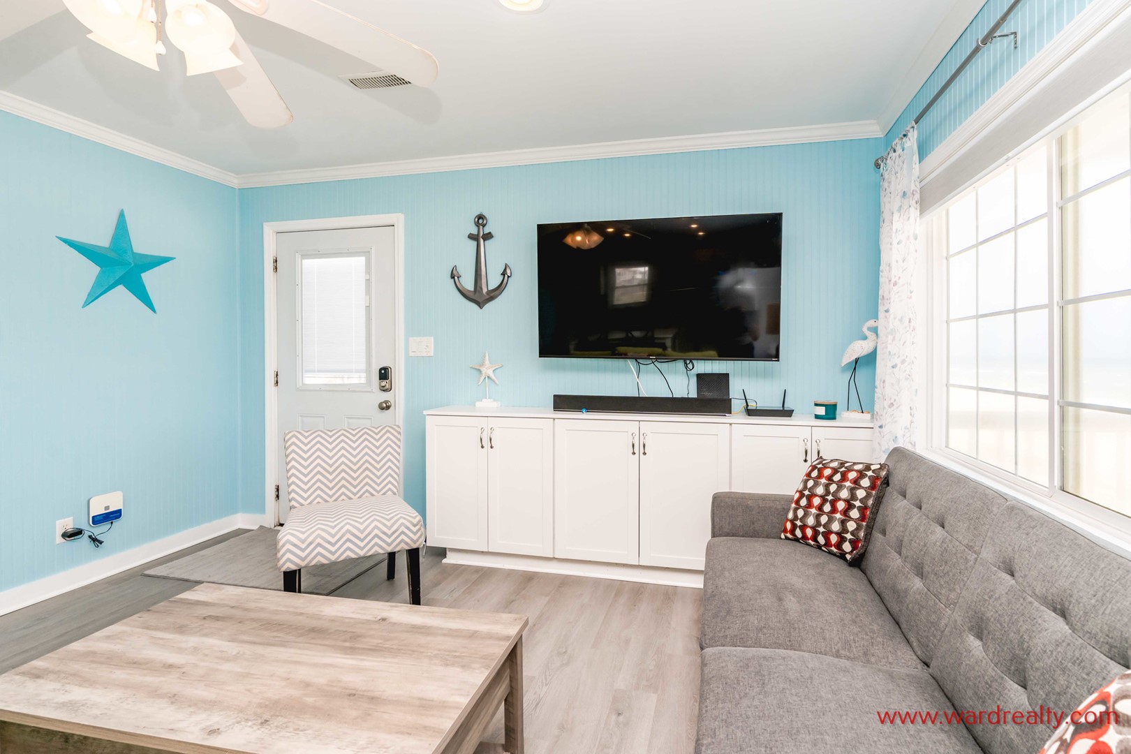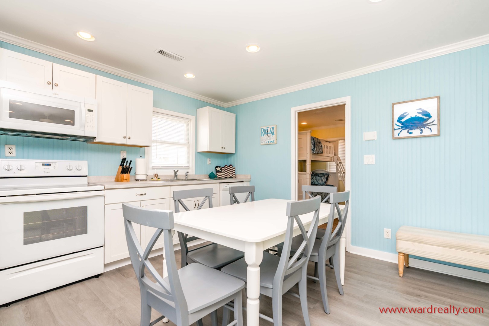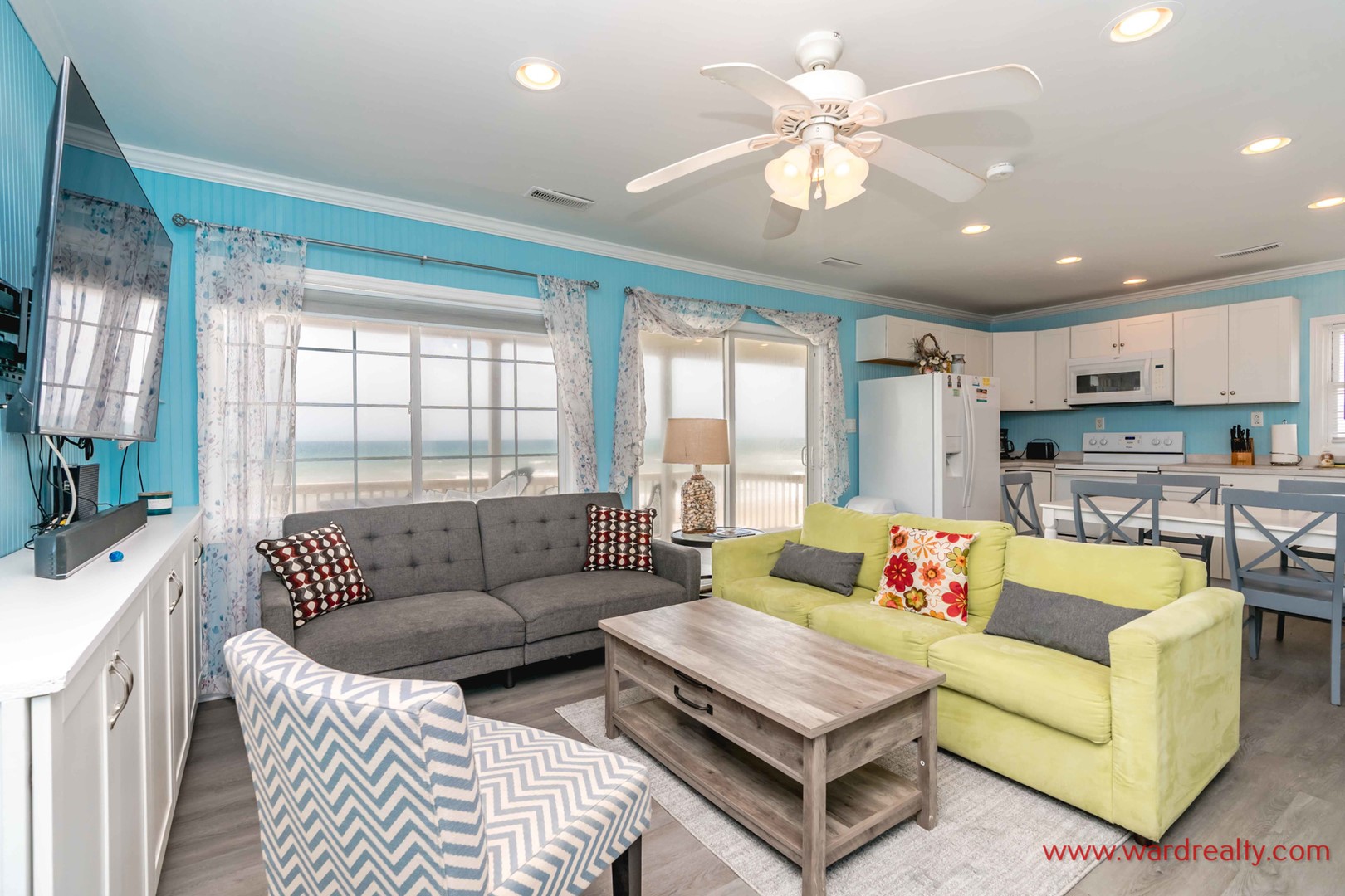 This classic Topsail Island beach cottage is the perfect size for your small group. Single story oceanfront living with an open floorplan and comfortable furnishings. The simple kitchen has everything you’ll need during your stay and the dining table seats at least 4.