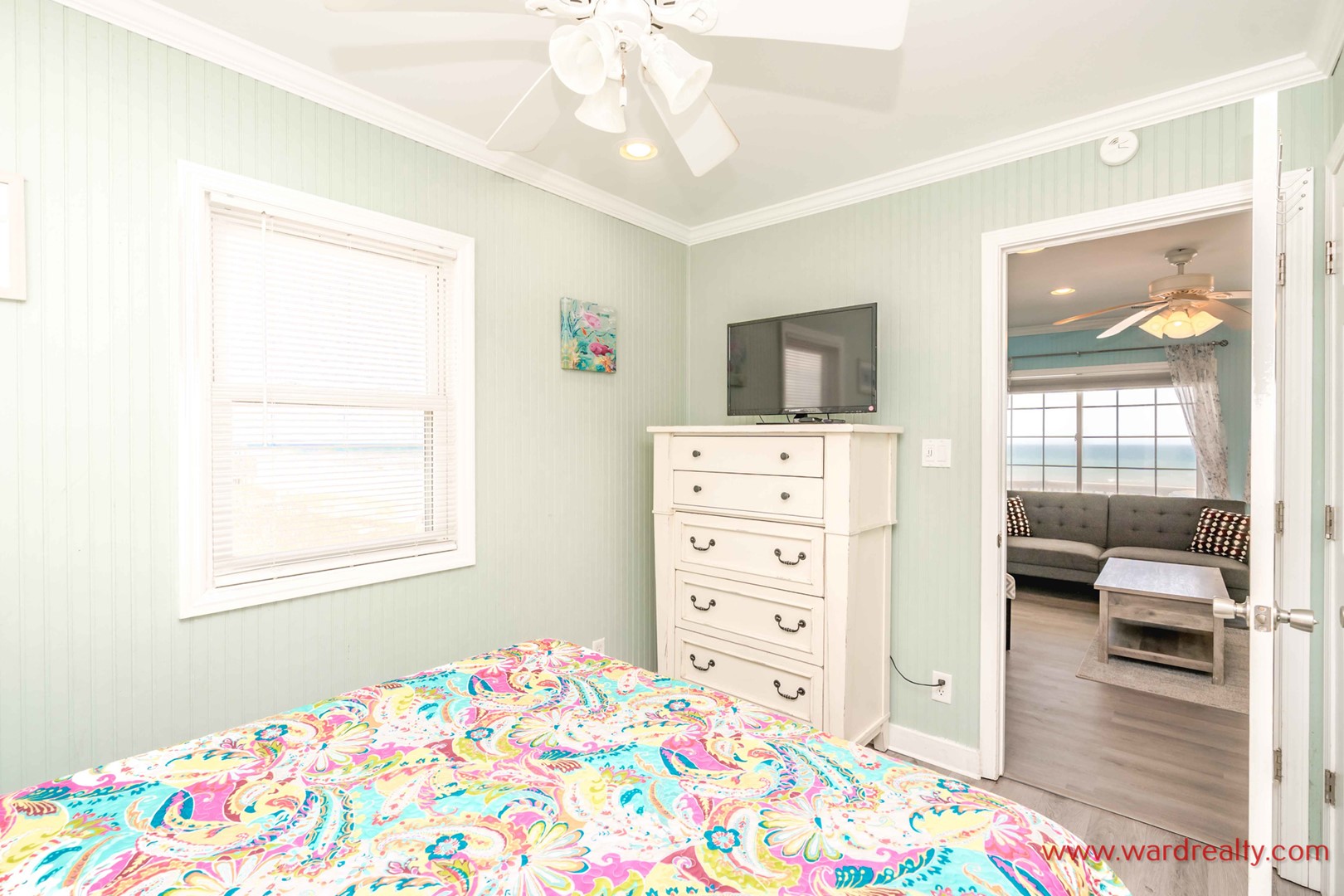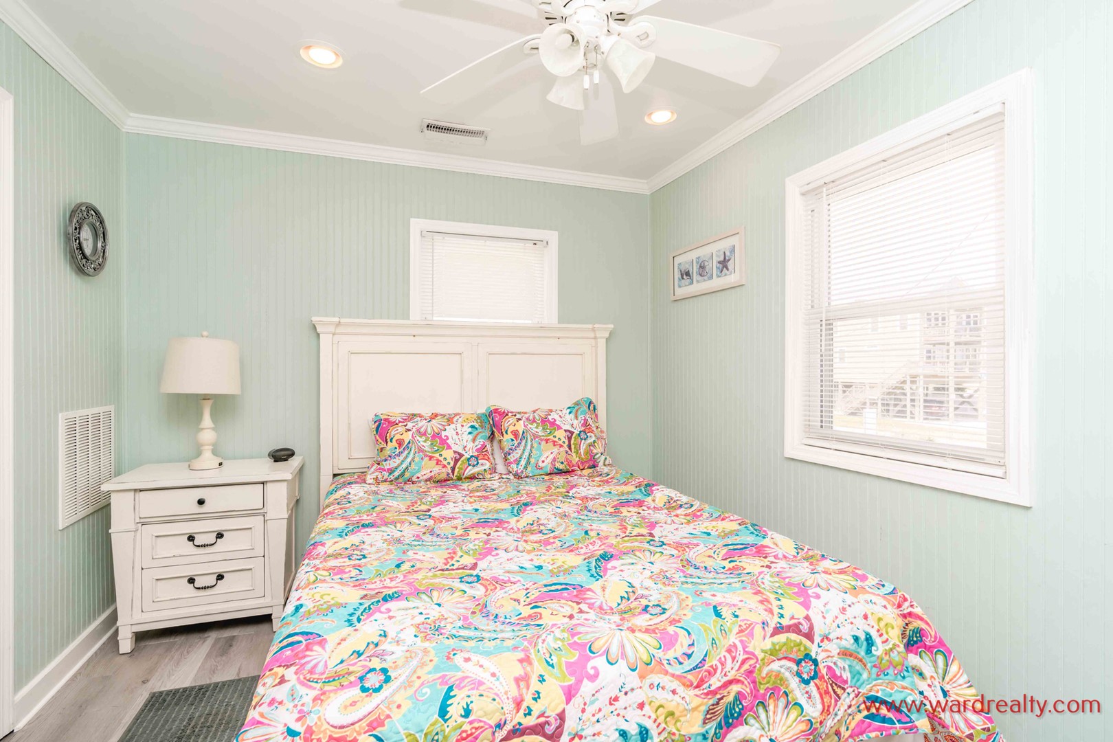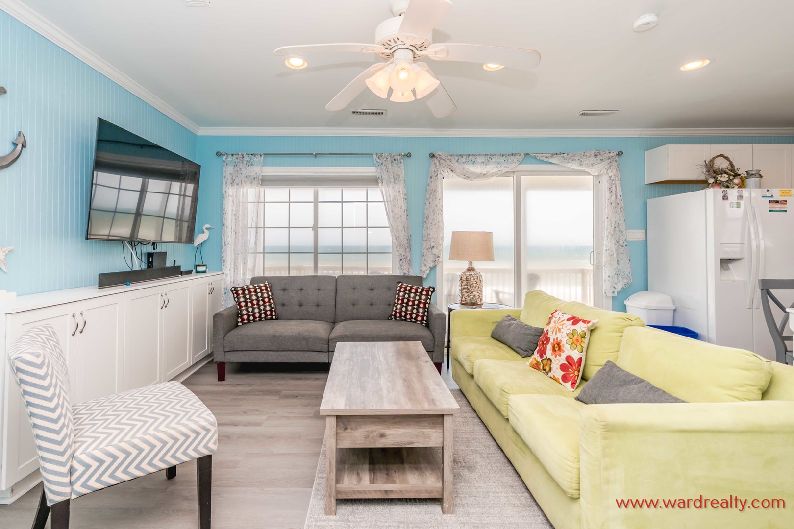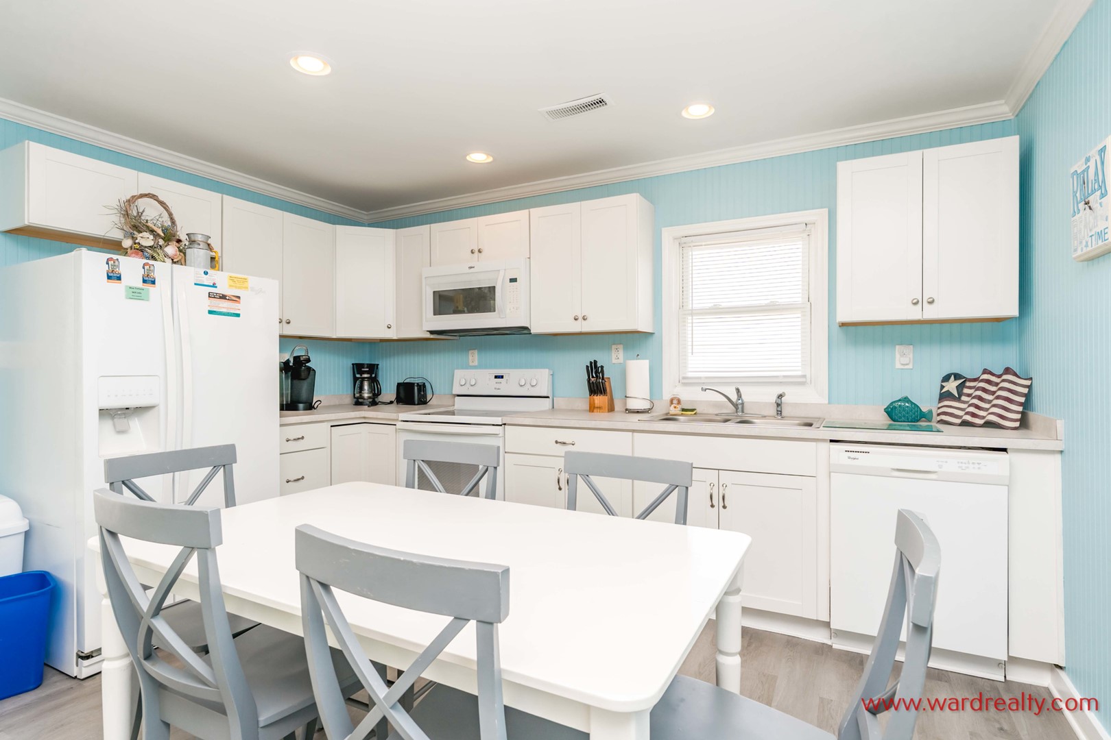 This classic Topsail Island beach cottage is the perfect size for your small group. Single story oceanfront living with an open floorplan and comfortable furnishings. The simple kitchen has everything you’ll need during your stay and the dining table seats at least 4.