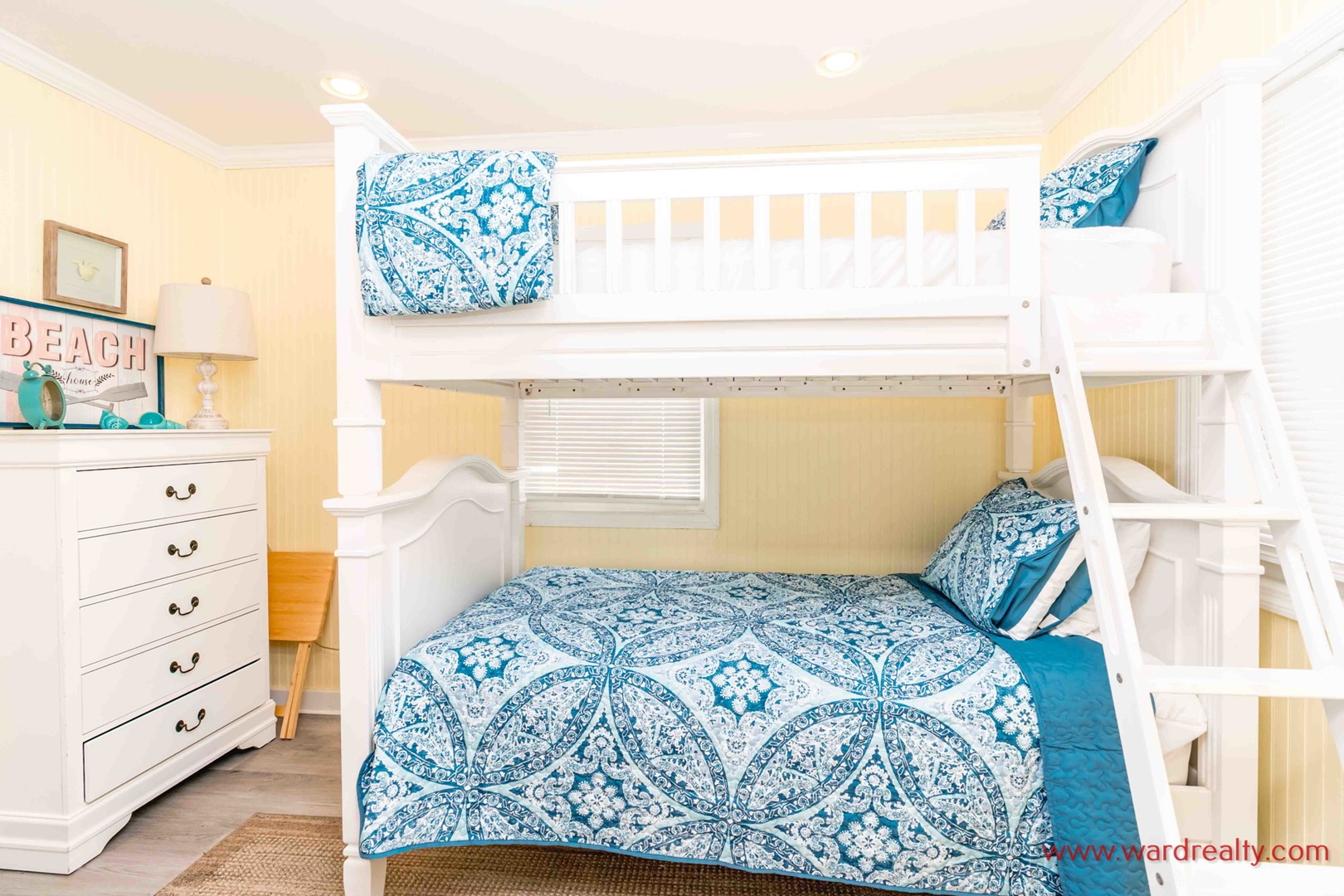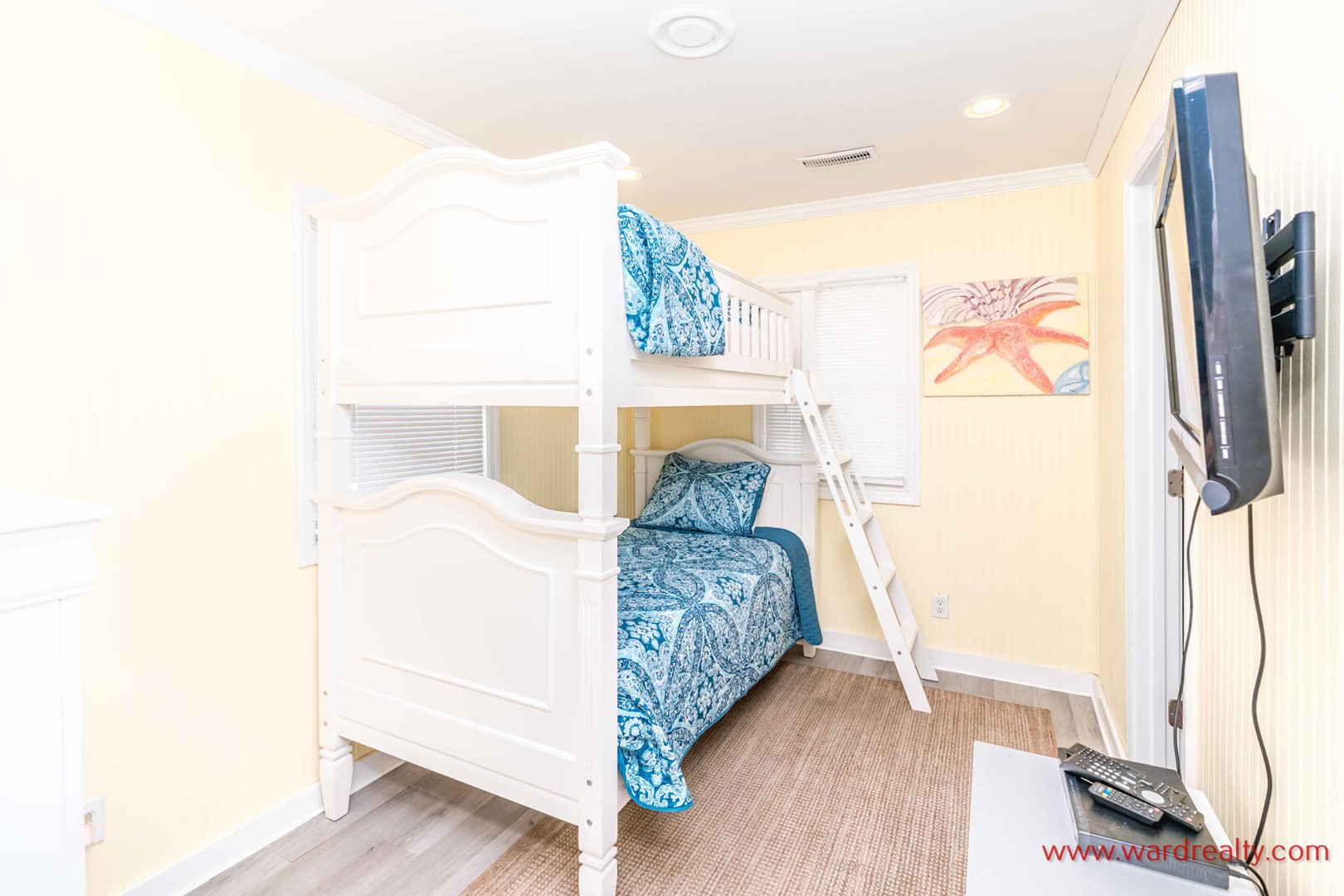 - South Street-Side Bedroom: Bunk Bed; TV; shares jack and jill bathroom with tub/shower