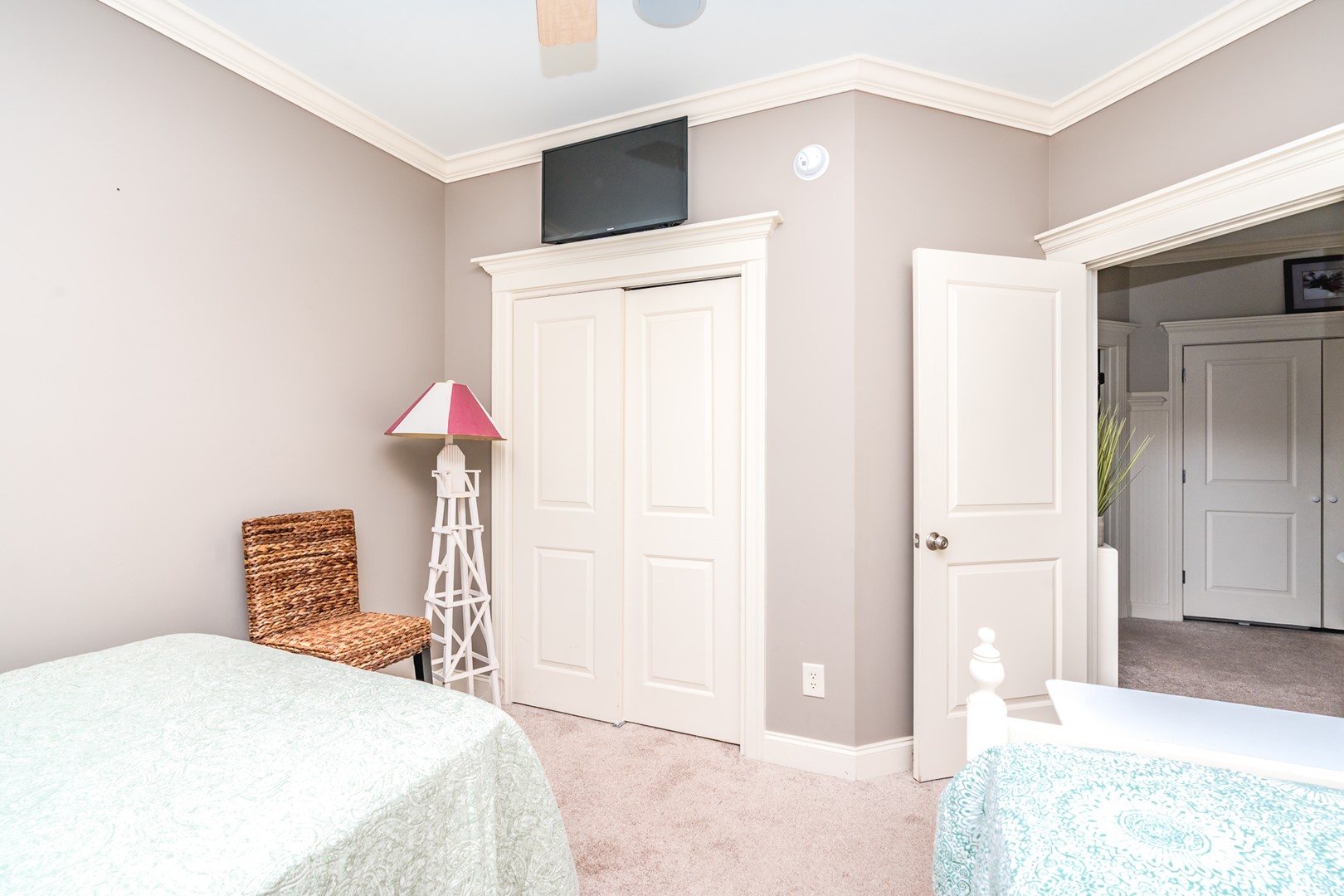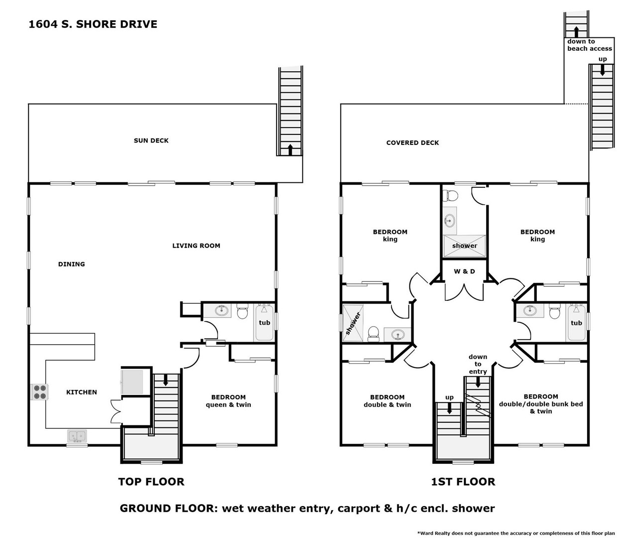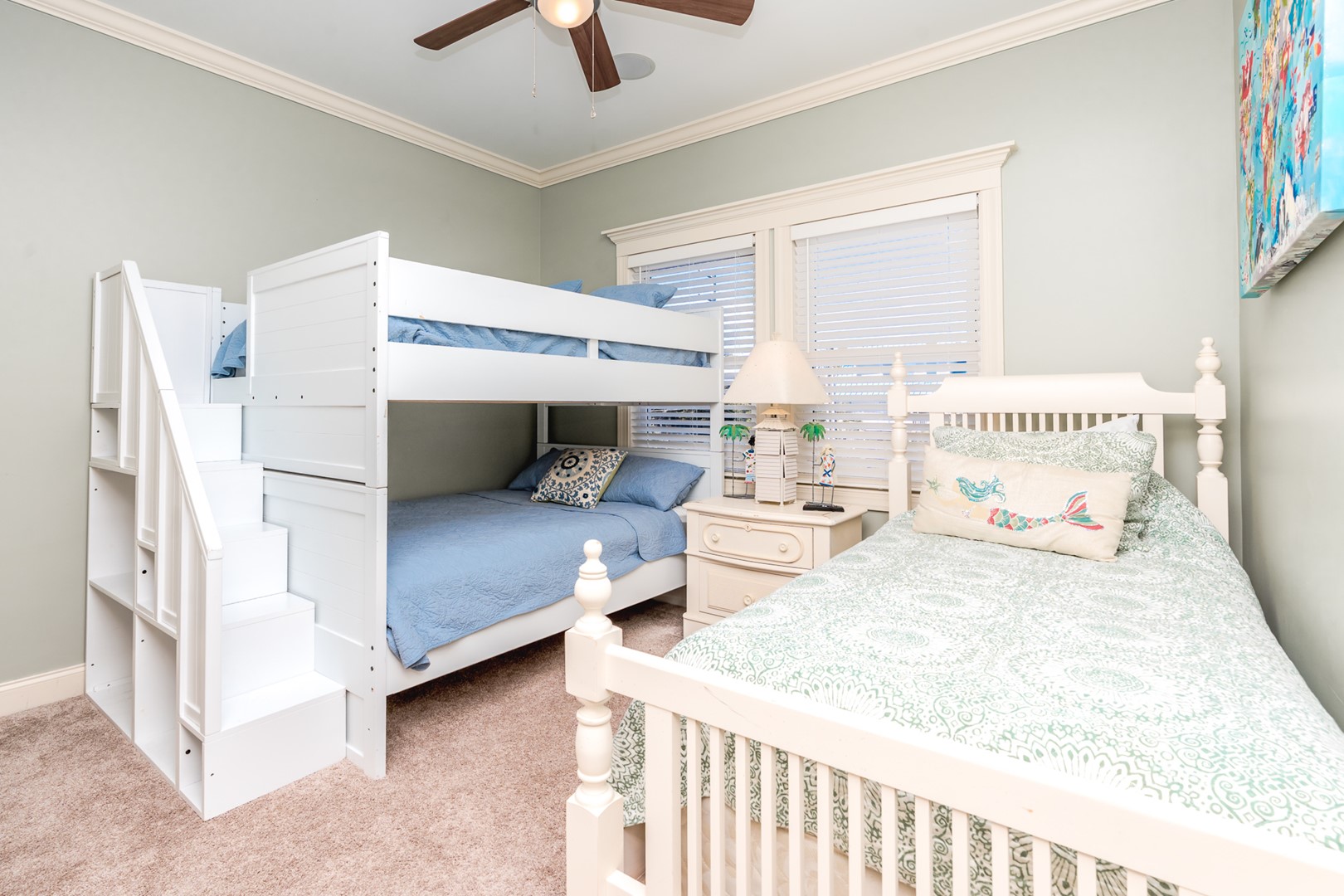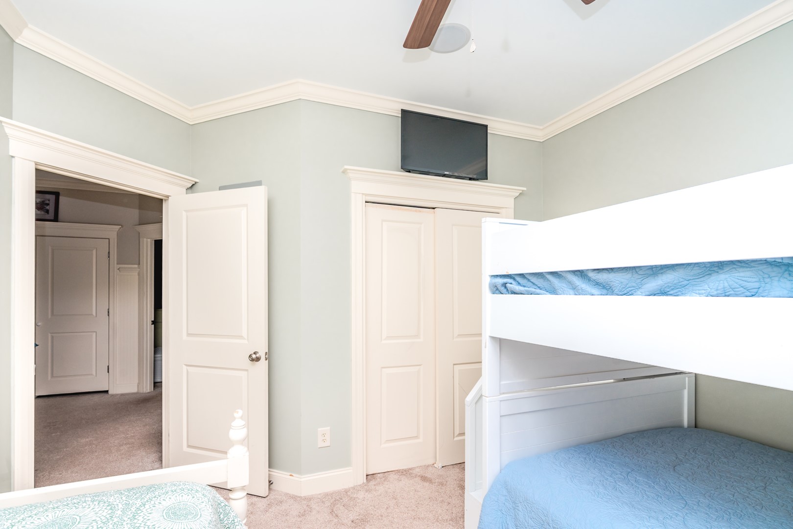 - Street-Side South Bedroom: Double over Double Bunk and Twin Bed; TV; shares hall bath with tub/shower