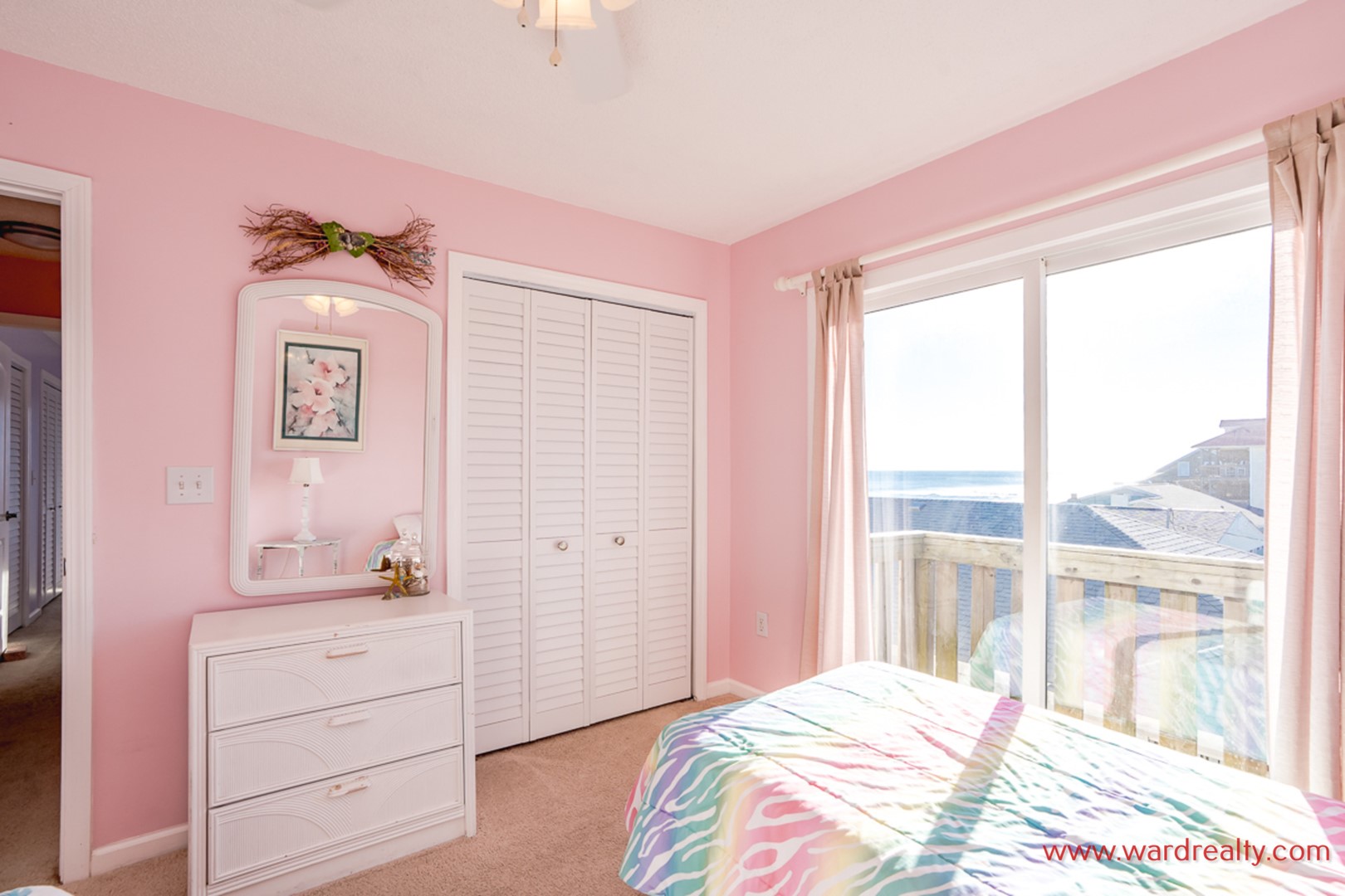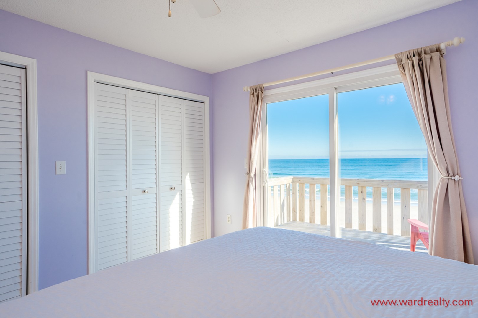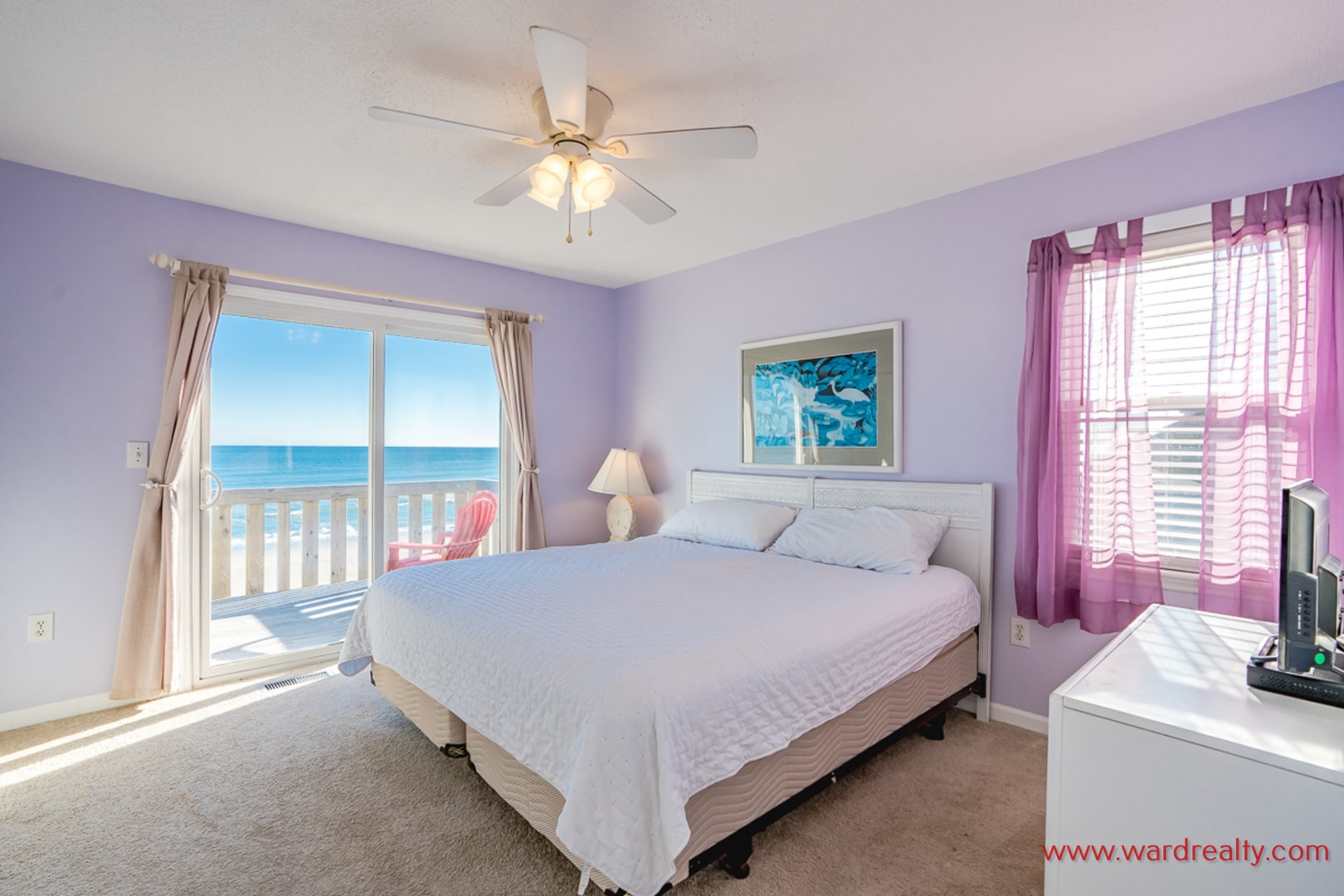 - Top Floor Oceanfront Bedroom: King Bed; access to private sun deck; shares hall bathroom with tub/shower