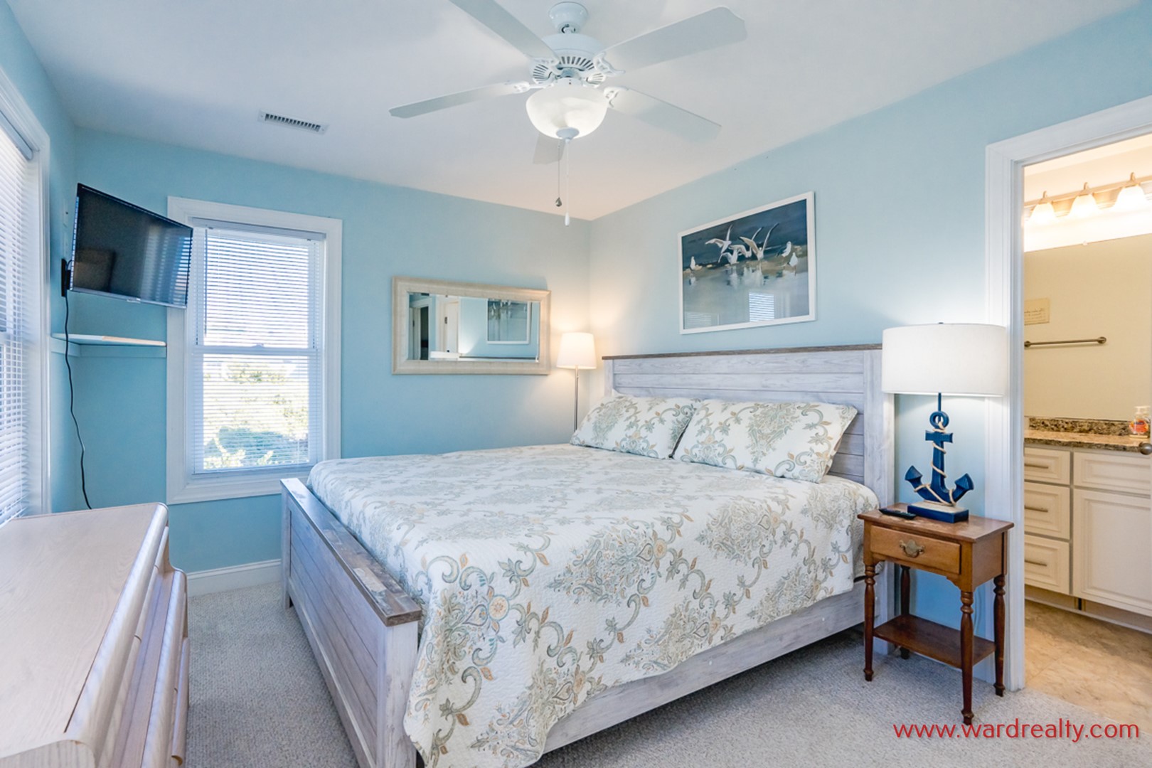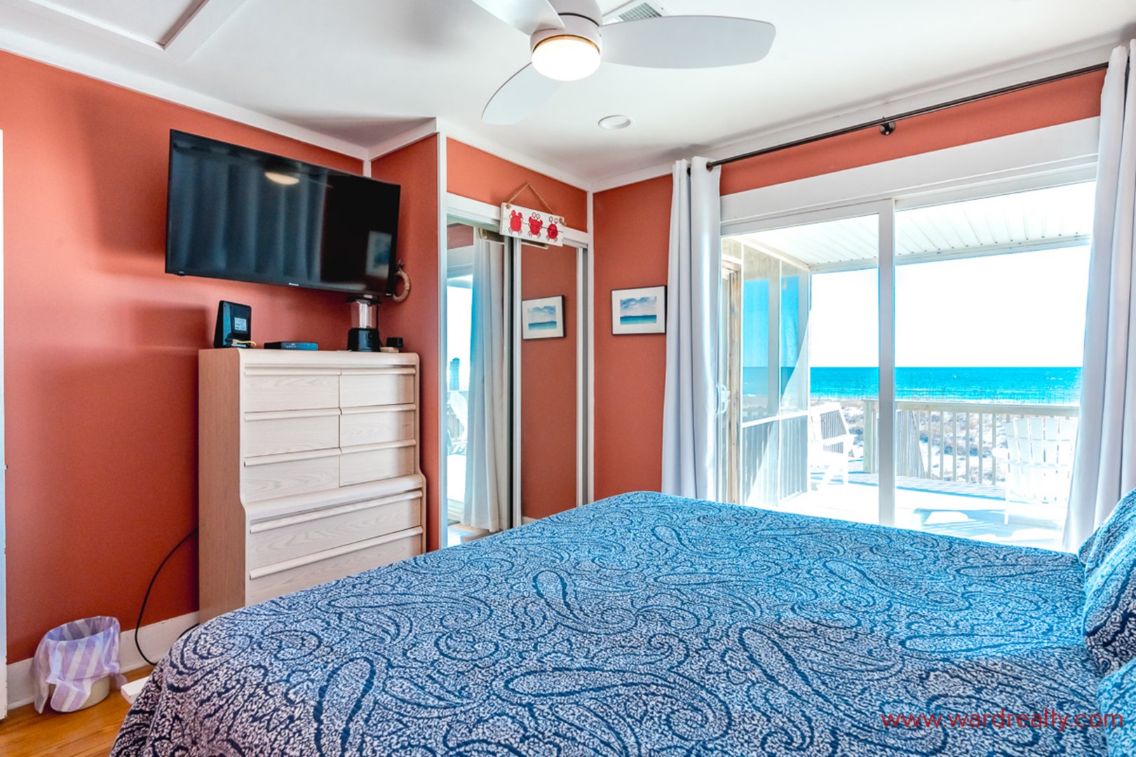 - Oceanfront Bedroom: King Bed; TV; shares hall bathroom with shower