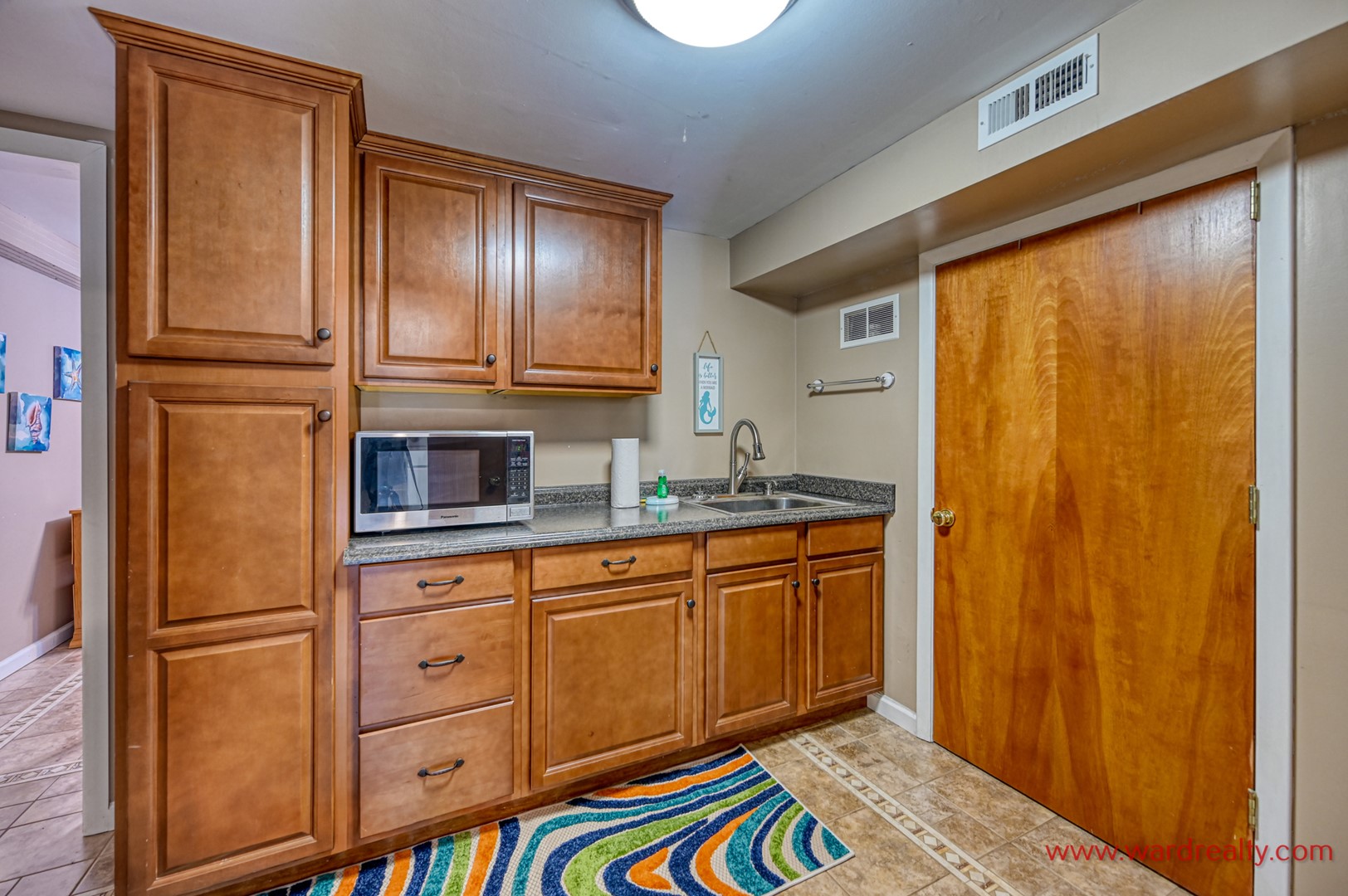 The ground floor is a unique space that the kids will enjoy. The wrap-around couch with fold out queen size sleeper is great for a movie night! Also located on the ground floor is a full bathroom with shower and kitchenette with microwave.