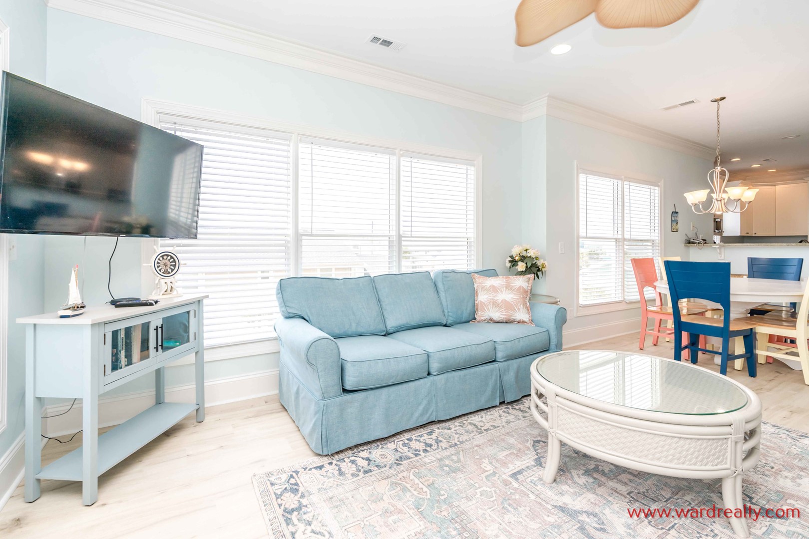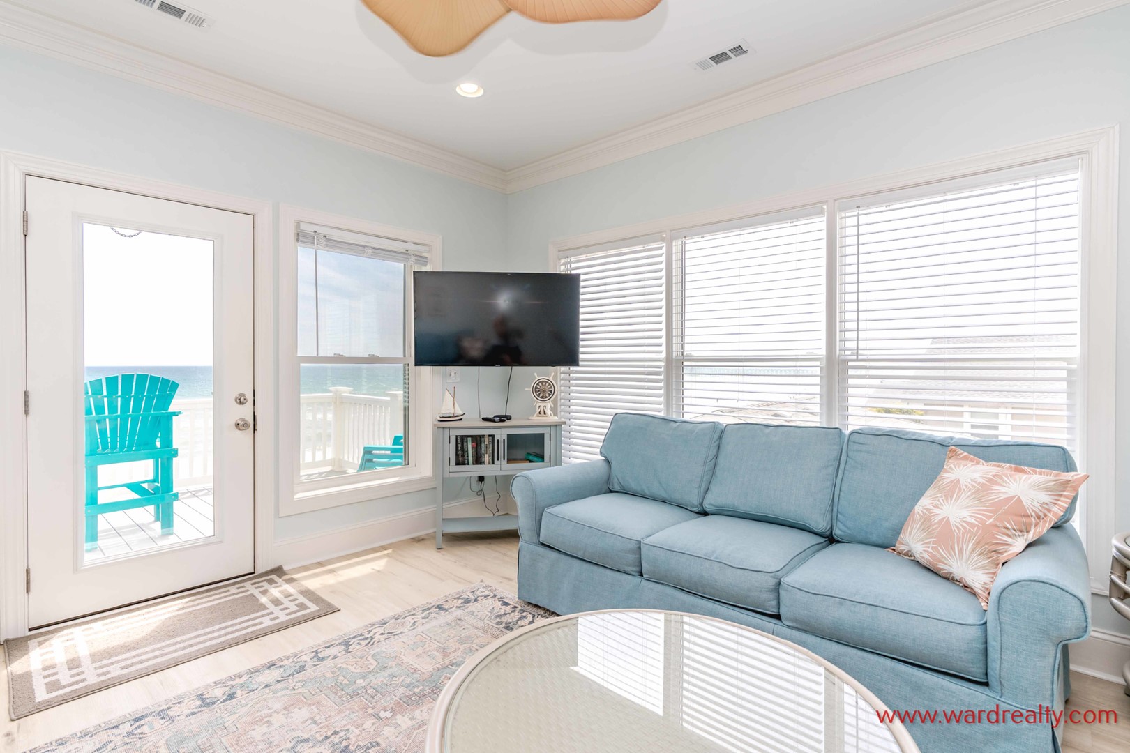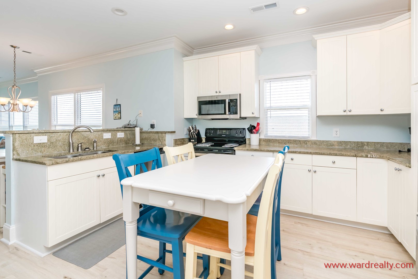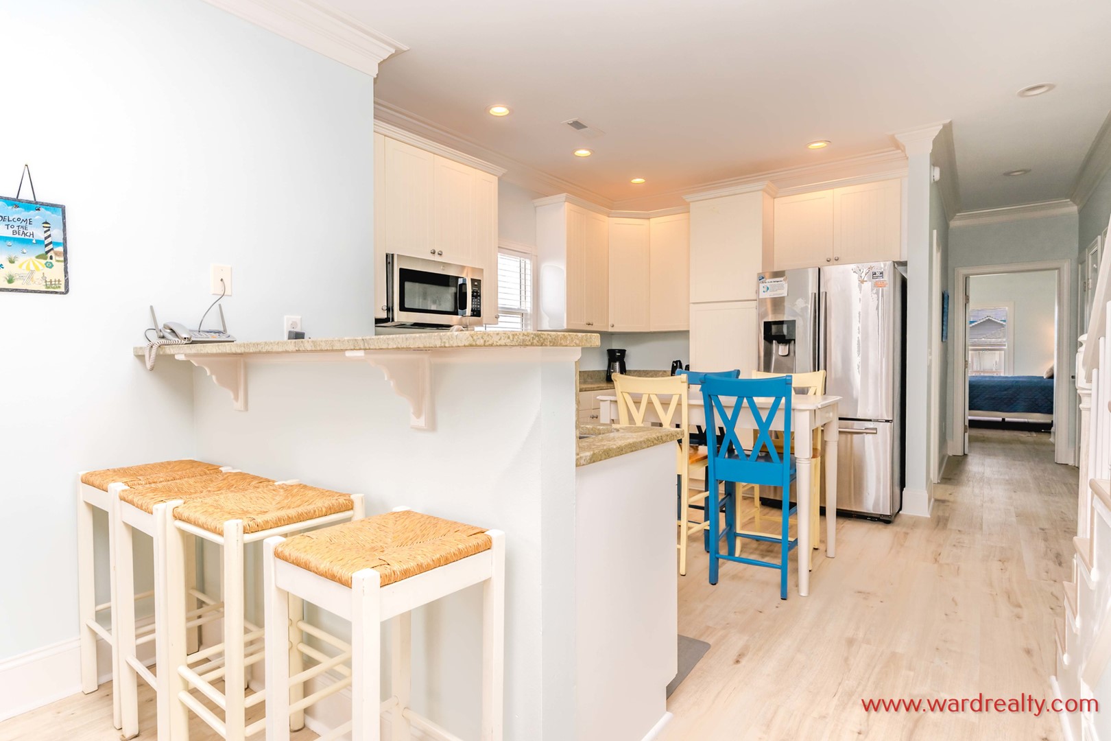 The popular reverse floorplan puts all of the living spaces on the second floor to maximize the gorgeous oceanfront views from every window. The open floorplan allows all guests to spend time together, whether you are cooking meals or watching movies. You can access the oceanfront sundeck from the living room. The dining area seats 6 at the dining table, 4 at the eat in kitchen table, plus 4 more at the counter.