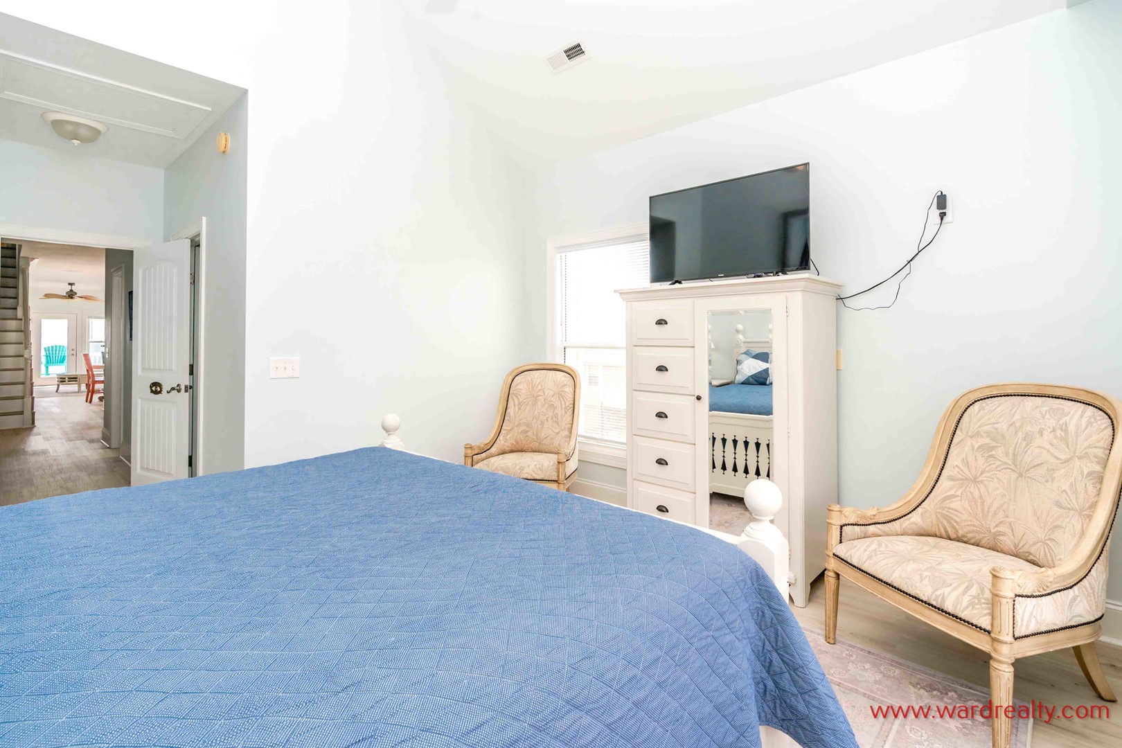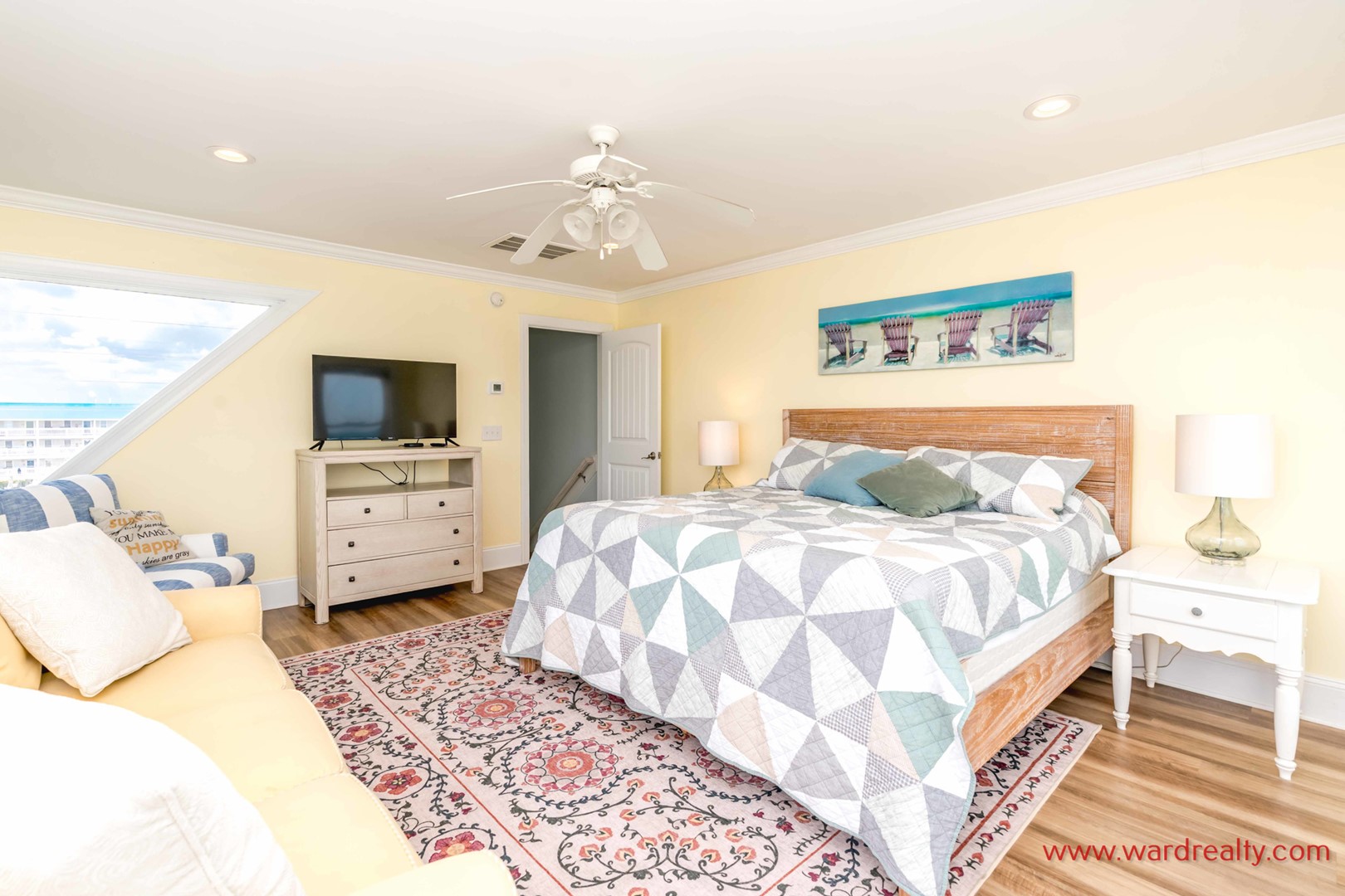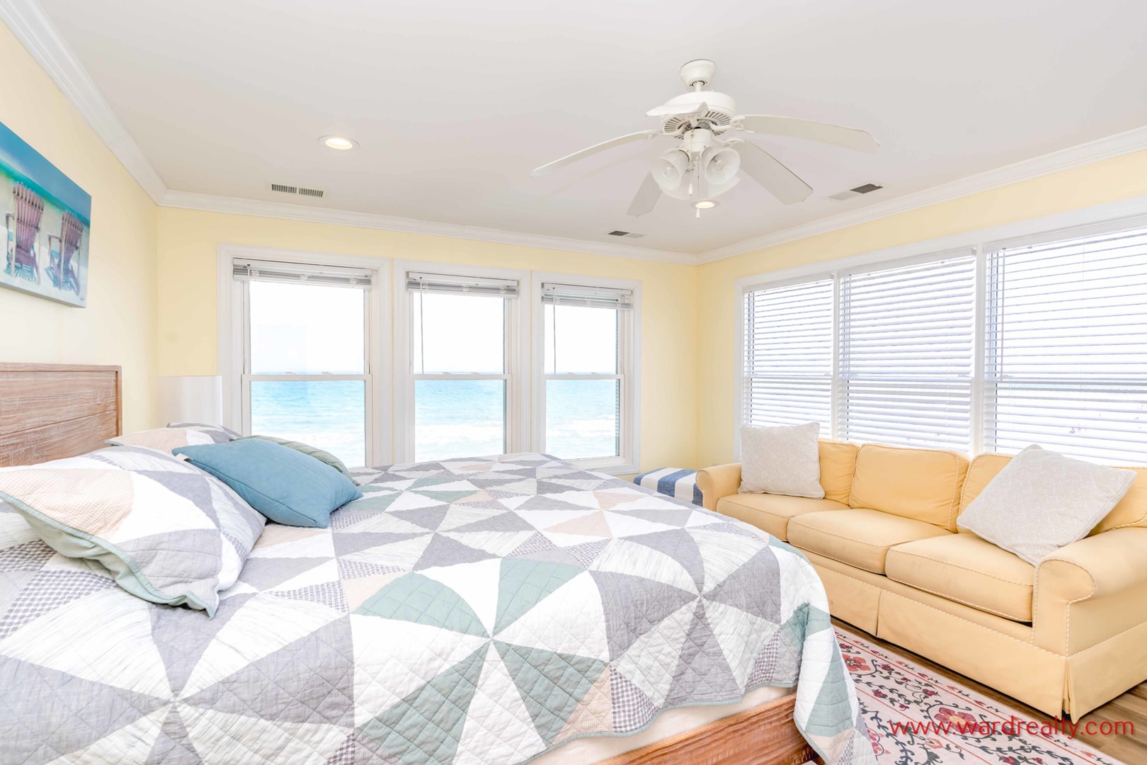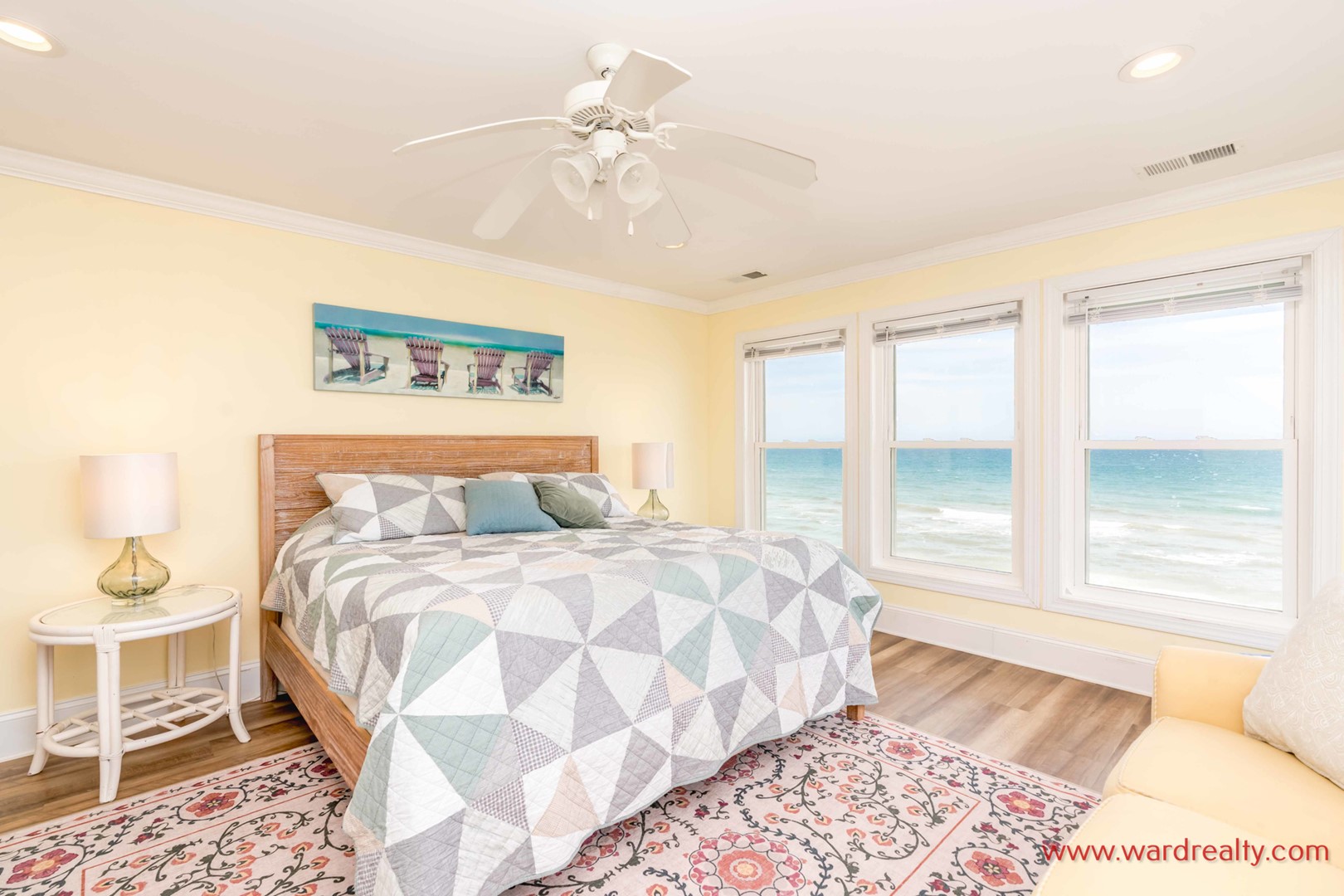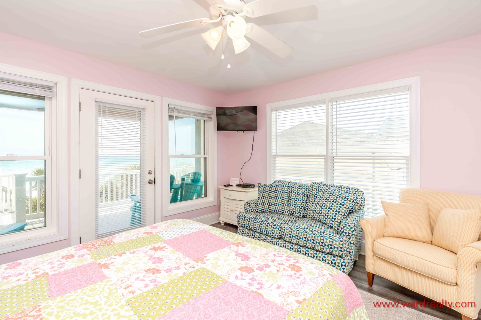 - Top Floor Oceanfront Bedroom: King Bed; TV; shares bathroom downstairs