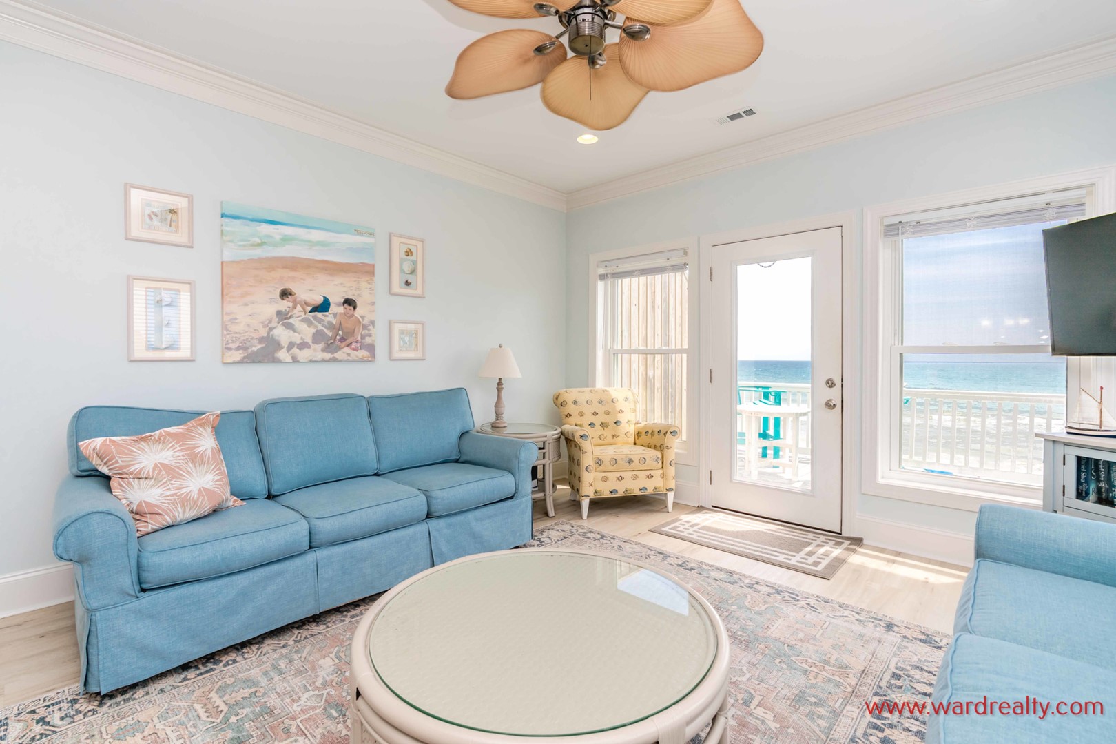 This oceanfront home has two oceanfront decks, one is covered and accesses a shared walkway with the other side of the duplex. The walkway has a large seating area over the sand. The private sundeck is on the second floor, just off the living room and offers comfortable outdoor seating and beautiful views.