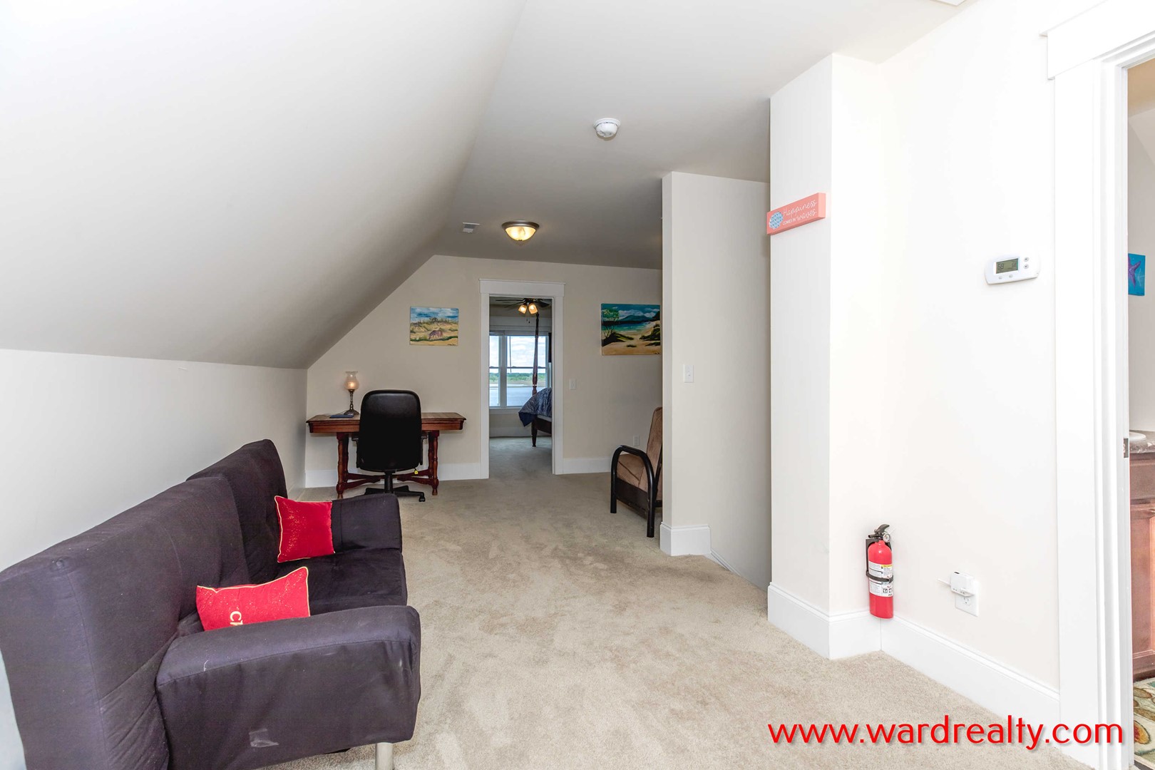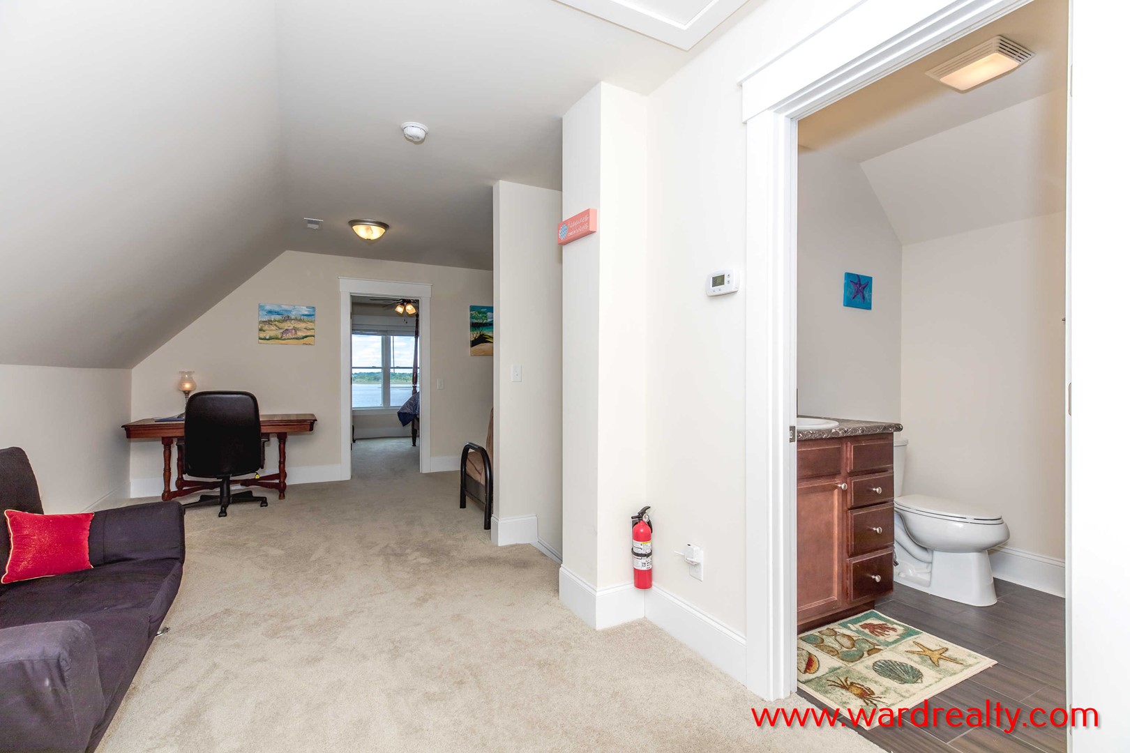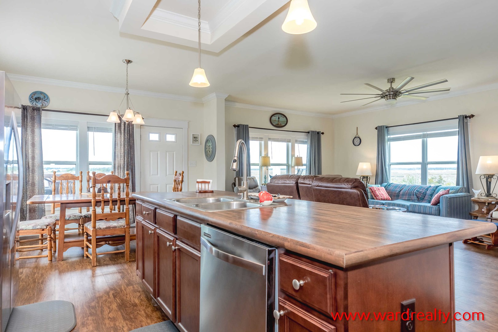The kitchen has a large eat in counter that seats 3 with an adjacent dining area that seats 6. Enjoy the view of the sound from the covered porch, perfect for relaxing and watching the wildlife. To make your life easier, use the exterior beach butler elevator to carry all your groceries and luggage to the first floor.