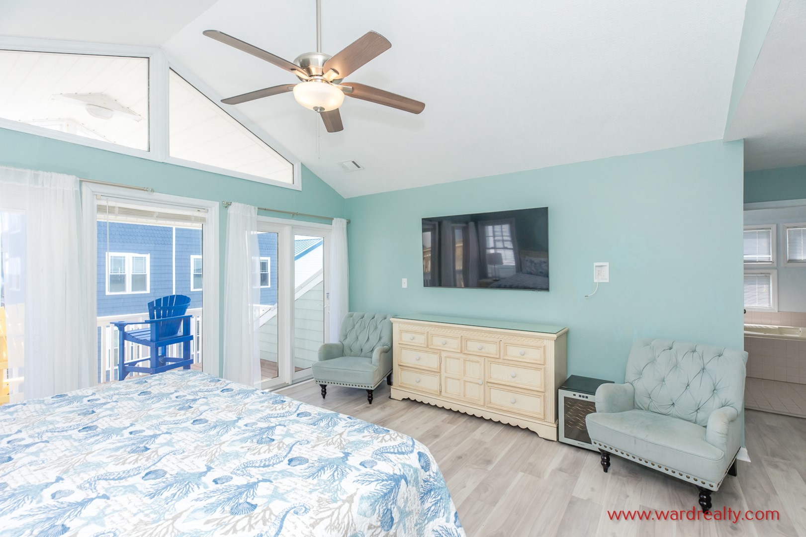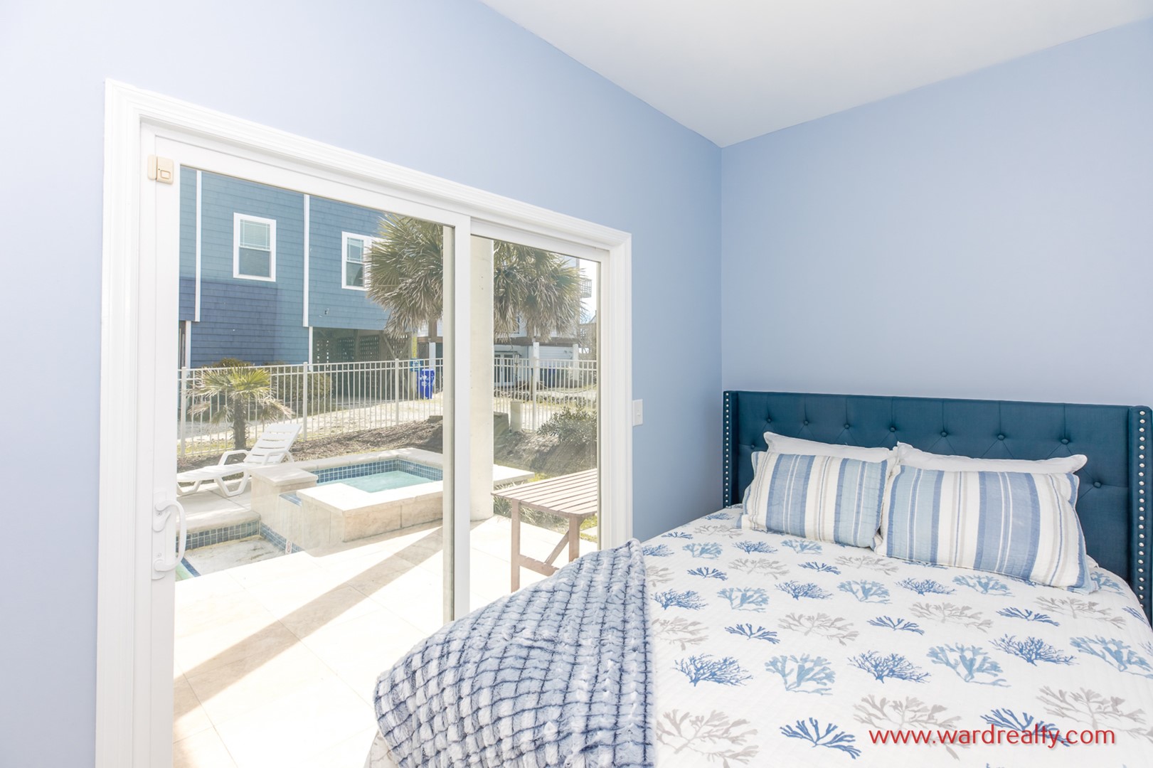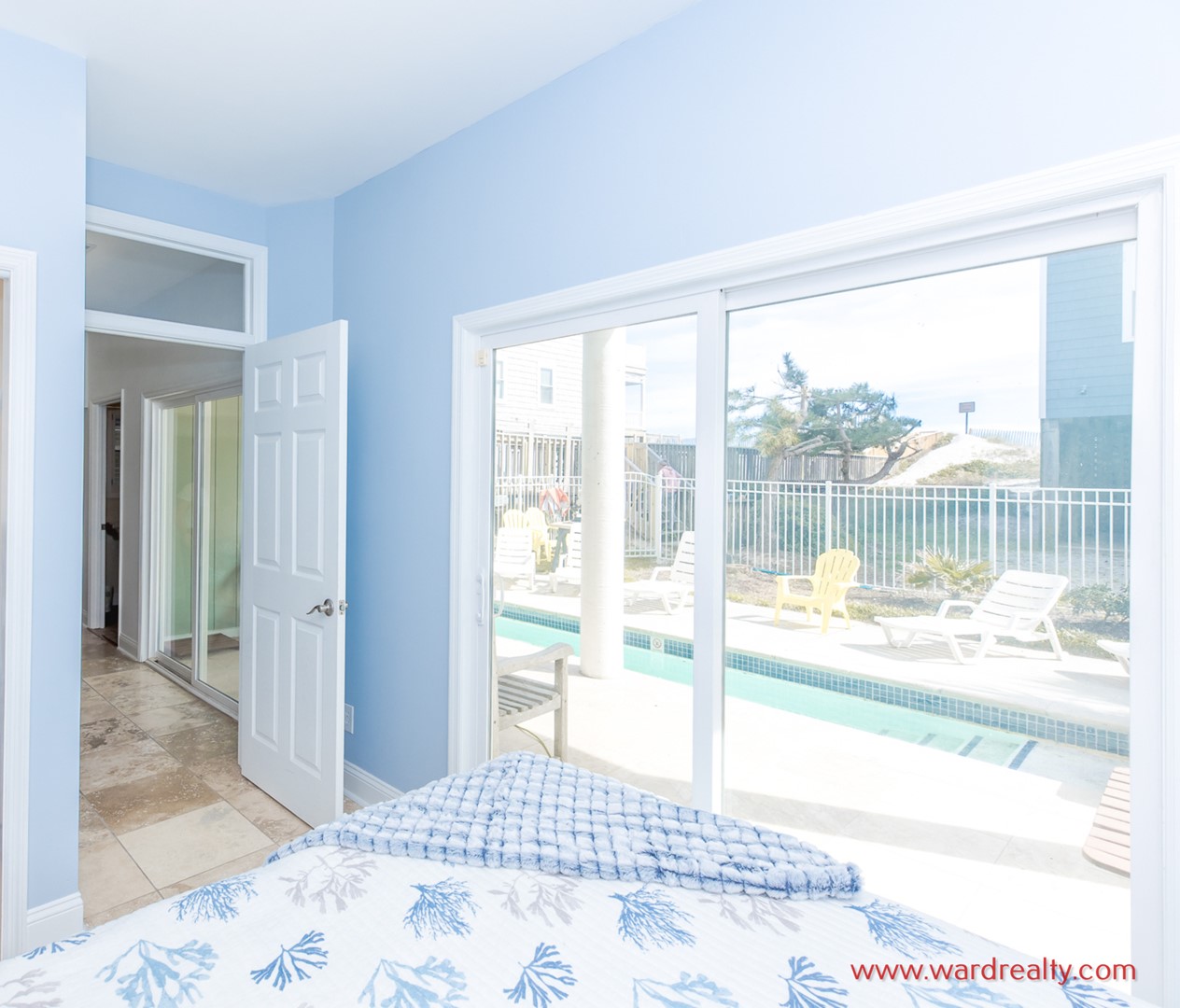 - South Oceanside Bedroom - Pool View: Queen Bed; TV; access to covered patio
