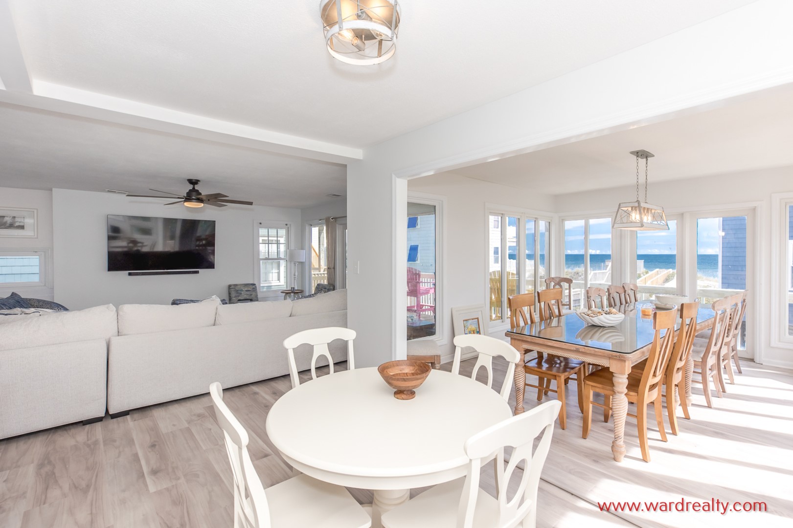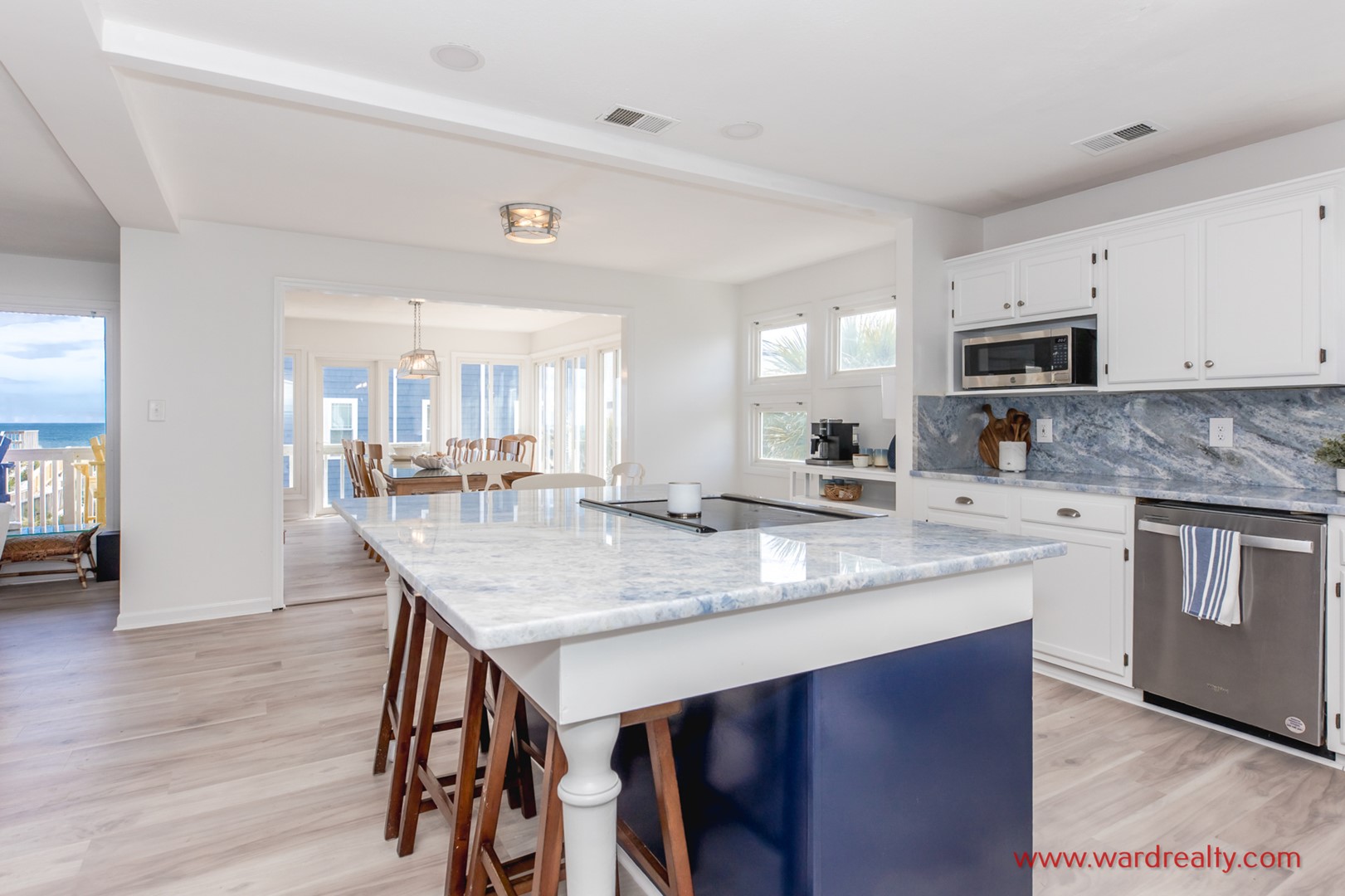 Whatever will be, will be and more at this newly renovated 6 bedroom, 3 bath home in North Topsail Beach. Experience the convenience of being on an oceanfront B-Lot location and also enjoy solid ocean views. Take advantage of one of the multiple covered porches and decks to feel the ocean breeze or catch the pelicans fly overhead. Or better yet, head down to the private heated* pool with attached hot tub for you to enjoy. Step inside to see how comfort and luxury blend seemlessly together. The updated kitchen is fully stocked and the spacious island makes prepping and socializing a breeze. With a large dining table off the sunroom, the whole family can sit and enjoy meals together. The open floorplan living room lets in natural sunlight and provides views of the Atlantic Ocean. Memories with your family and dog are ready to be made at Que Sea-Ra Sea-Ra