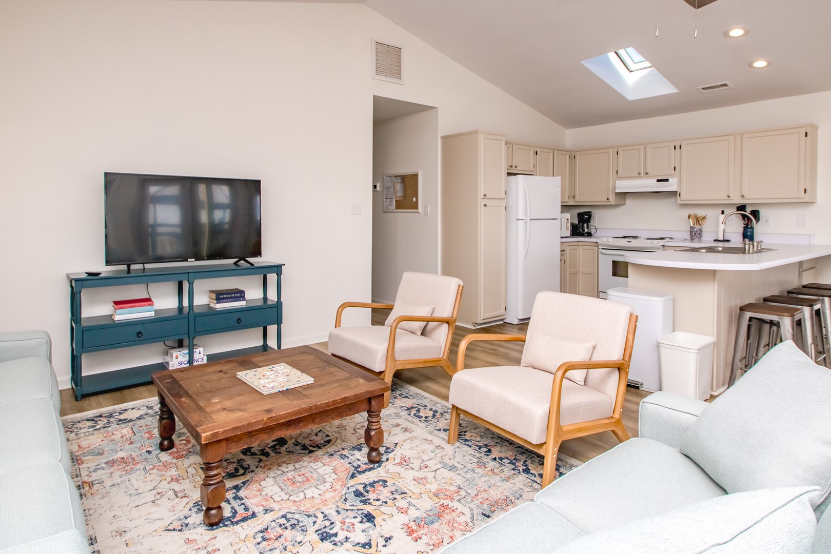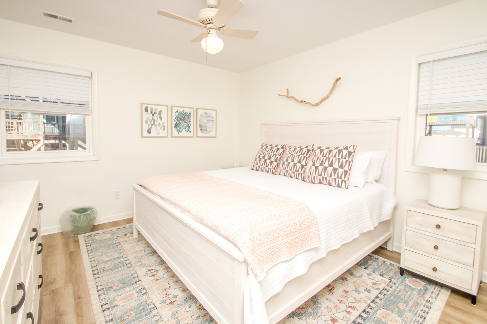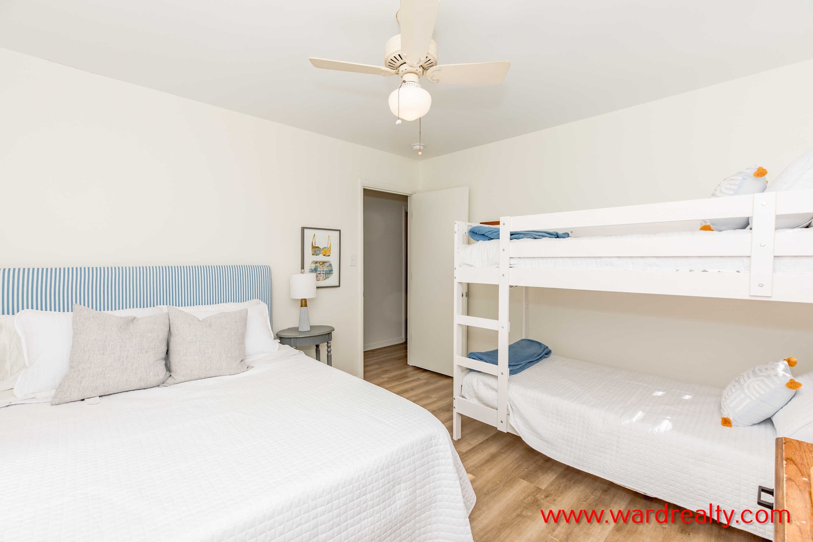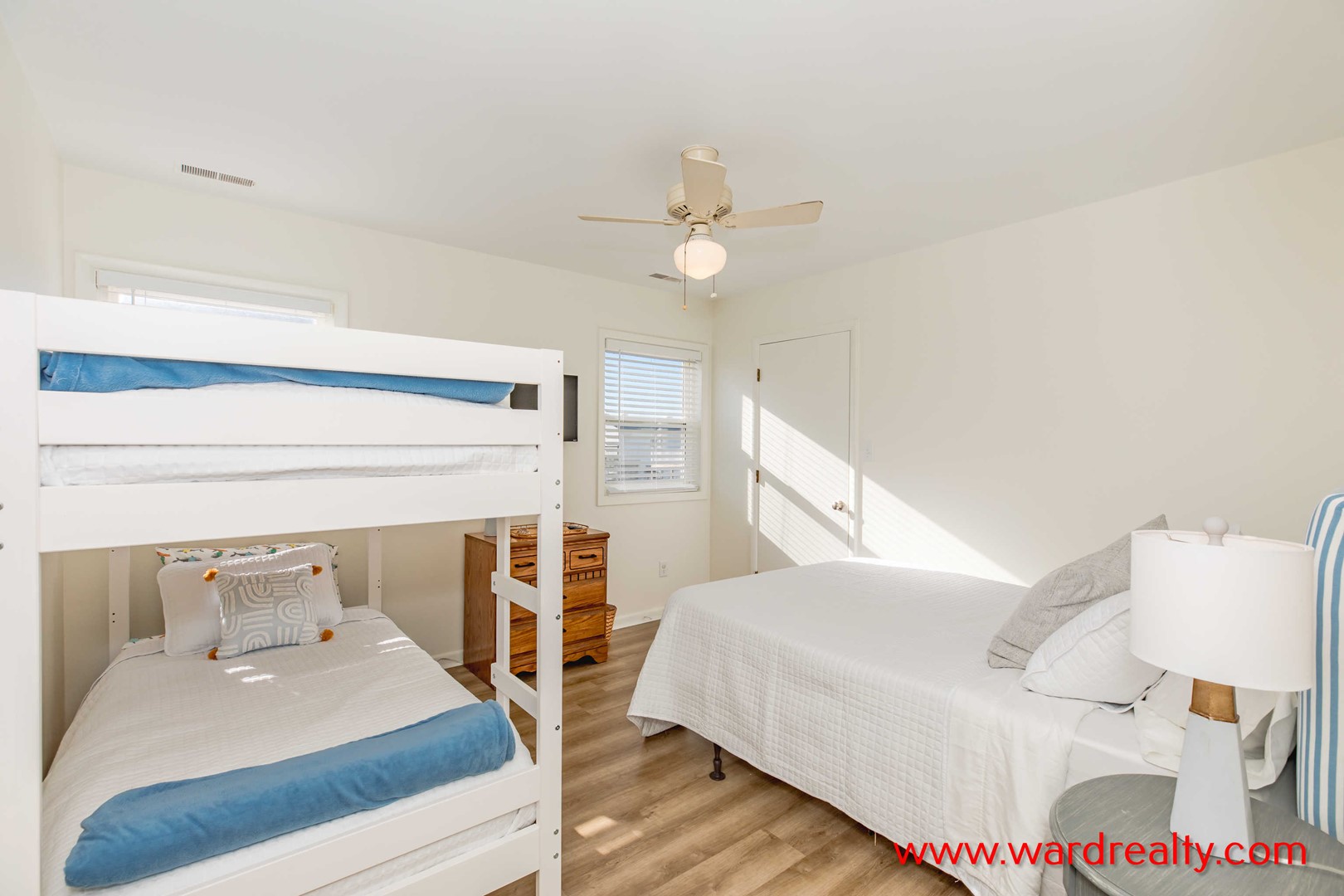 - South Back Bedroom: Queen Bed and Bunk Bed; TV; back hall bath (tub/shower) adjacent