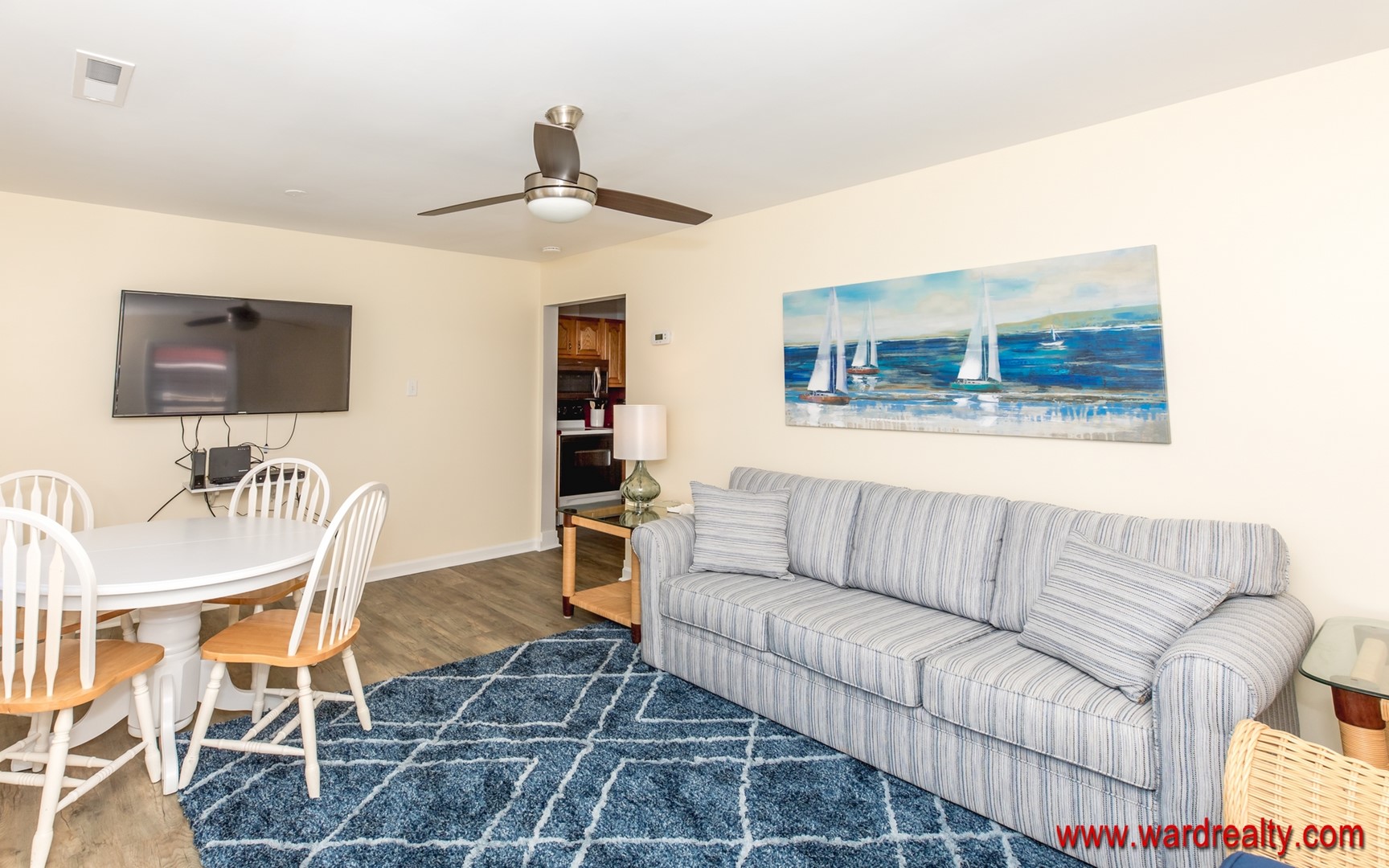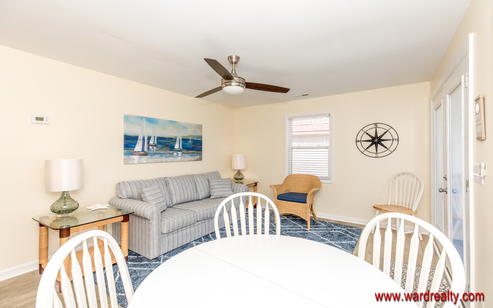 The kitchen, living and dining areas are cheerful and sunny. The perfectly sized kitchen has everything you will need for quick meals during your stay. If you are looking for more space, consider renting the other side, Sea Flat - 2 BR; 322 N. Shore Drive.