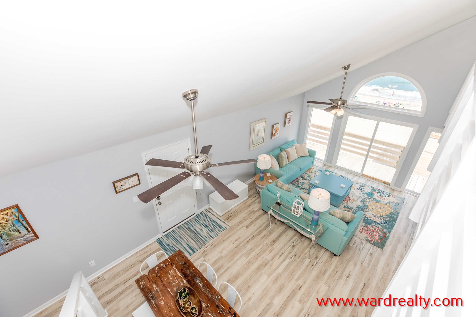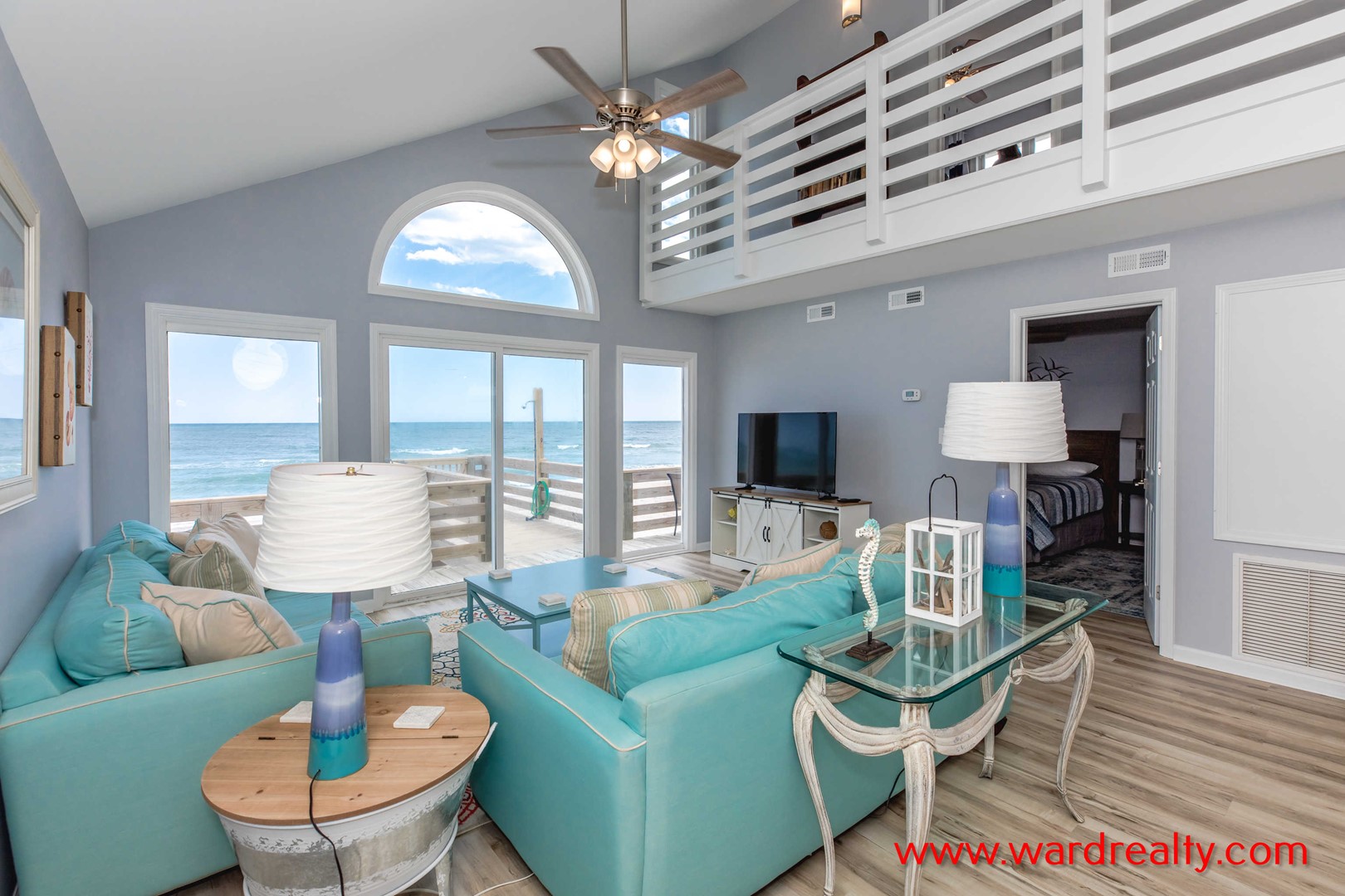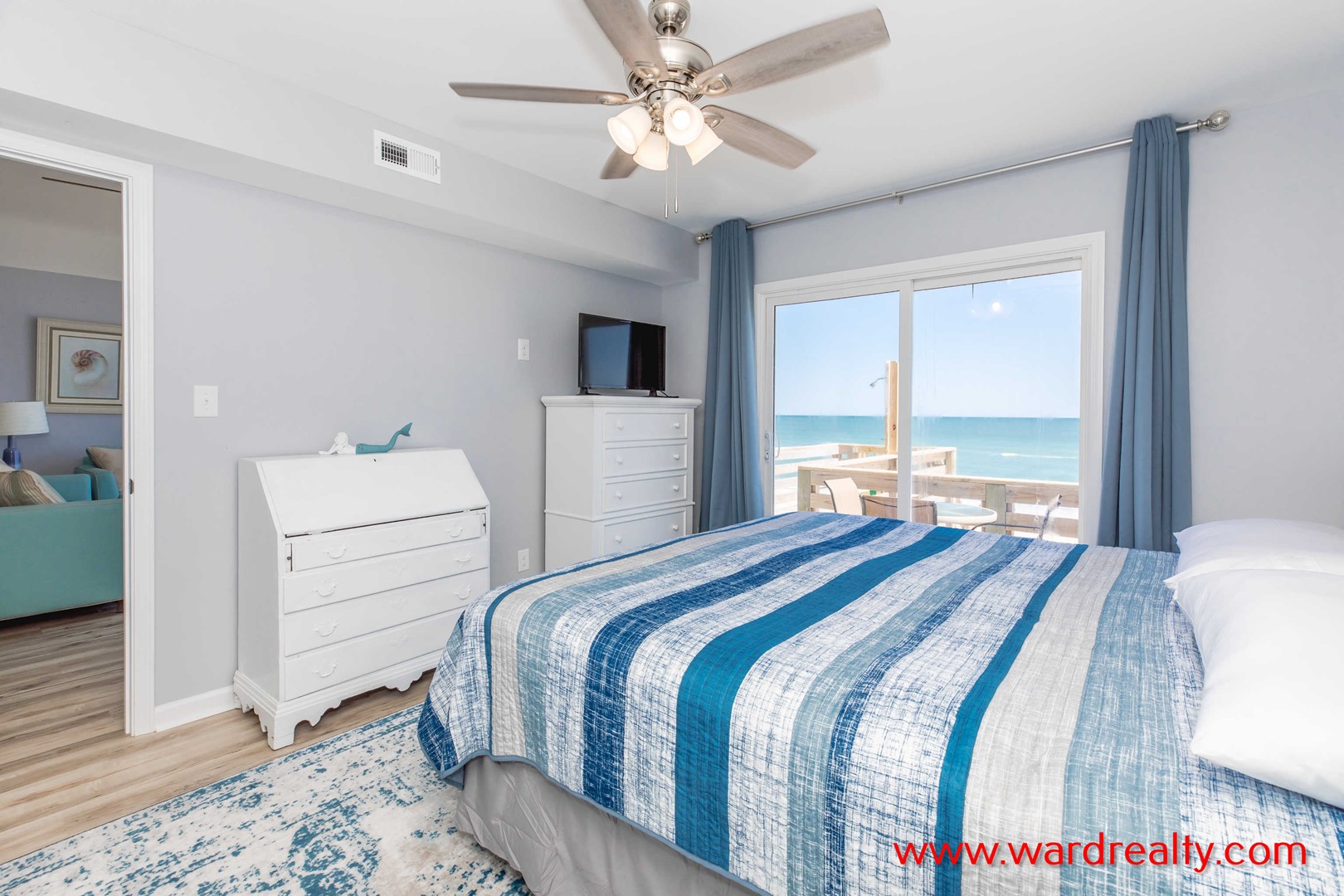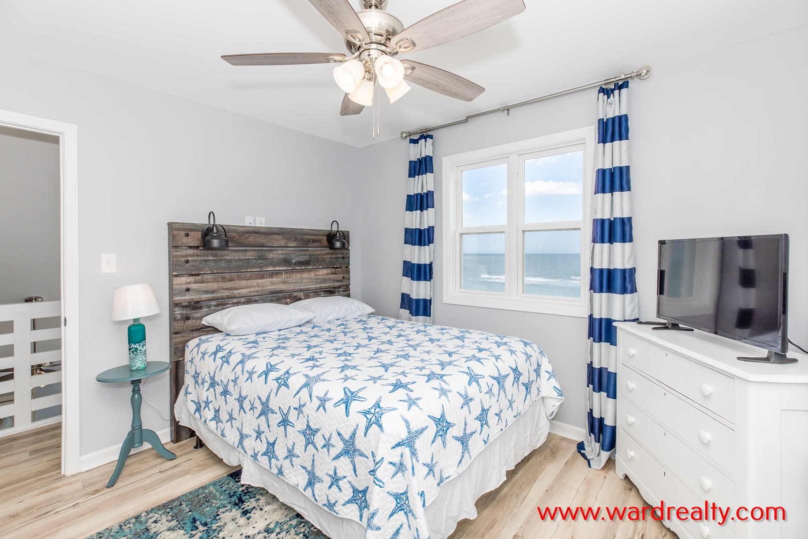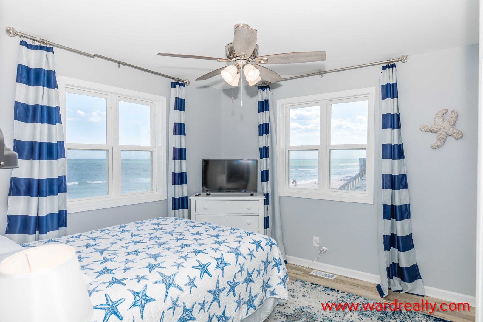 - Top Floor Oceanfront Bedroom: Queen Bed; TV; shares Jack and Jill bathroom with tub/shower