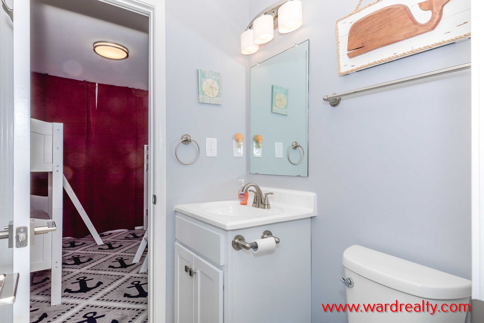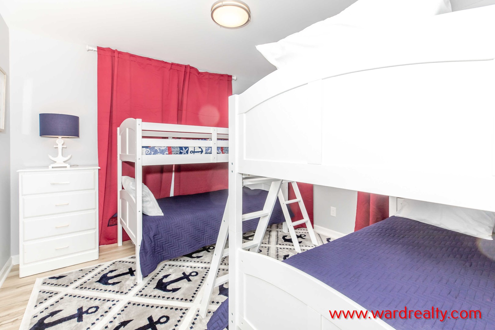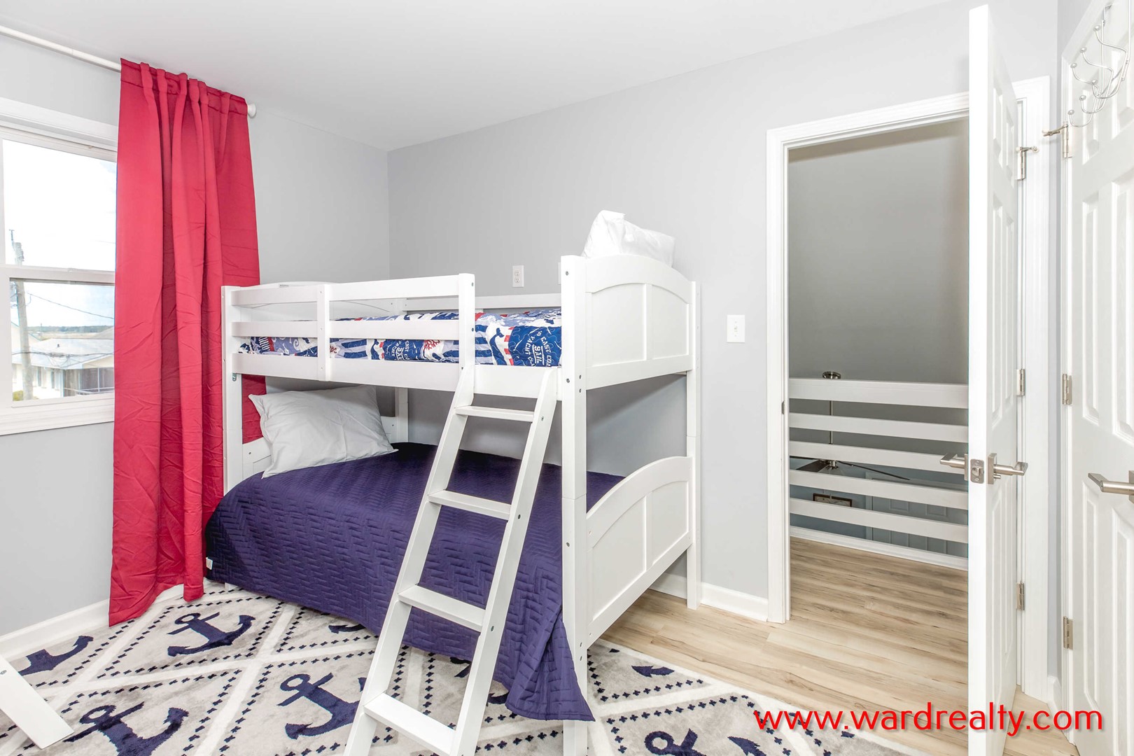 - Top Floor Street-Side Bedroom: Two Twin Bunk Beds; shares Jack and Jill bathroom with tub/shower