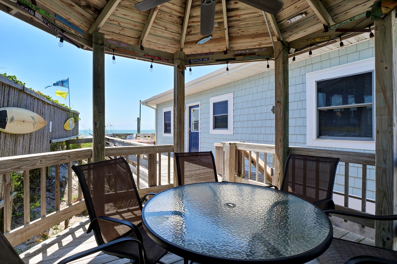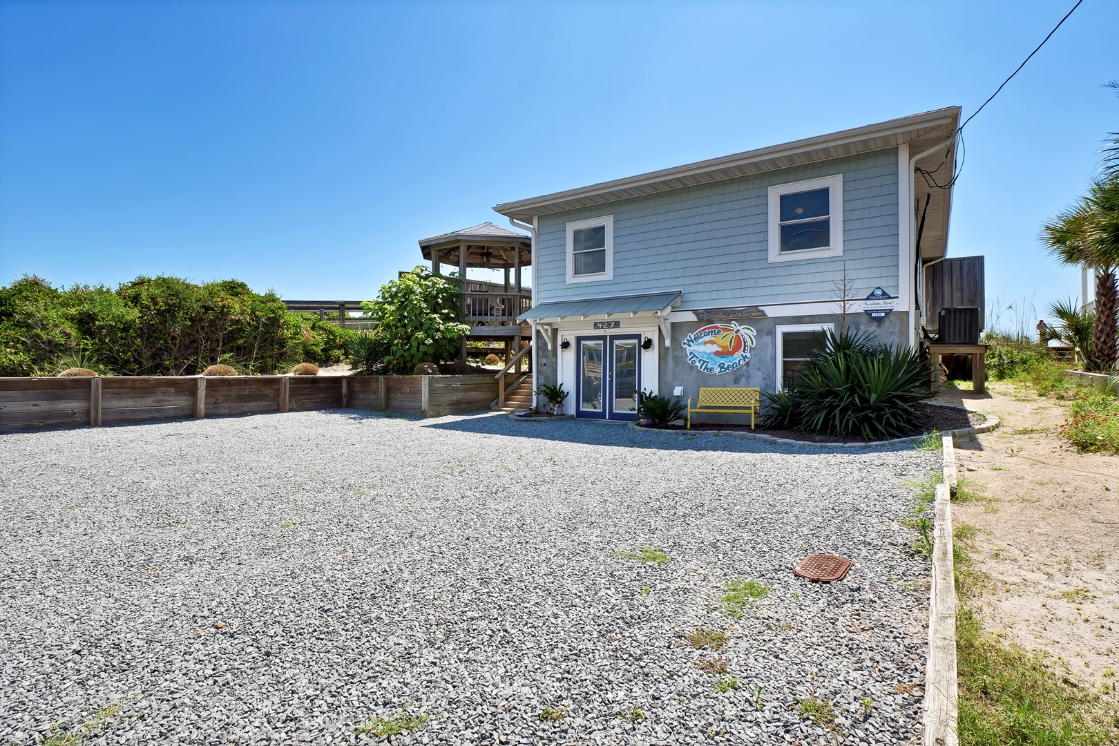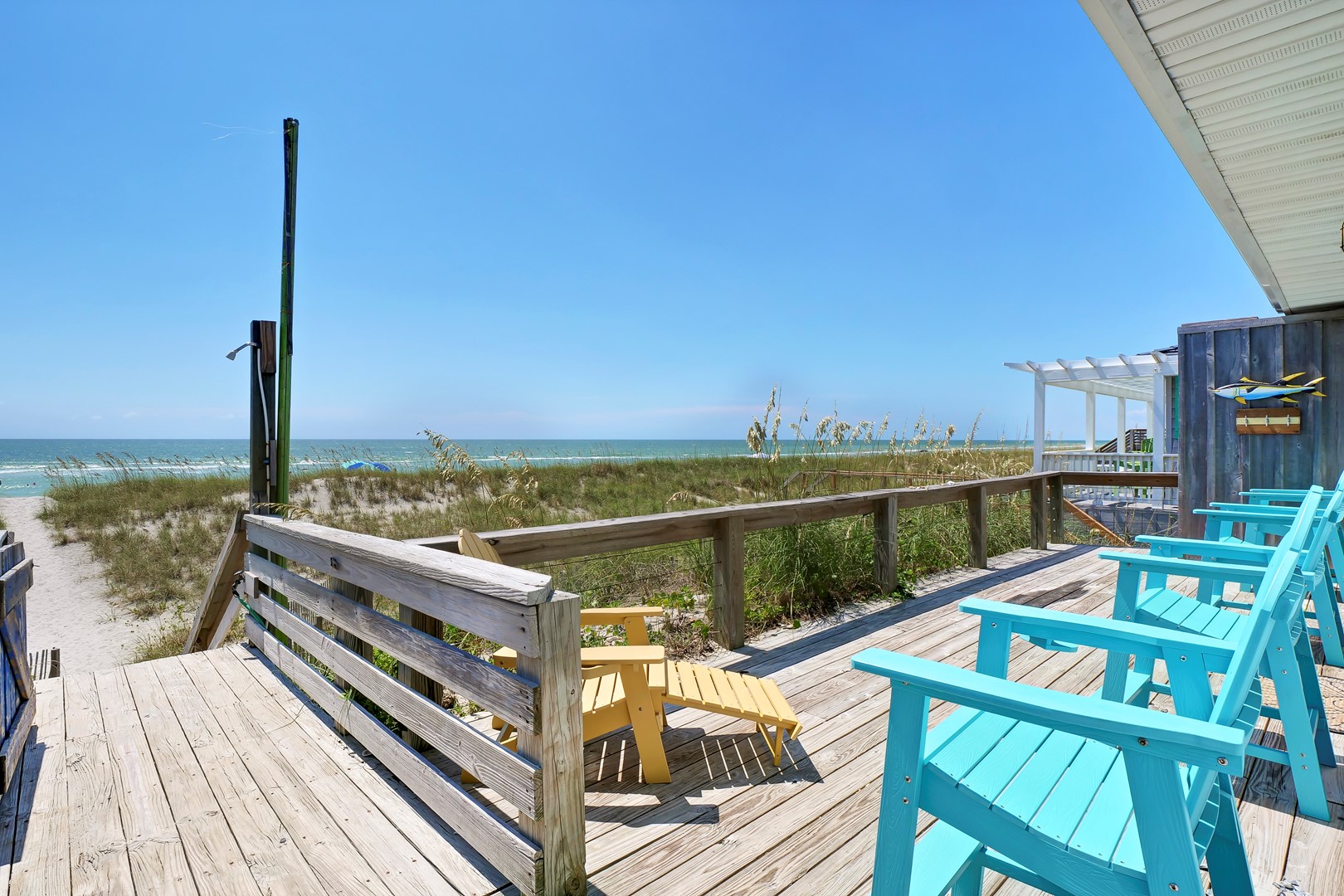 A wide oceanfront sun deck with a north side covered gazebo provides the perfect perch for everyone. With plenty of great deck furniture, you’ll be sure to spend a lot of time relaxing outside and taking it all in. The enclosed outdoor hot/cold shower is located oceanfront and is perfect for washing away the salt and sand at the end of a fun-filled beach day.