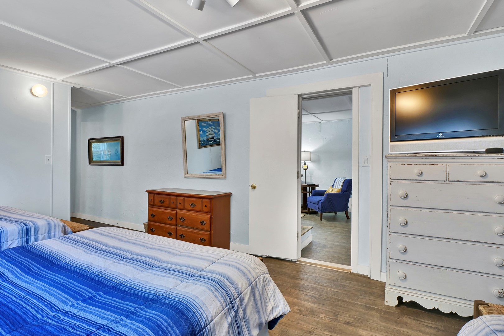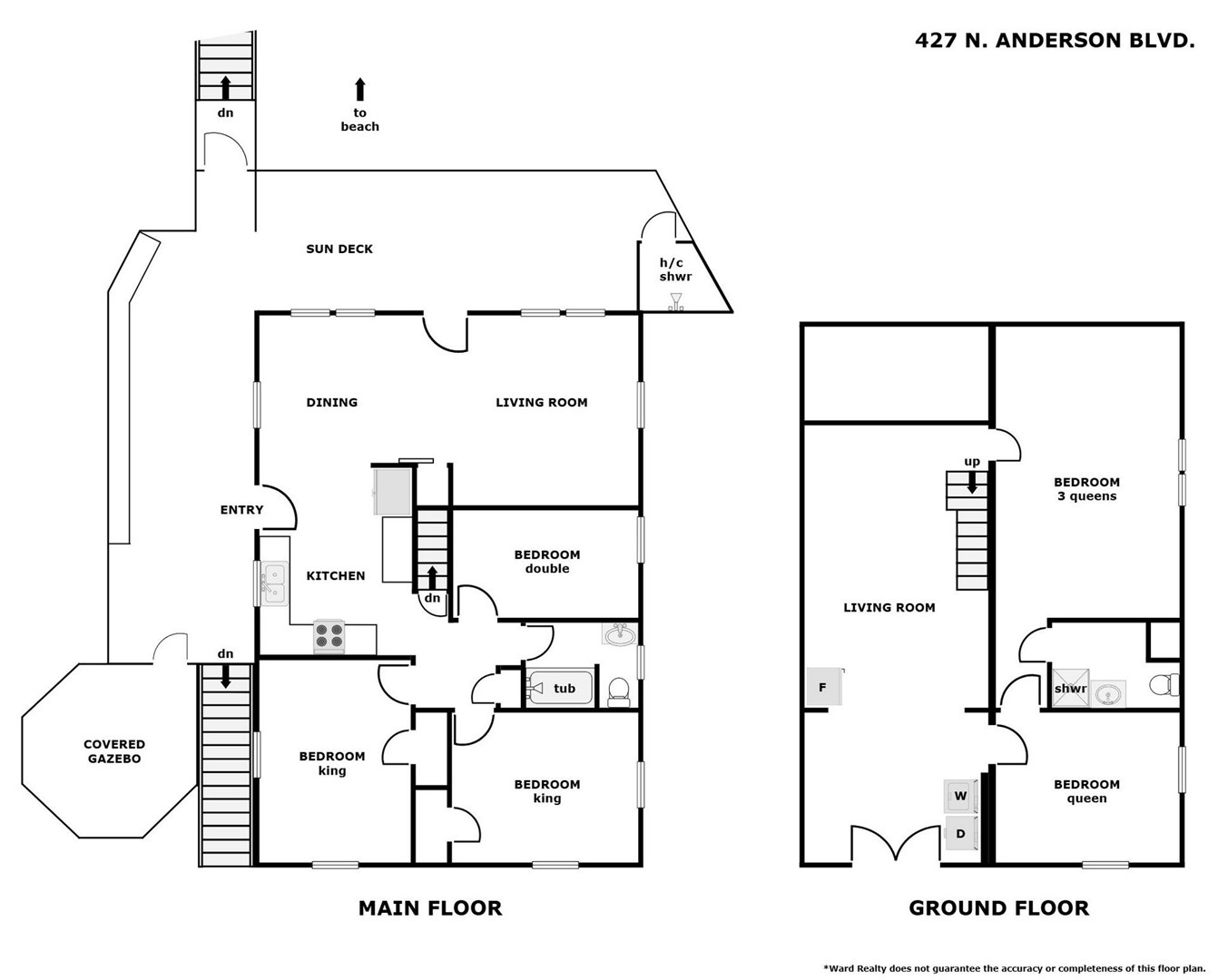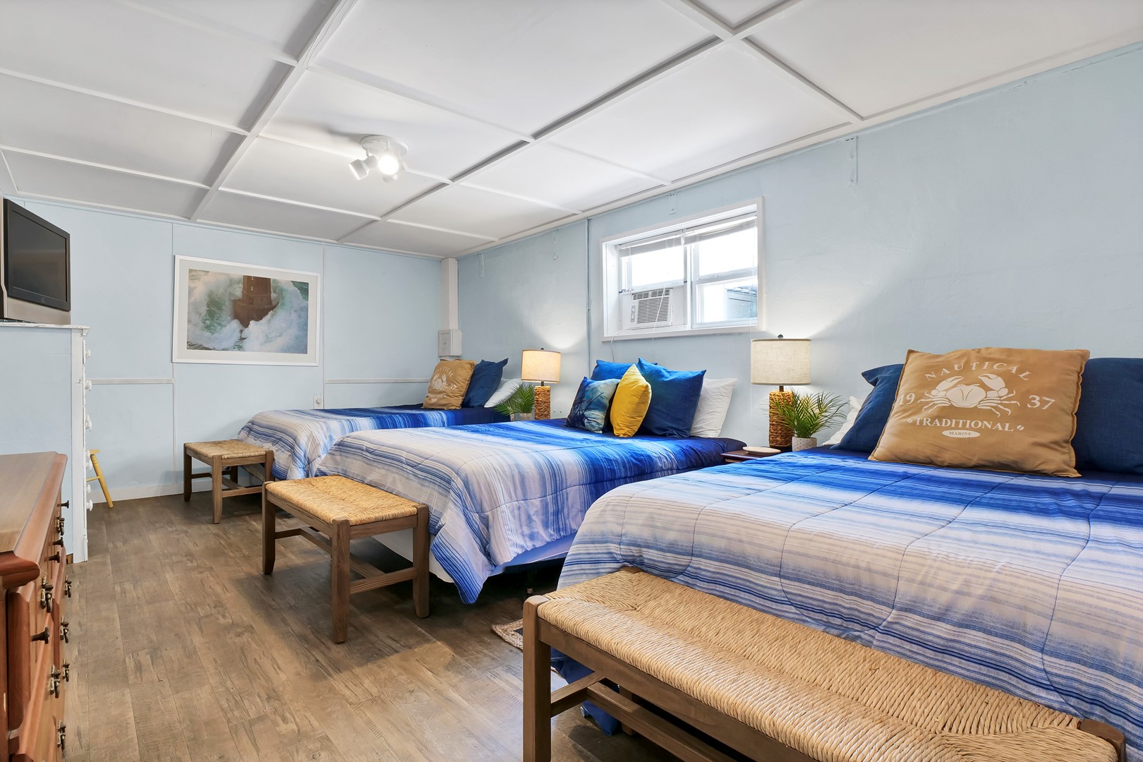 - Back Bedroom: Three Queen Beds; TV; shares hall bathroom with shower