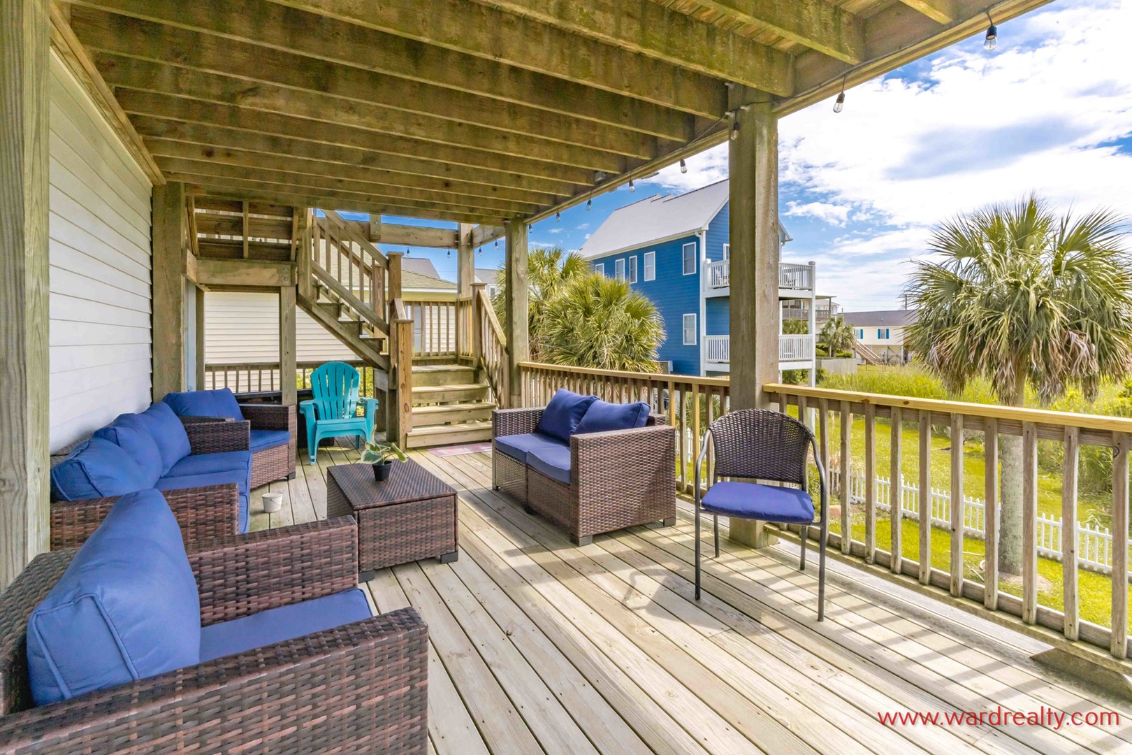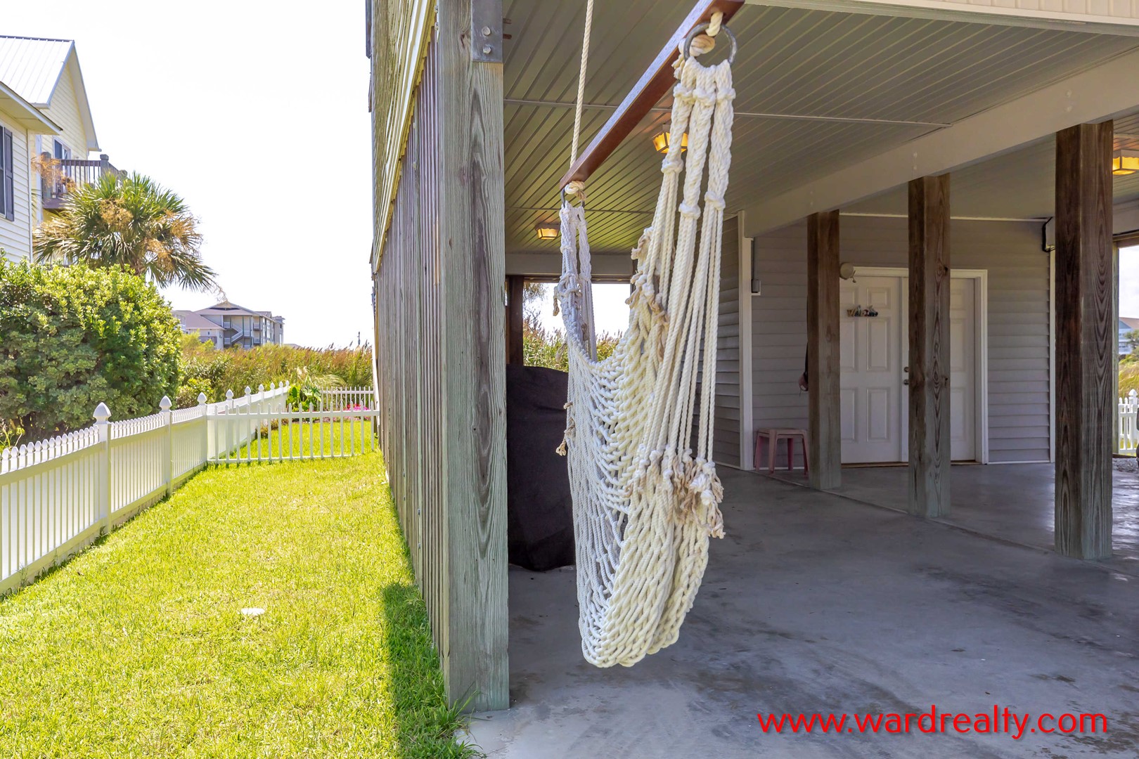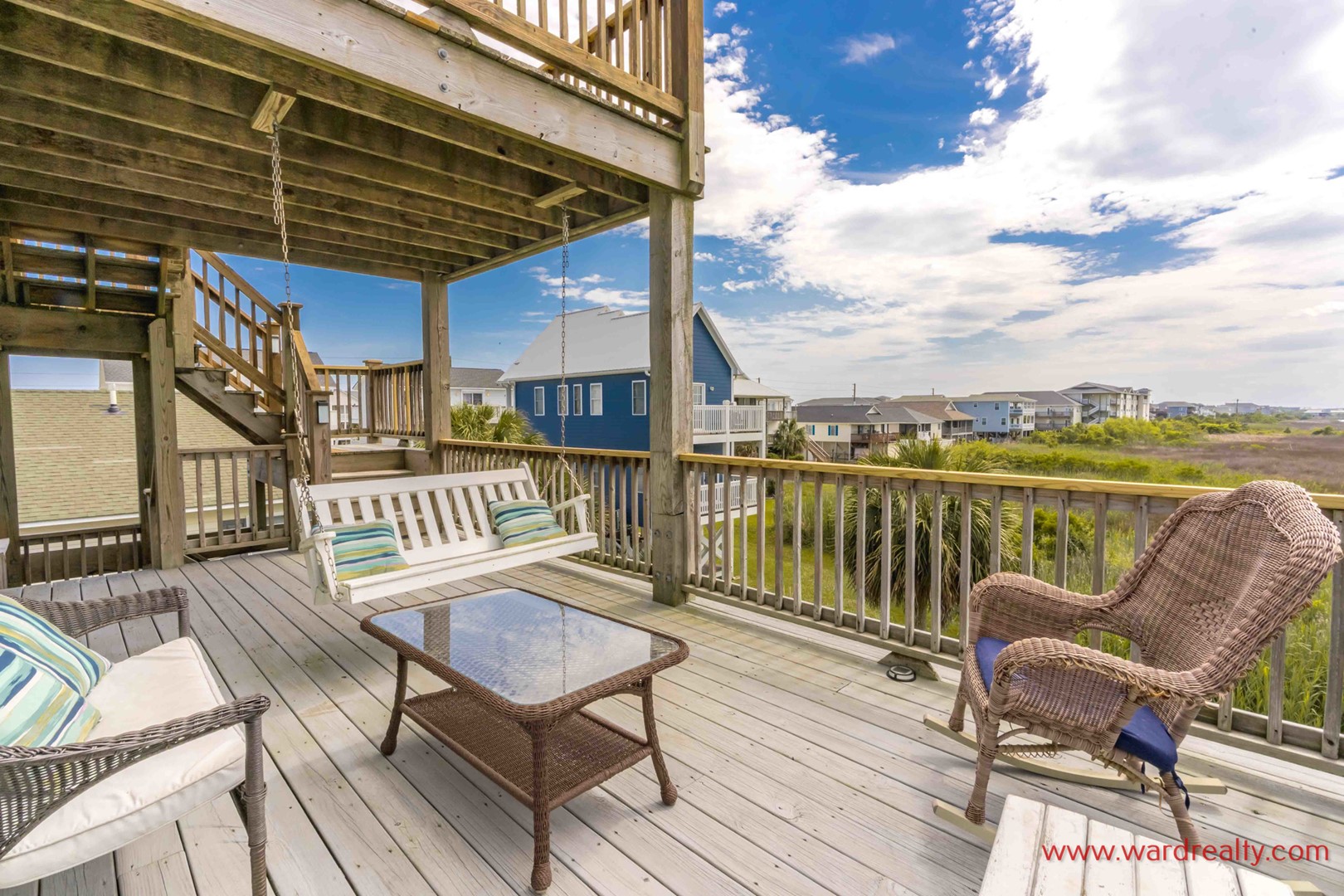 There are plenty of great outdoor spaces to enjoy at this home. The ground level offers covered parking, and a covered patio area, plus an enclosed outdoor shower (hot/cold water).. The first floor has a streetside covered porch and a second covered deck overlooking the beautifully landscaped fenced in back yard, both have wonderful swings and furniture for relaxing. The second floor has a partially covered sundeck with furniture that overlooks the backyard and has a great view of the marsh and ICW. And there is a third level sundeck with amazing views of the ocean and the Intracoastal Waterway! In the backyard you’ll find a lovely, shaded seating area.