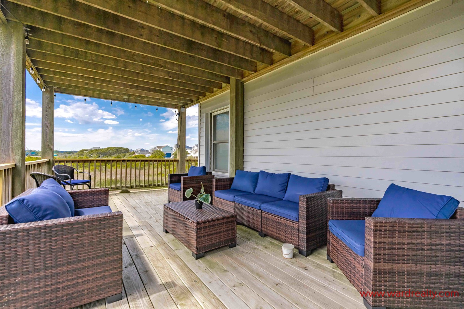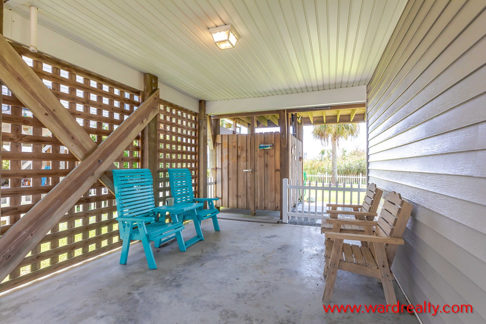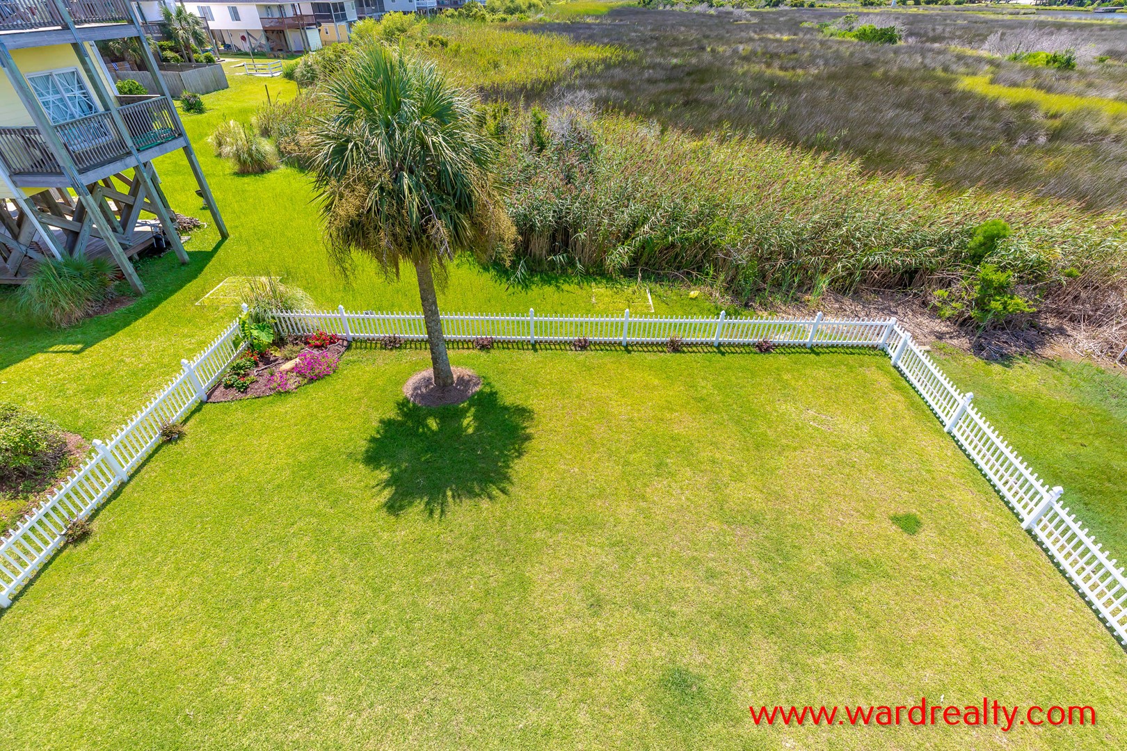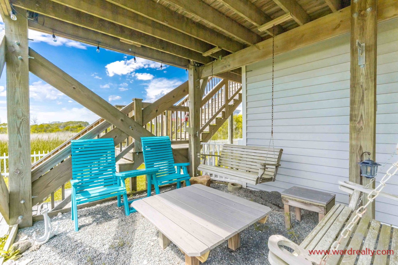 There are plenty of great outdoor spaces to enjoy at this home. The ground level offers covered parking, and a covered patio area, plus an enclosed outdoor shower (hot/cold water).. The first floor has a streetside covered porch and a second covered deck overlooking the beautifully landscaped fenced in back yard, both have wonderful swings and furniture for relaxing. The second floor has a partially covered sundeck with furniture that overlooks the backyard and has a great view of the marsh and ICW. And there is a third level sundeck with amazing views of the ocean and the Intracoastal Waterway! In the backyard you’ll find a lovely, shaded seating area.