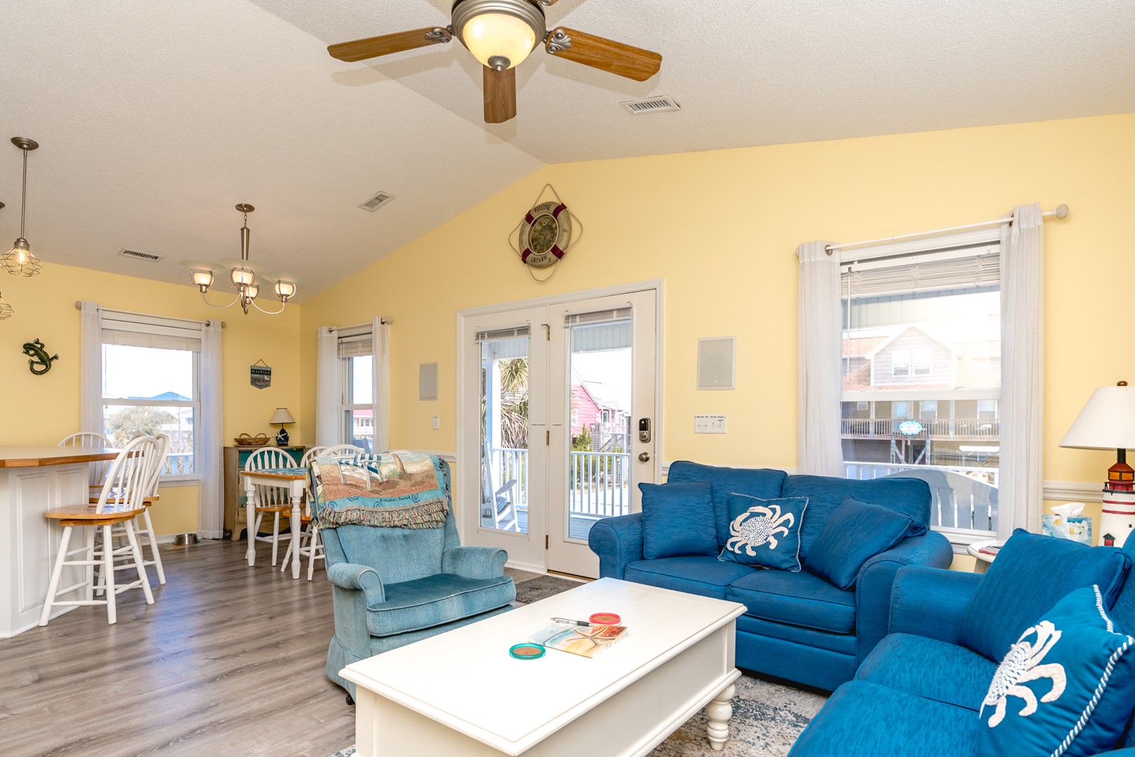 The open concept living room, dining area and kitchen make it easy to stay connected while making meals or watching movies. The dining table seats 4, plus there is room for 4 more at the kitchen counter.