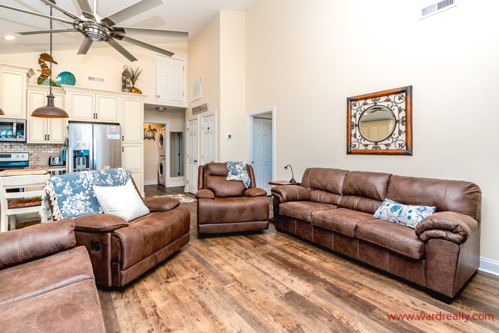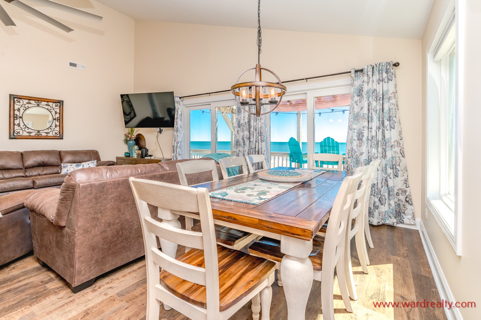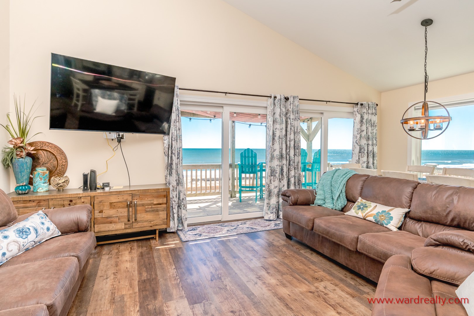 With easy one story living and convenient oceanfront access and views, this home is perfect for those in search of rest and relaxation! The sun filled living area has vaulted 15-foot ceilings in the comfortable living room and you’ll enjoy a movie on the 65" HDTV (with 4k display on full articulating wall mount allowing direction to any location across the room) or just enjoy catching up with family. The dining table seats 8 and the modern kitchen contains a nice pub table with seating for 4 just five feet away. The family will enjoy preparing and sharing meals together as you gaze out at the ocean from a large south facing window.