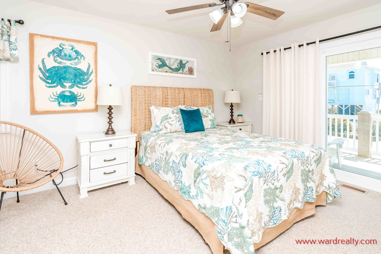 - Queen Bedroom: First Floor; TV; full private bath (tub/shower) and access to ocean view covered wraparound deck
