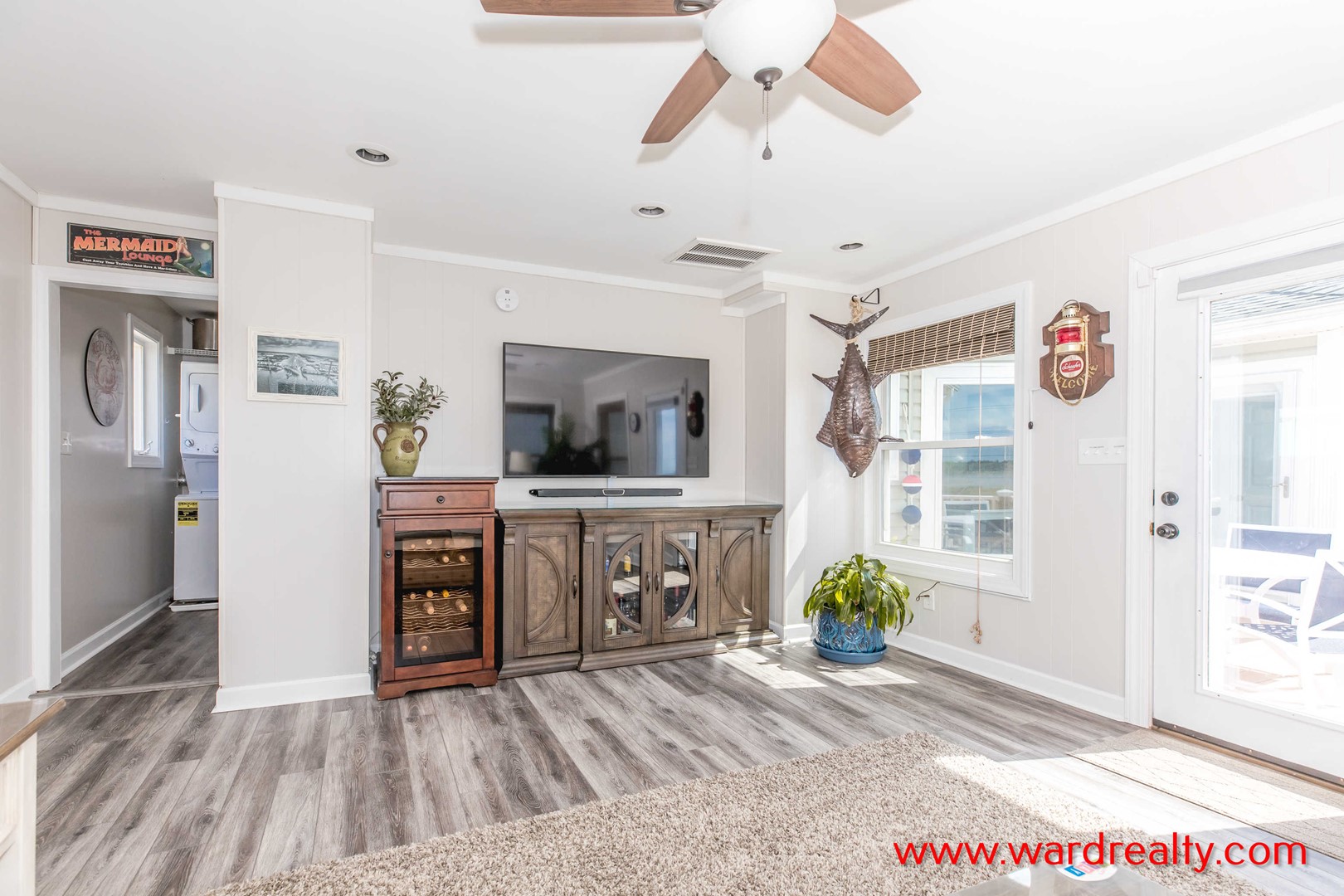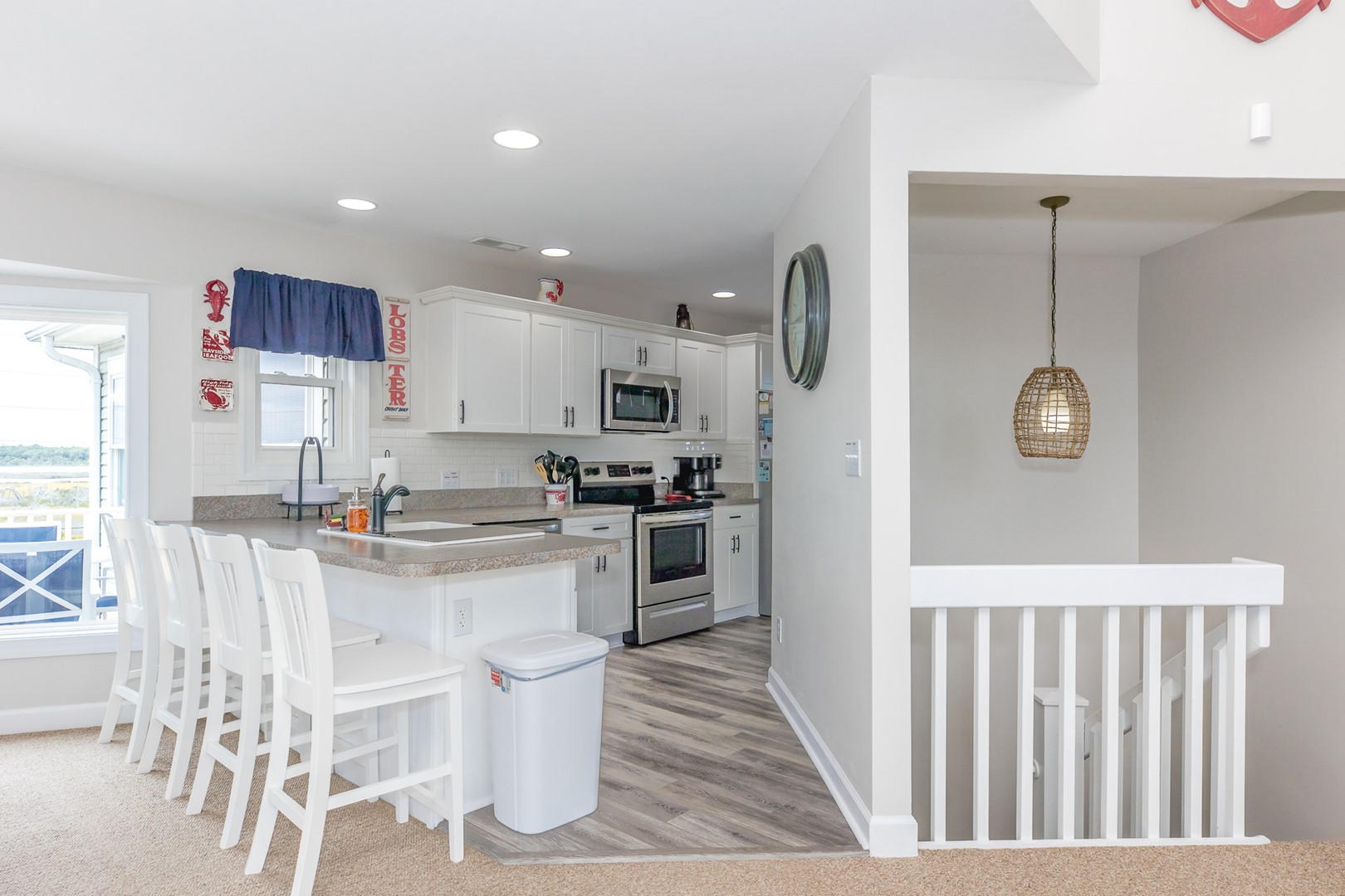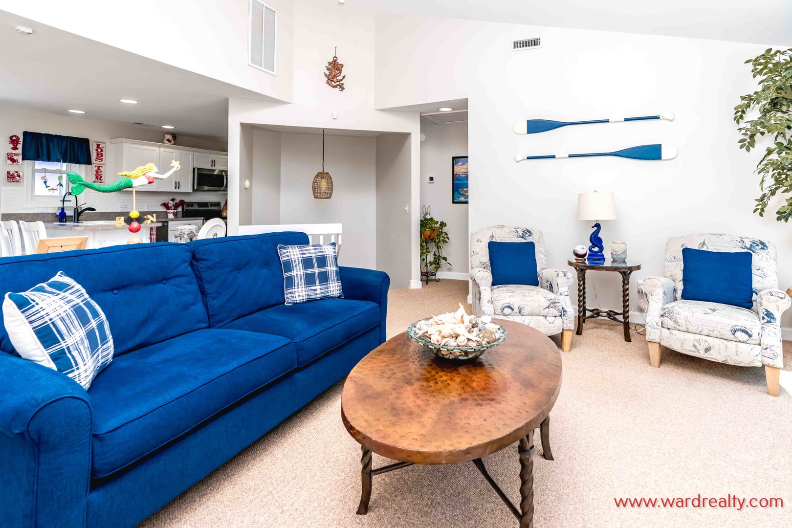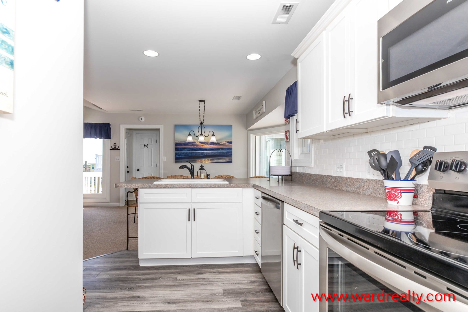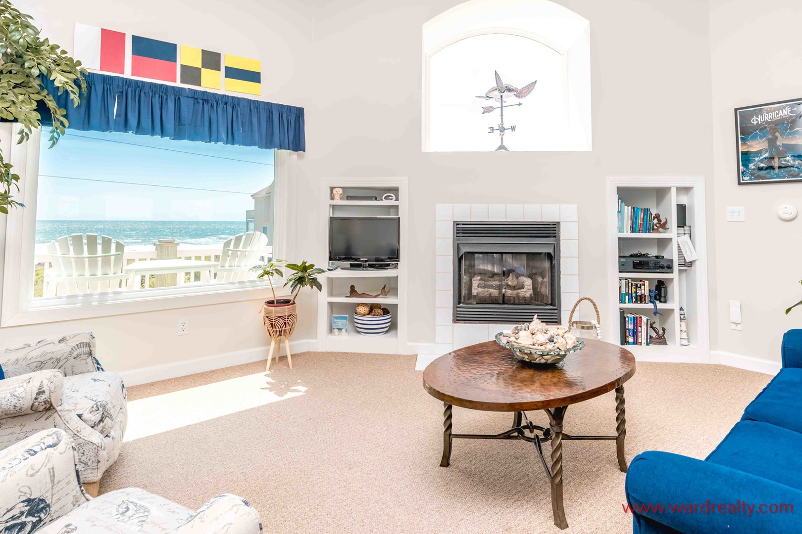 The beach access is directly across the street. The open layout of this cheerful and fresh reverse floorplan home puts all the living space on the 2nd floor, maximizing views of the ocean and sound from the spacious living room with cathedral ceiling, and unobstructed ocean views.