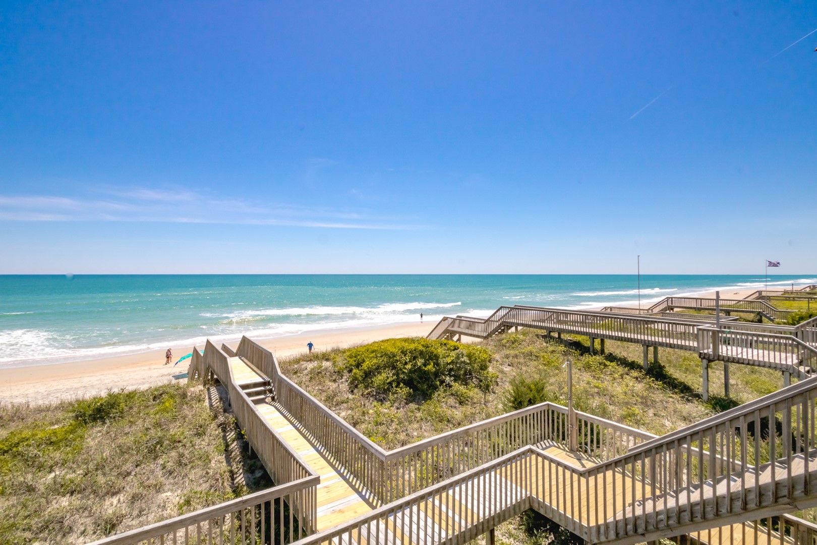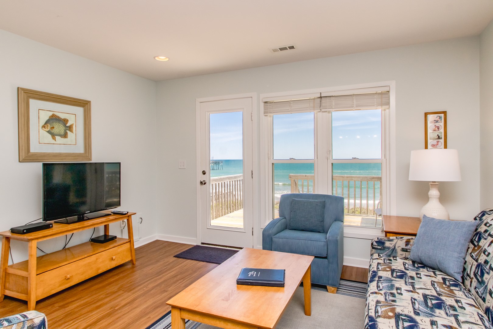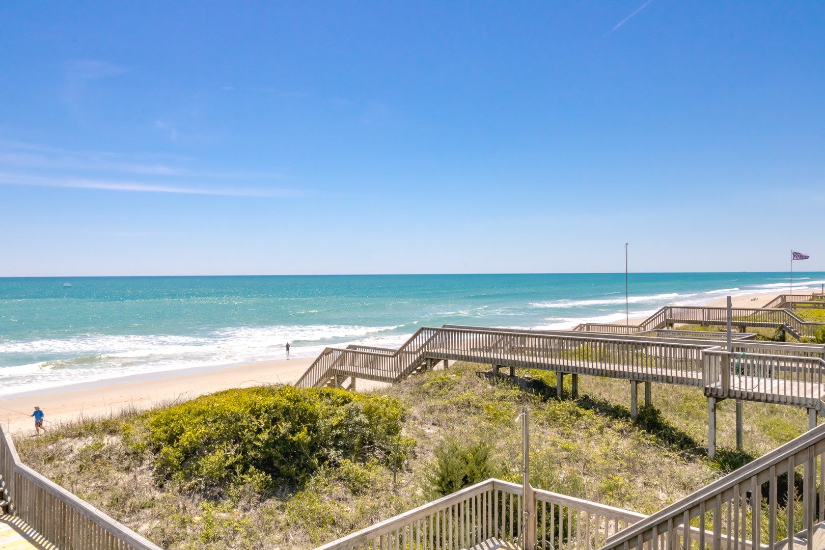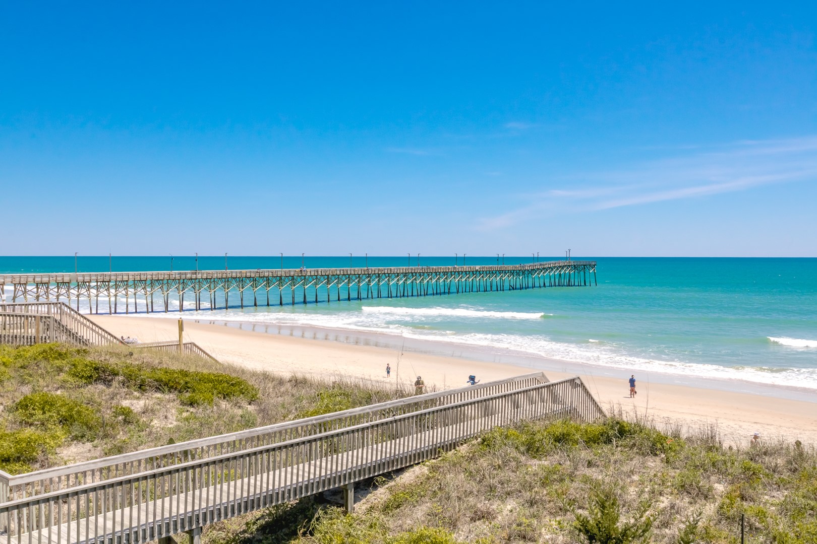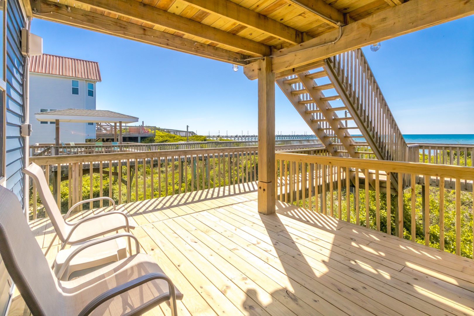 Enjoy the ocean breezes on the top floor sun deck of this wonderful north side of an oceanfront duplex. After a relaxing day on the beach, take in the views of the ocean and the Surf City Pier.