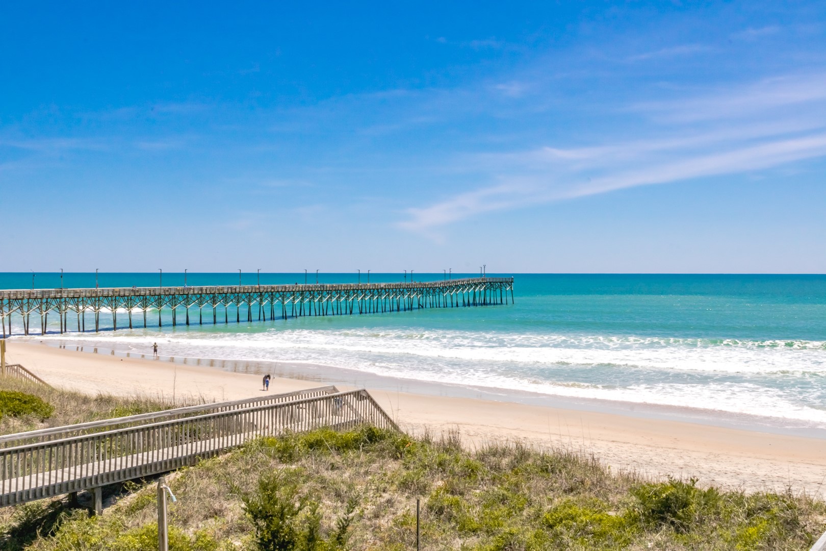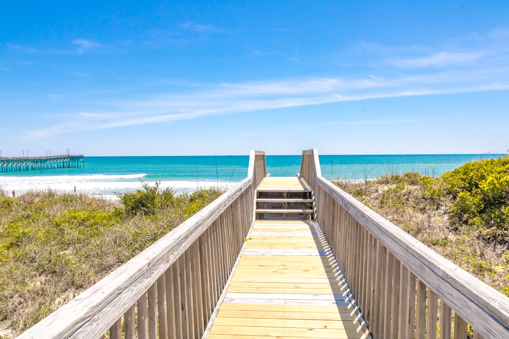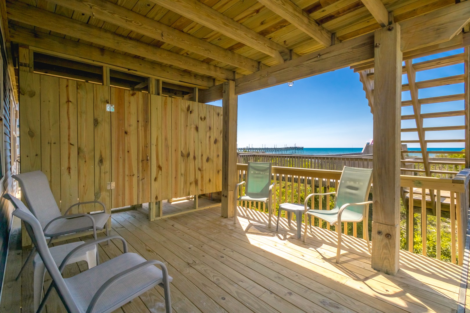 Enjoy the ocean breezes on the top floor sun deck of this wonderful south side of an oceanfront duplex. After a relaxing day on the beach, take in the views of the ocean and the Surf City Pier.