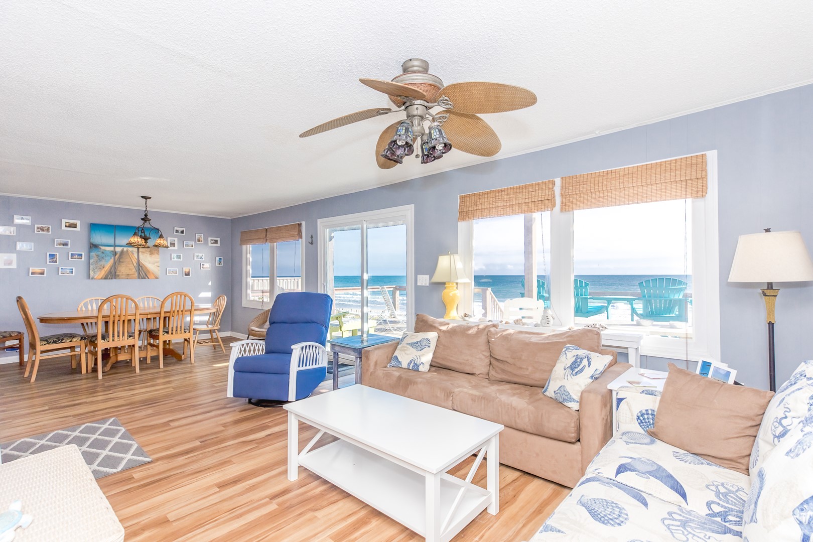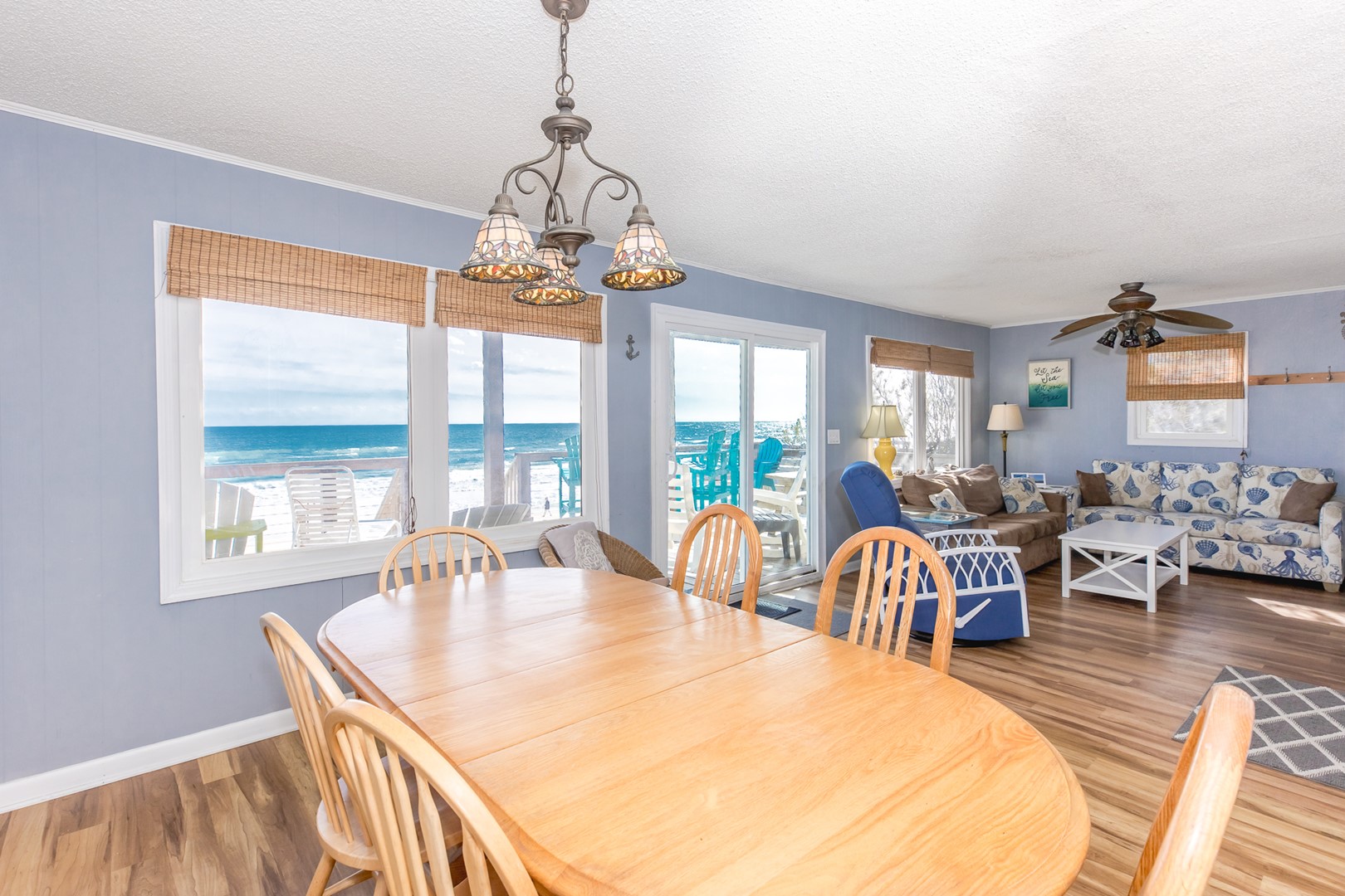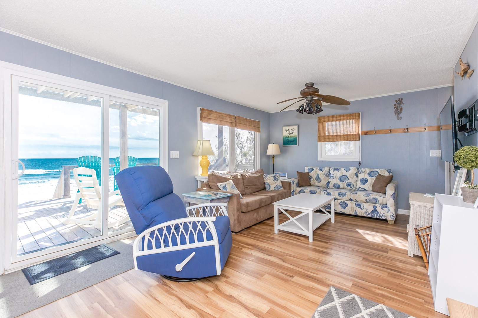 This 3 bedroom, 2 bath (plus additional bunk room) beach house easily accommodates vacation seekers of all kinds. There's even a large oceanfront deck to allow for even more oceanside lounging and relaxation. You will never be more than a few steps away from the sea as the property has private beach access and boasts an exterior hot/cold shower to clean off from a day in the surf sand.